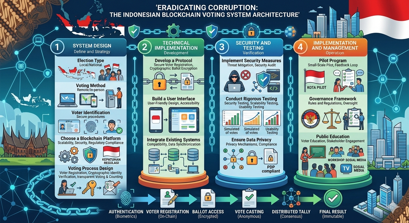 | mpu.gandring [Posts] 3:18:36 pm Merancang sistem voting blockchain Indonesia mencakup penentuan skala, pemilihan blockchain konsorsium yang aman dan cepat, serta verifikasi kriptografi agar suara unik, anonim, dan tak dapat diubah |