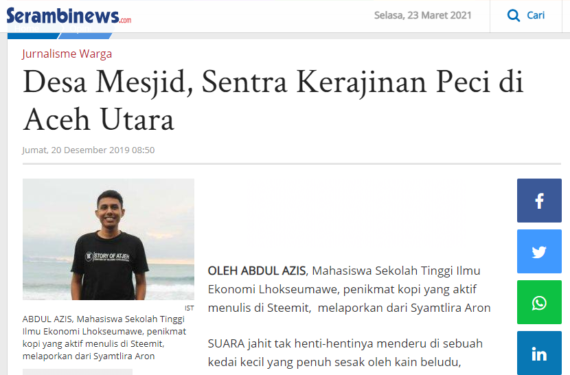 Dan pada akhirnya, desember 2019 untuk pertama kalinya saya memberanikan diri mengirim tulisan saya ke media masa, serambi Indonesia (serambinews.com). koran lokal di aceh. dan alhamdulillah tulisan atau reportase berjudul “Desa masjid, sentra produksi peci di Aceh Utara” berhasil lolos dan tayang pada hari juma’t.