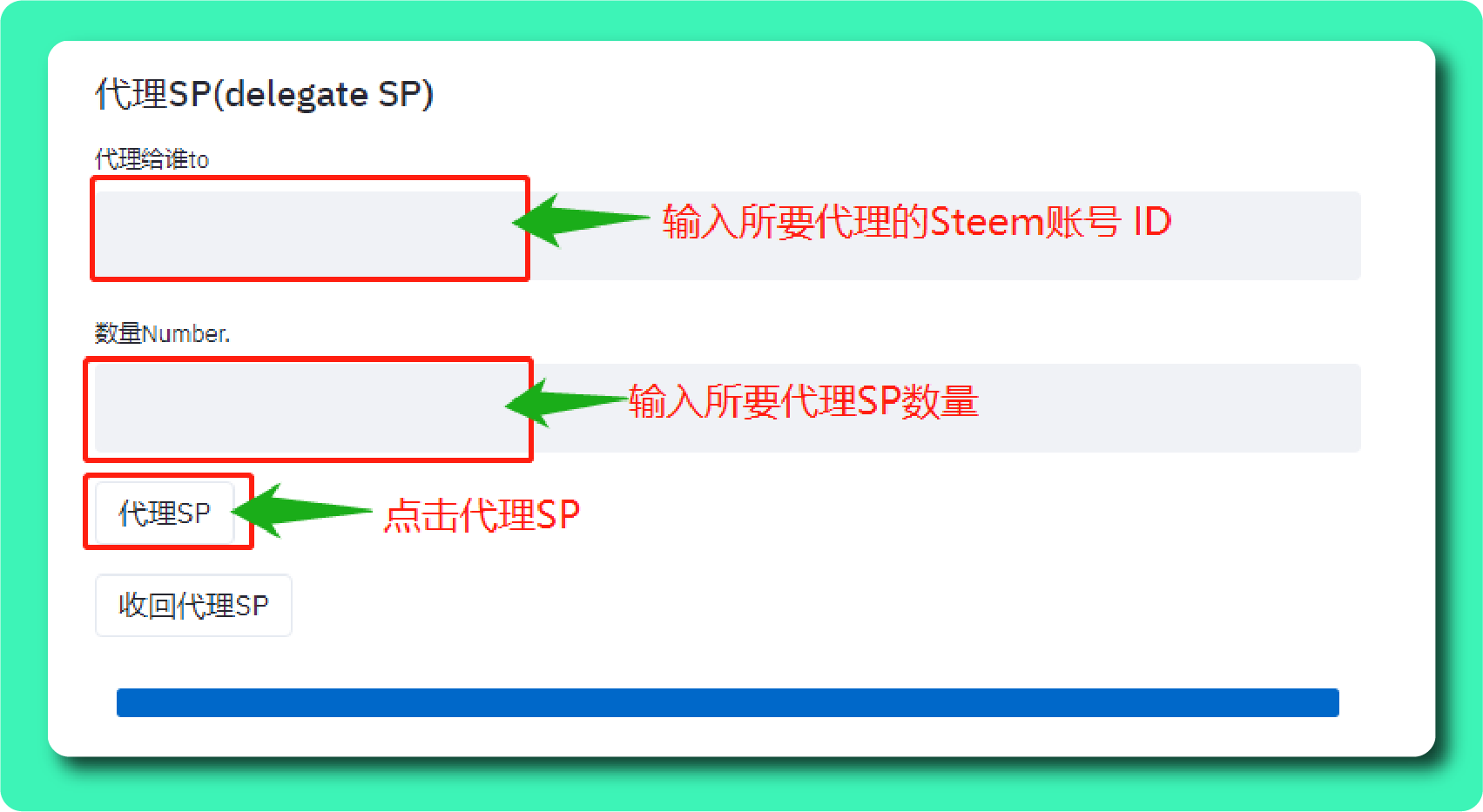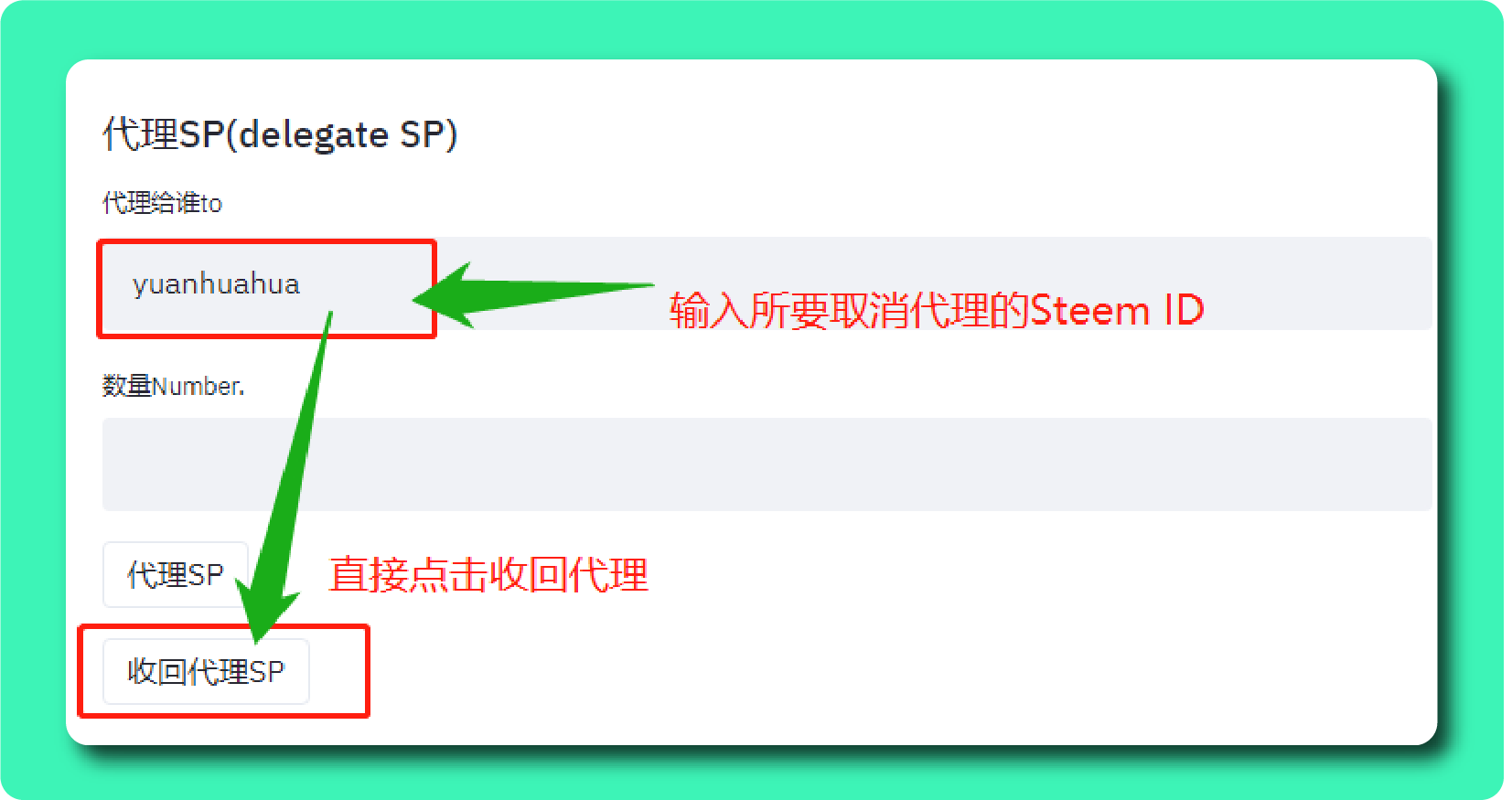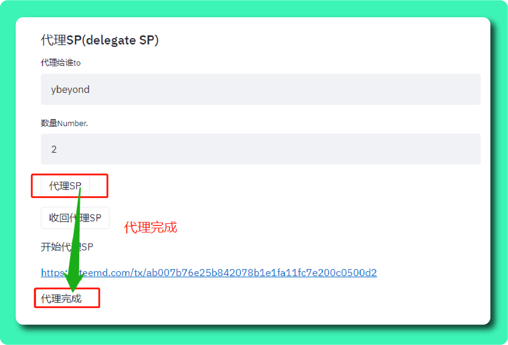 - 例如我要代理给我的Steem小号,Steem ID为「ybeyond」,那么在「代理给谁」栏中输入ybeyond,我要代理的数量为100SP,那么在「数量Number」中输入「100」。