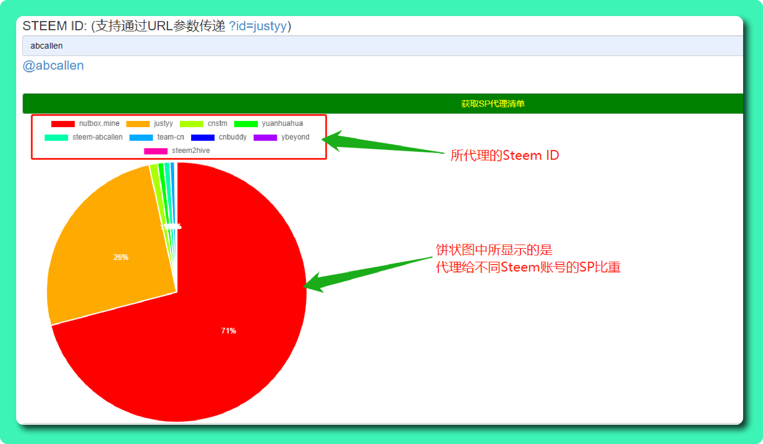- 「饼状图」所显示的为代理给不同Steem账号的SP比重以及所代理的Steem ID。