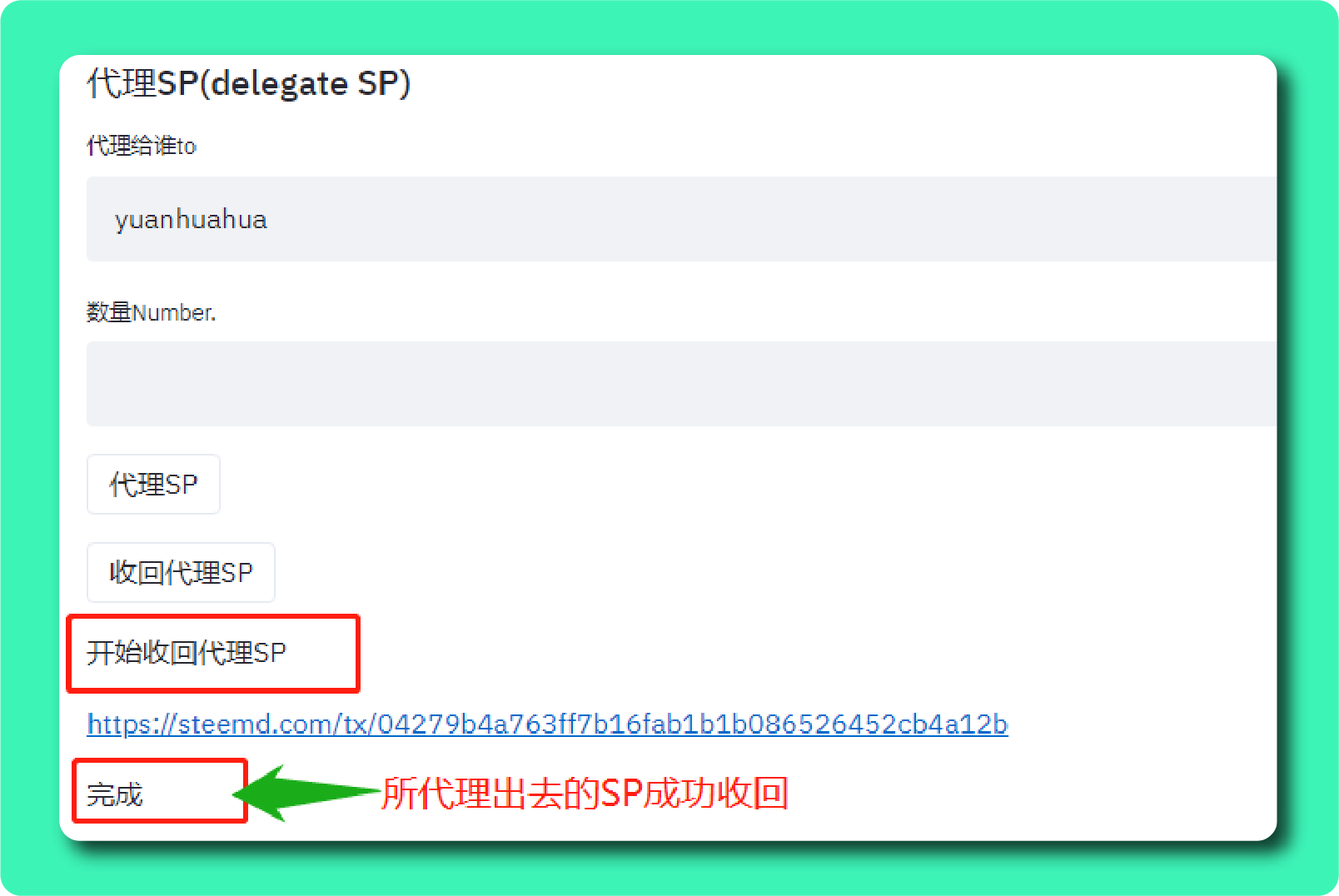 - 点击「收回代理SP」后会显示「开始收回代理SP」,随后会放气球,最后会显示「完成」,这个时候所代理出去的SP就成功收回了。
