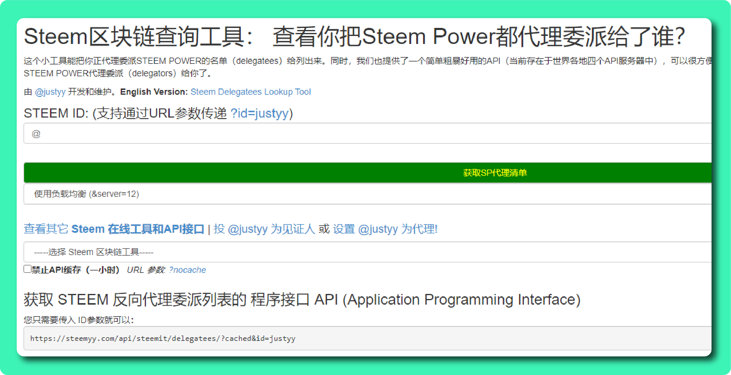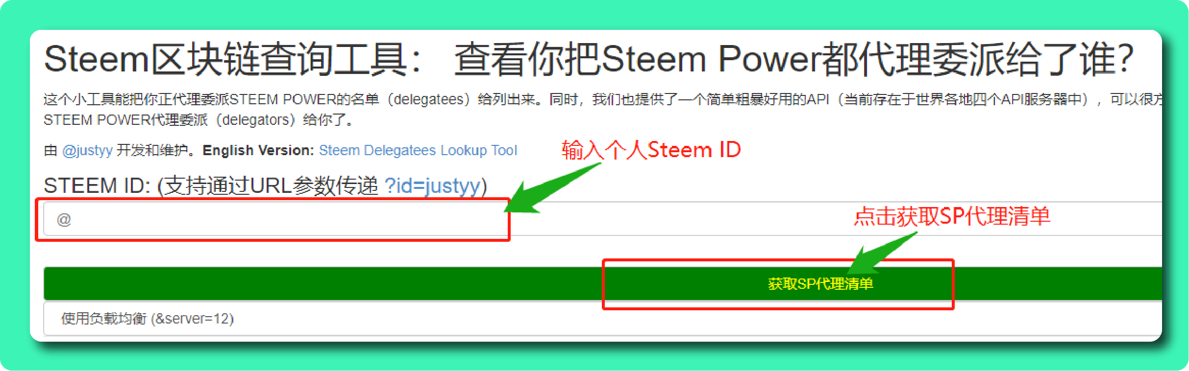 - 在Steem区块链查询工具 网站下方的「STEEM ID」栏中输入「个人Steem ID」,接着点击「获取SP代理清单」。