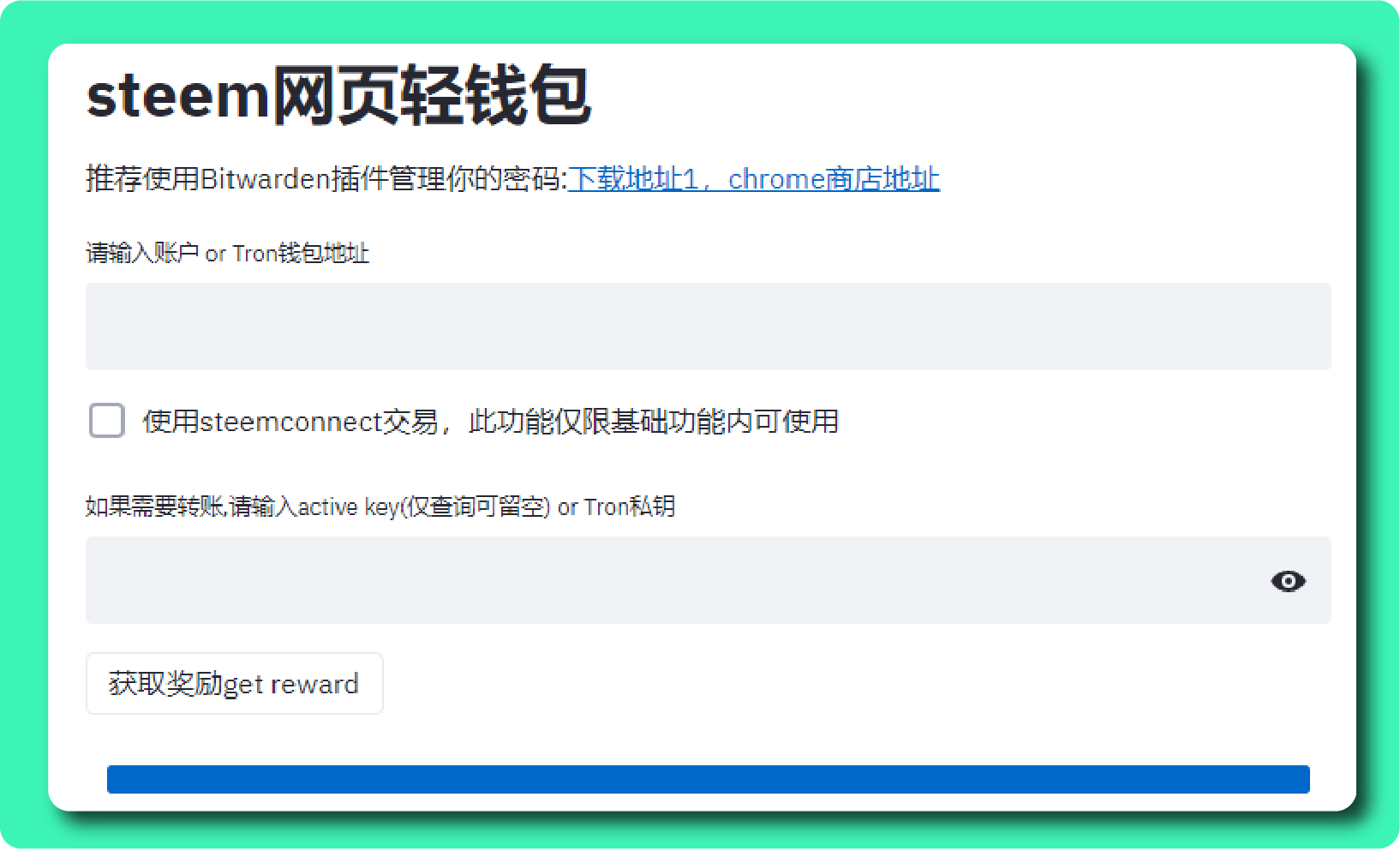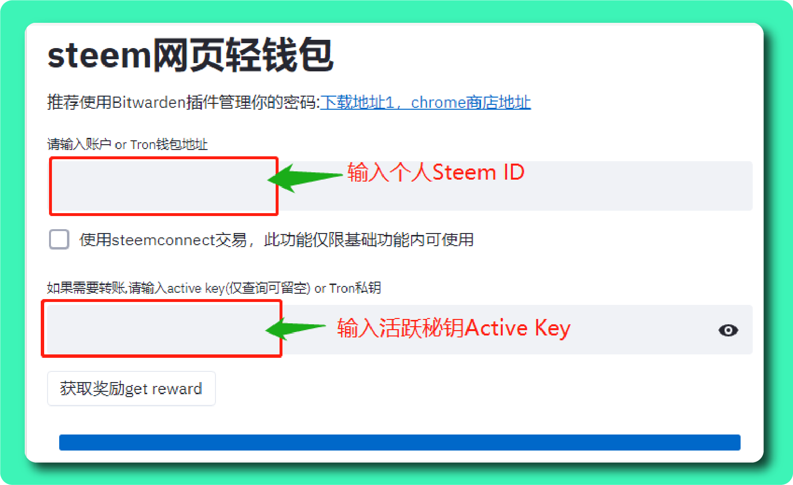 - 在Steem网页轻钱包 下方的「请输入账户 or Tron钱包地址」栏中输入「个人Steem ID」,在「如果需要转账,请输入active key」栏中输入「活跃秘钥Active Key」。