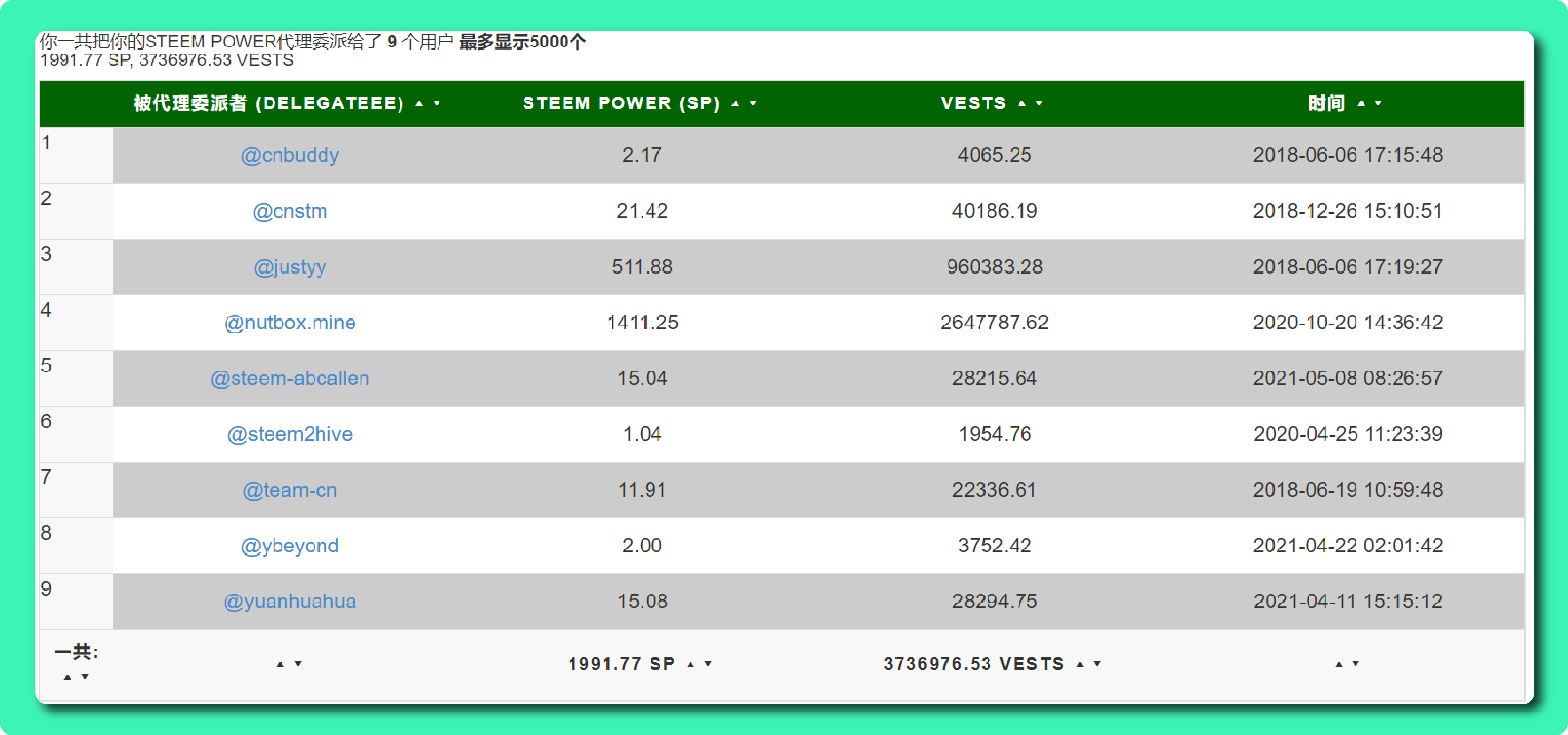 - 「表格」所显示的为 所代理的Steem ID/代理的SP数量/代理时间/