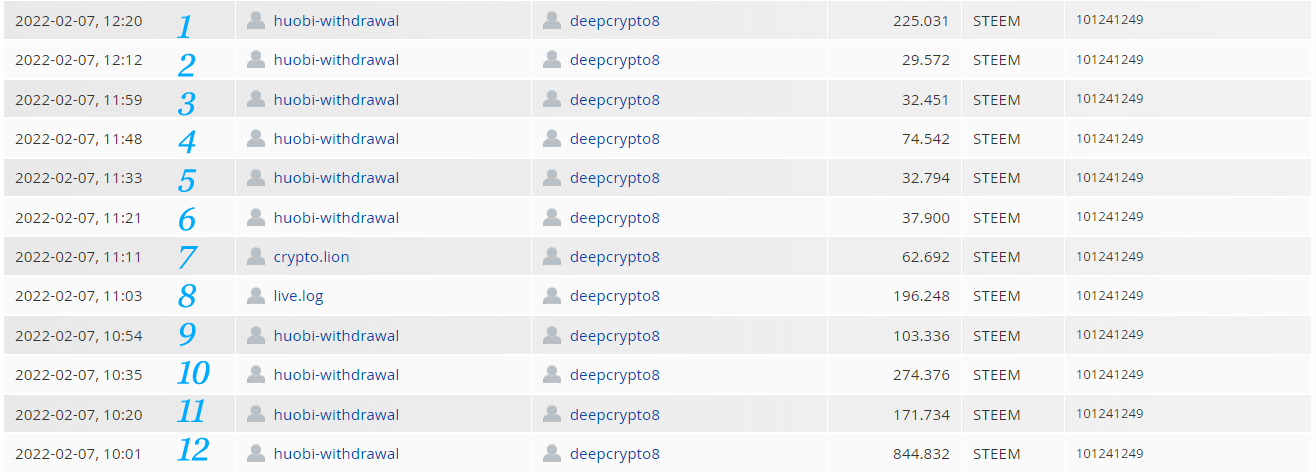 Transfers to deepcrypto8, wallet address 101241249 on 7th February - This date chosen as it is the largest cluster of transactions to this address in a single burst.