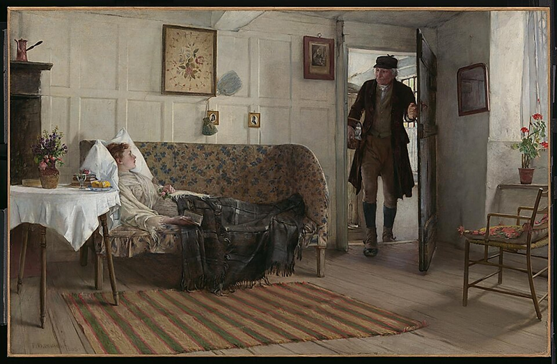 —Ah, no hacía falta, ya yo sé por qué estaba soñando con el abuelo, -respondió Carmencita que se levantó en ese instante de la cama y caminó hacia el otro lado de la habitación- mientras su madre estaba a punto de soltar el llanto-. Es que anoche me quedé viendo ese cuadro que está aquí en la pared. Mira, el abuelo estaba vestido igualito a ese señor y la habitación era la misma.