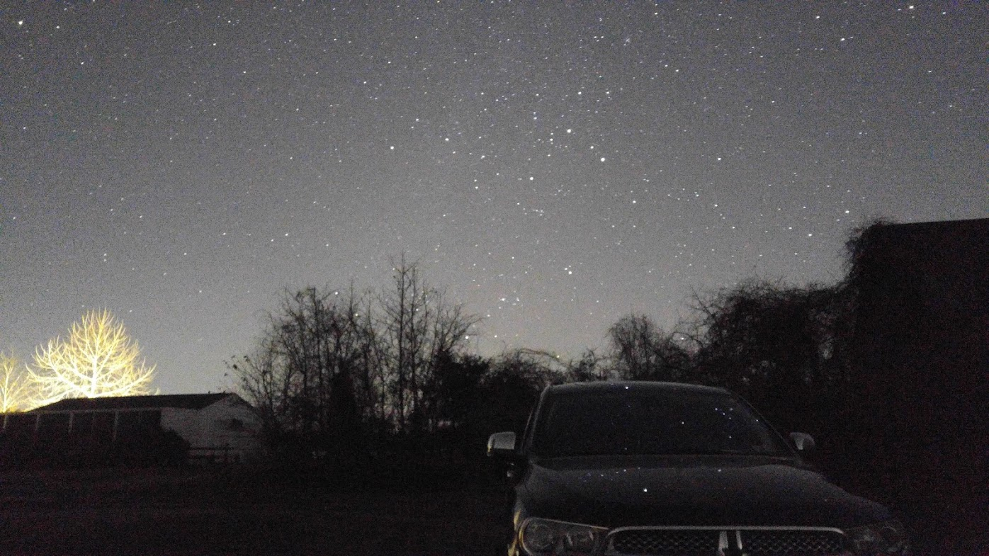 Photo by me: Nikon Coolpix B500; ISO 125; 25 second exposure; The red and white streaks behind the trees are cars or trucks driving past on the highway; March 20, 2019