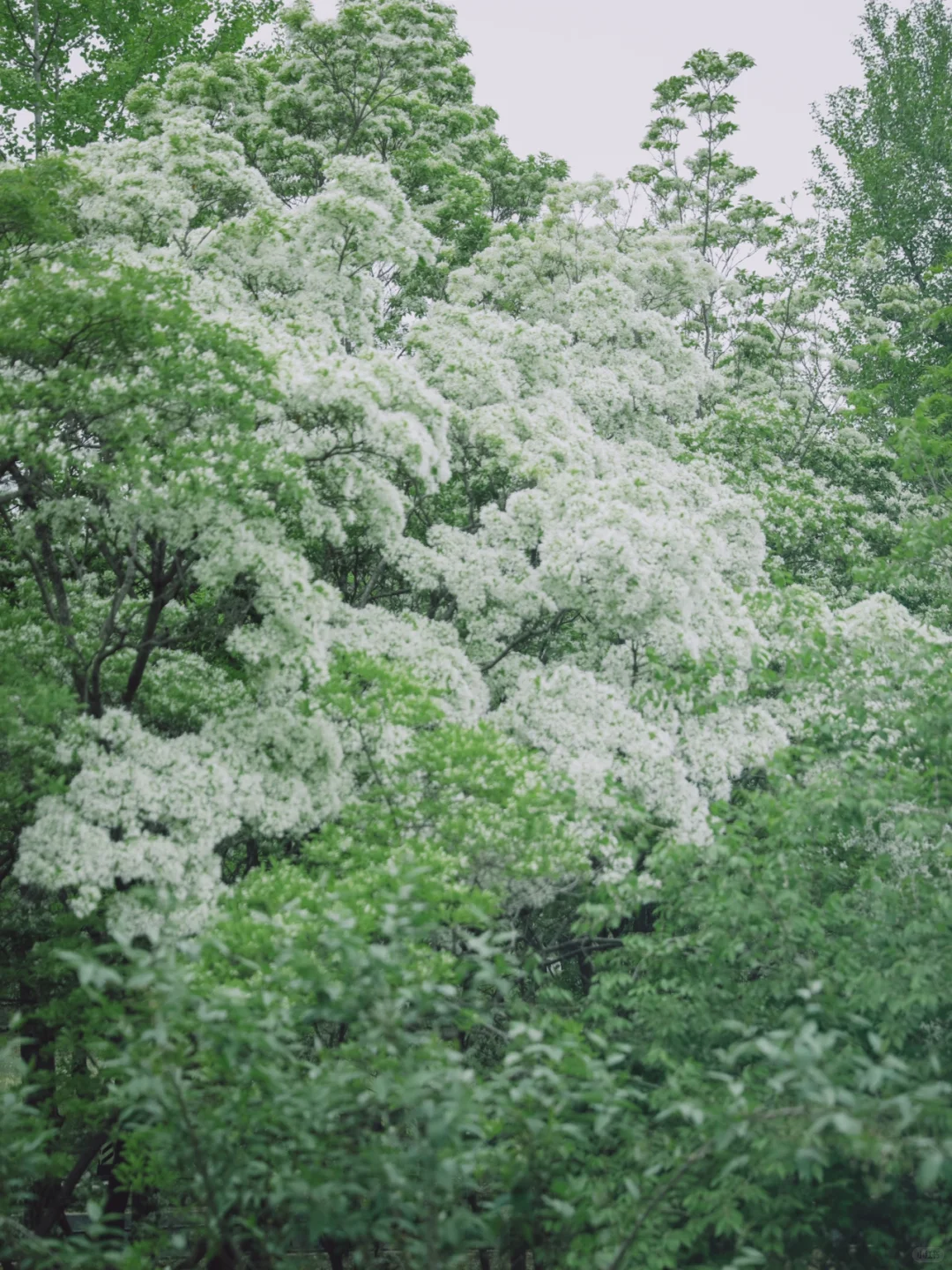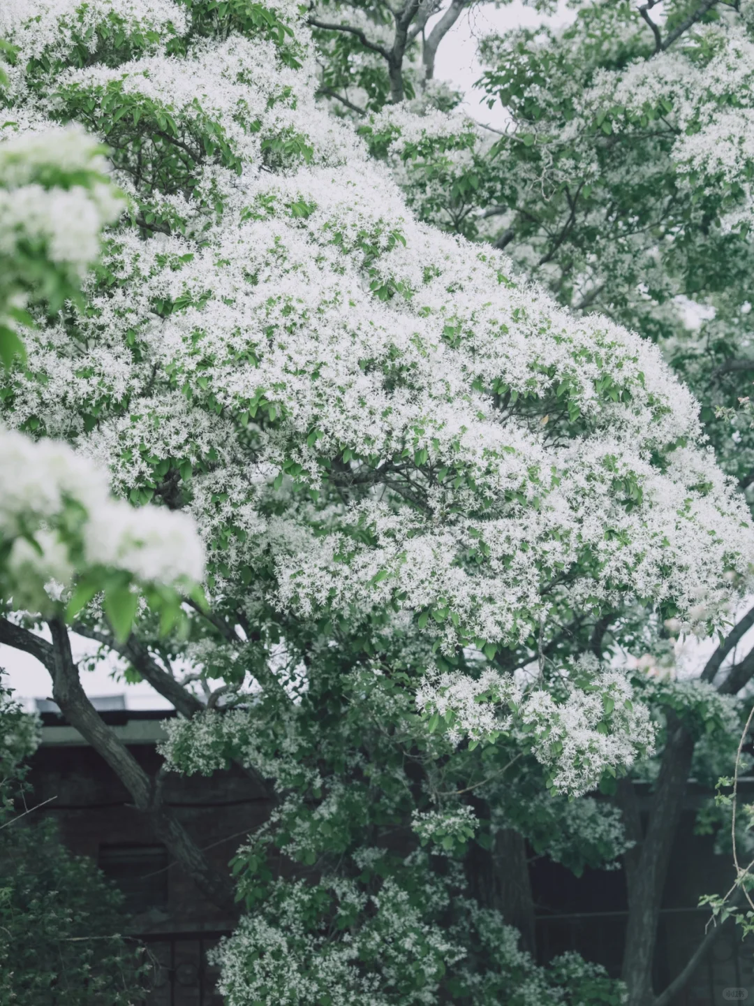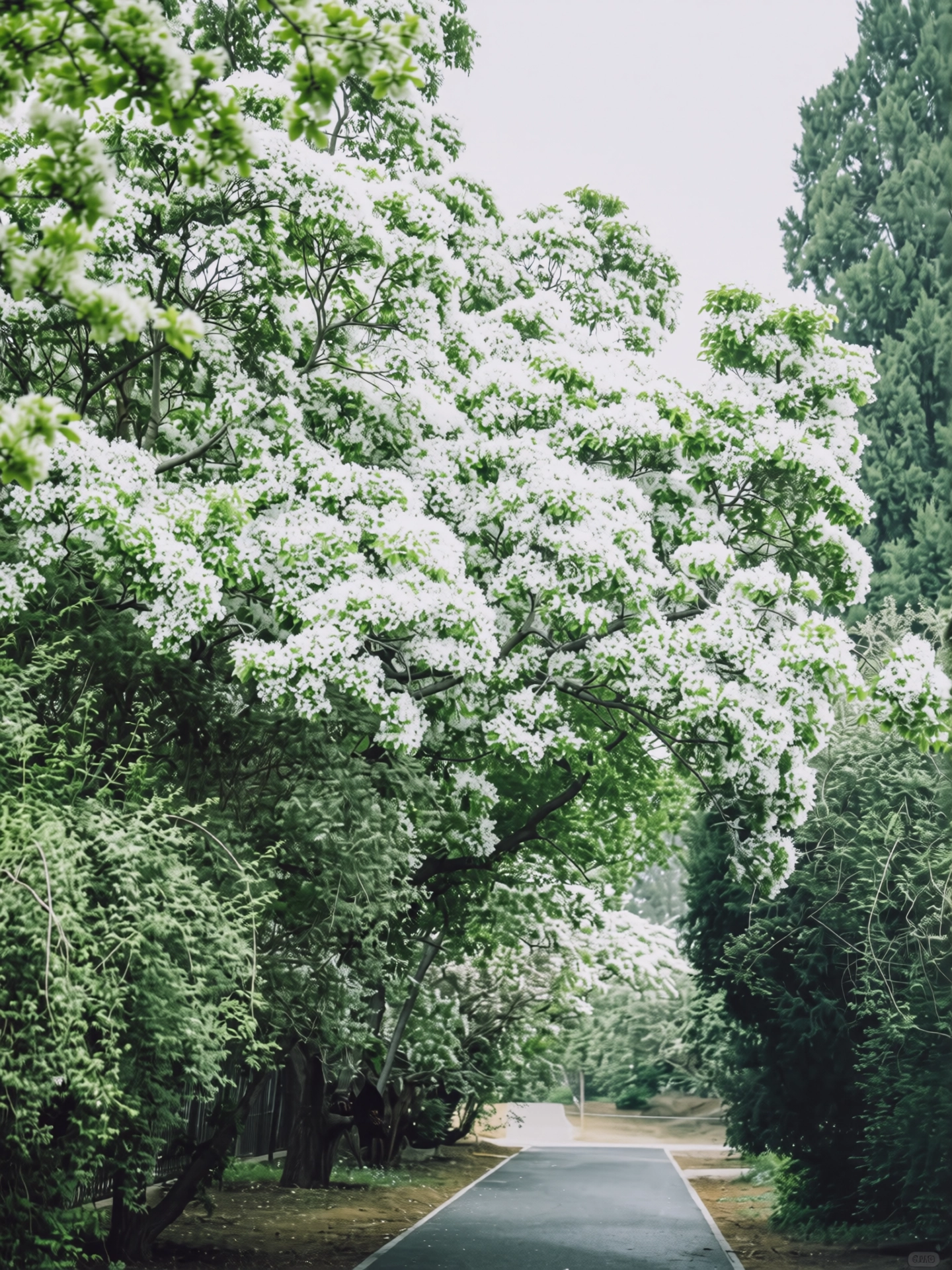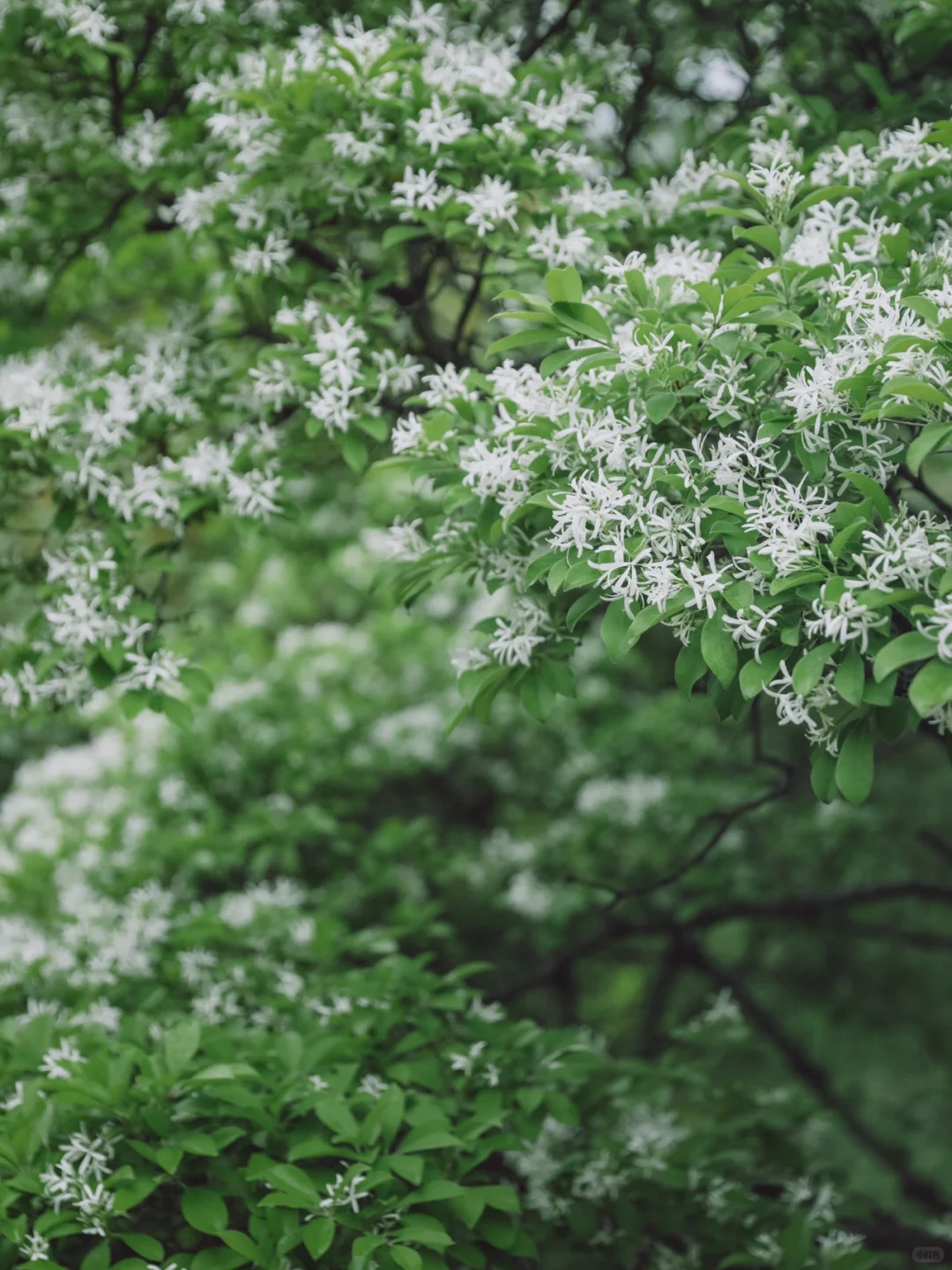 In spring, the National Botanical Garden in Beijing is quietly illuminated by blooming fringe trees. Their delicate white blossoms fall like soft snow, swaying gently in the breeze, as if time itself has grown tender. Sunlight filters through the flowers, scattering dappled light upon the ground, while a faint fragrance lingers in the air. Visitors pause beneath the trees, gazing up at this serene beauty. In that moment, spring does not arrive with noise, but whispers softly through the blossoms—carrying warmth and life.