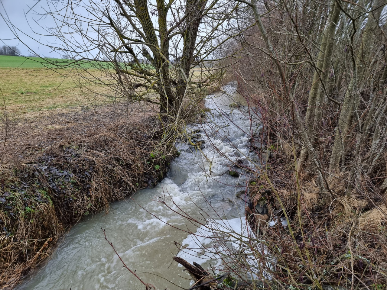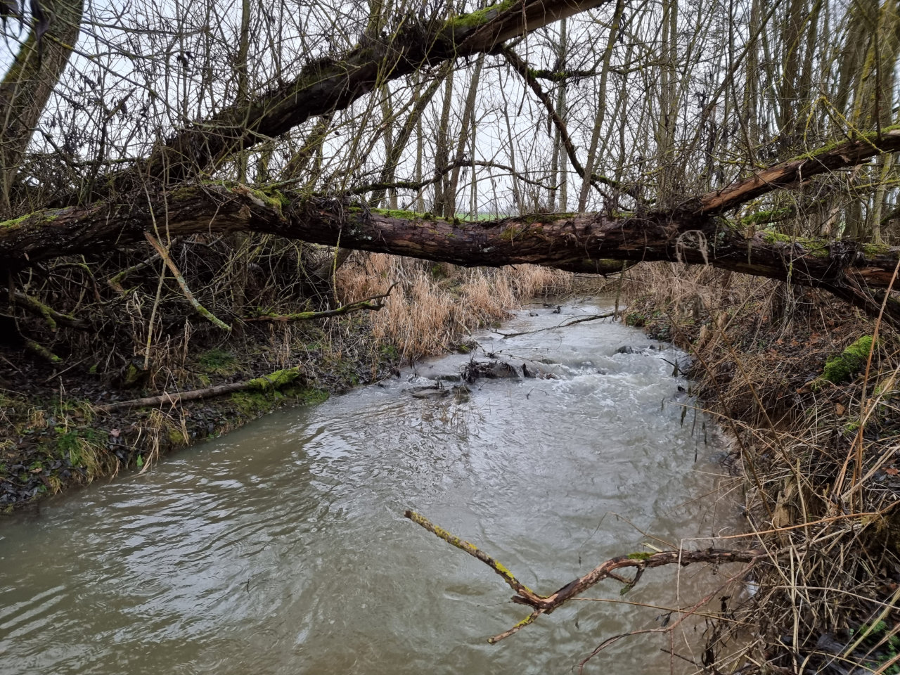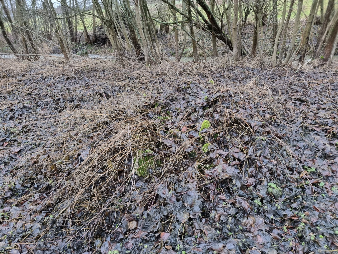 A small stream that also flows through the village. As you can see, the banks of the streams are planted with young maple trees so that the water does not carry the earth away so quickly. The second picture shows a pile covered with leaves, which is a pile of stones intended as a habitat for animals. Stones are placed in the creek to slow the speed of the water. Everything is made by human hands and that is our contribution as villagers to nature.