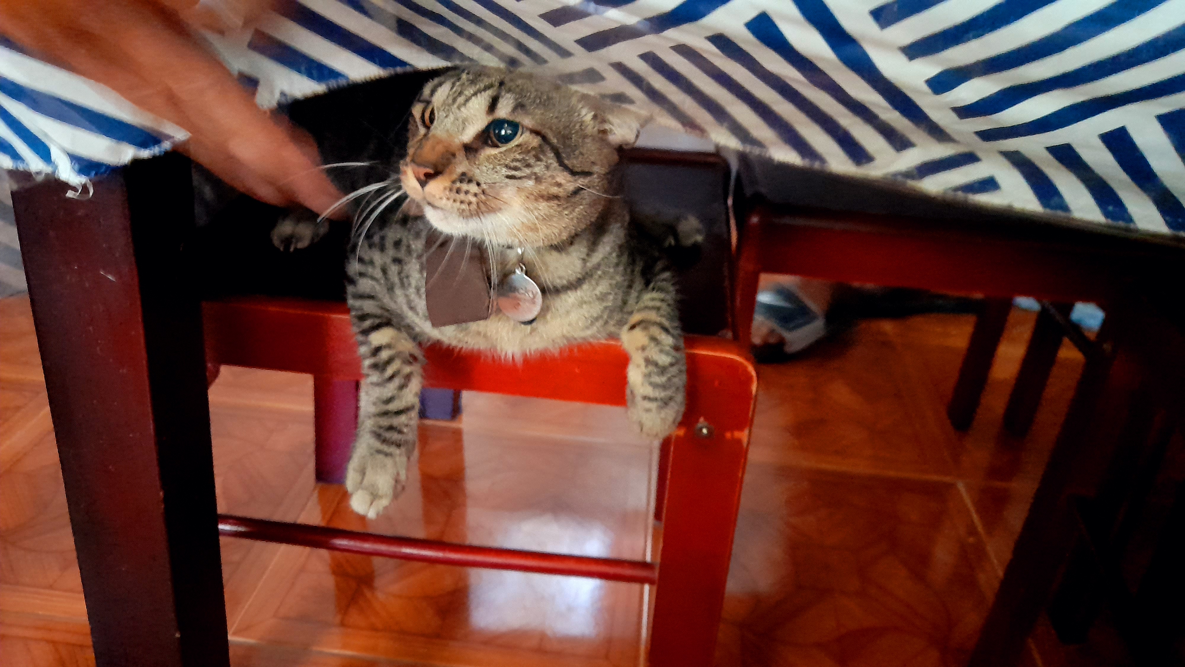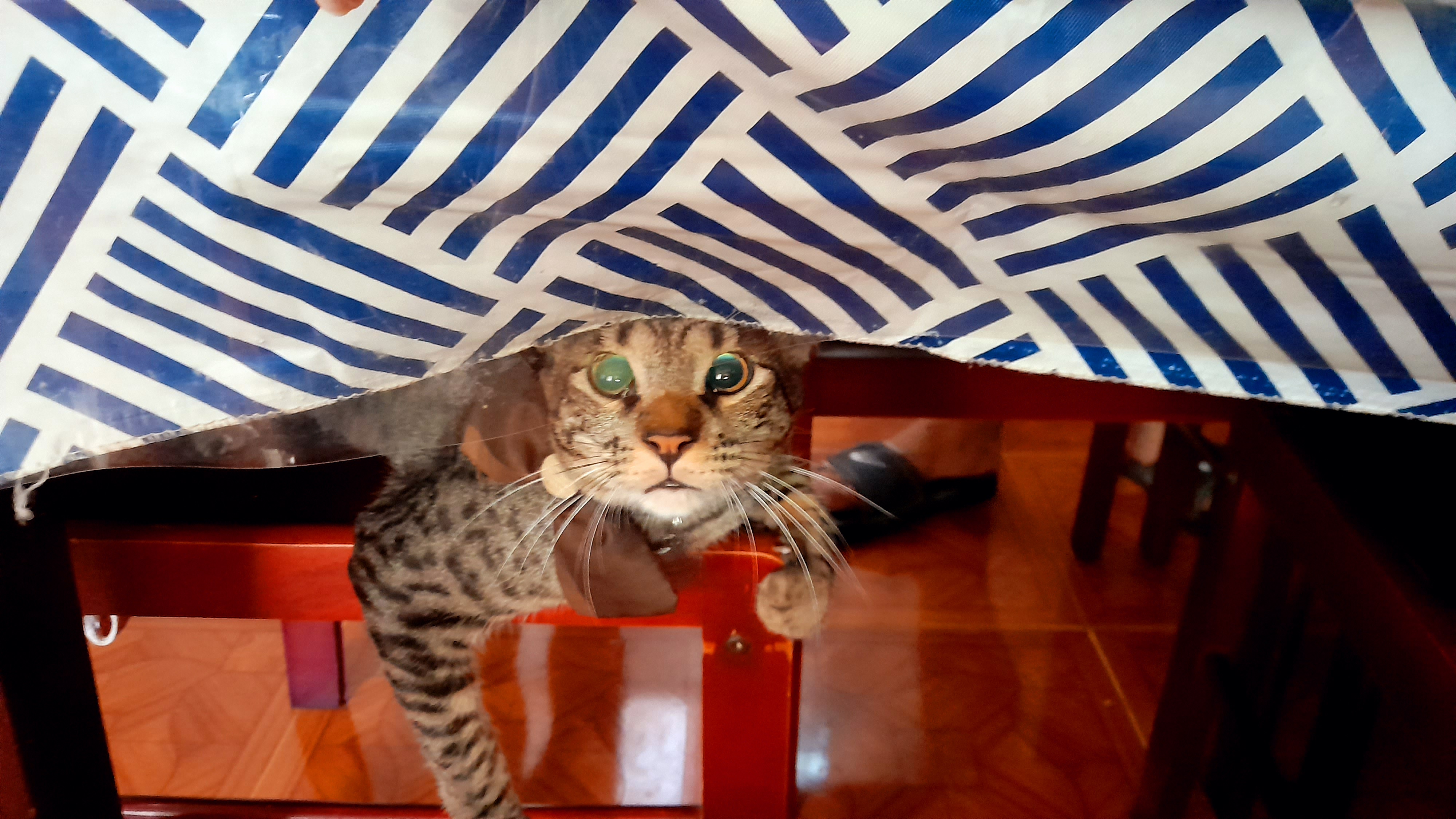 This cat of ours, tabby cat , Lucky got catnip high and started running around the house. He hid under the table and I tried playing with him and made him pissed by tapping the table cover.