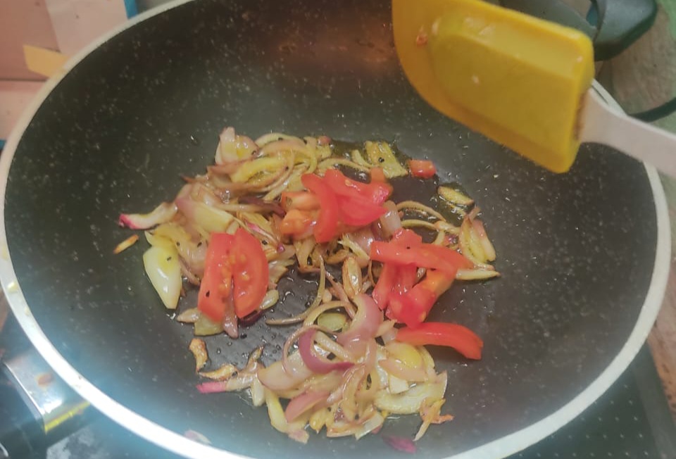 ৯)কালোজিরের মধ্যেই পিঁয়াজ কুঁচি, টমেটো গুলো দিয়ে সামান্য নুন দিয়ে নাড়িয়ে একটু ভাজা ভাজা করলাম।