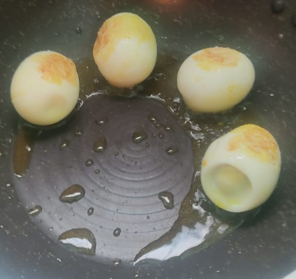 ৭)তেল গরম হলে ডিম গুলো হালকা ভাবে ভেজে নিয়ে একটা পাএে তুলে নিলাম।