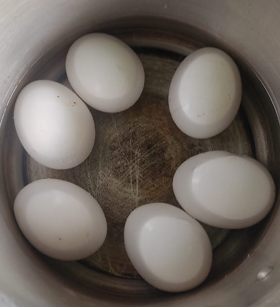 ১)প্রথমে গ্যাস জ্বালিয়ে প্রেসার কুকারে জল দিয়ে তার মধ্যে ডিম গুলো আসতে করে দিয়ে ওর মধ্যে নুন দিয়ে ঢাকণা দিয়ে সেদ্ধ করে নিলাম।