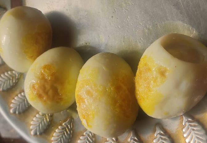 ২)তারপরে ঠান্ডা হলে প্রেসার কুকার খুলে ডিম গুলো একটা পাএে নামিয়ে নিলাম।