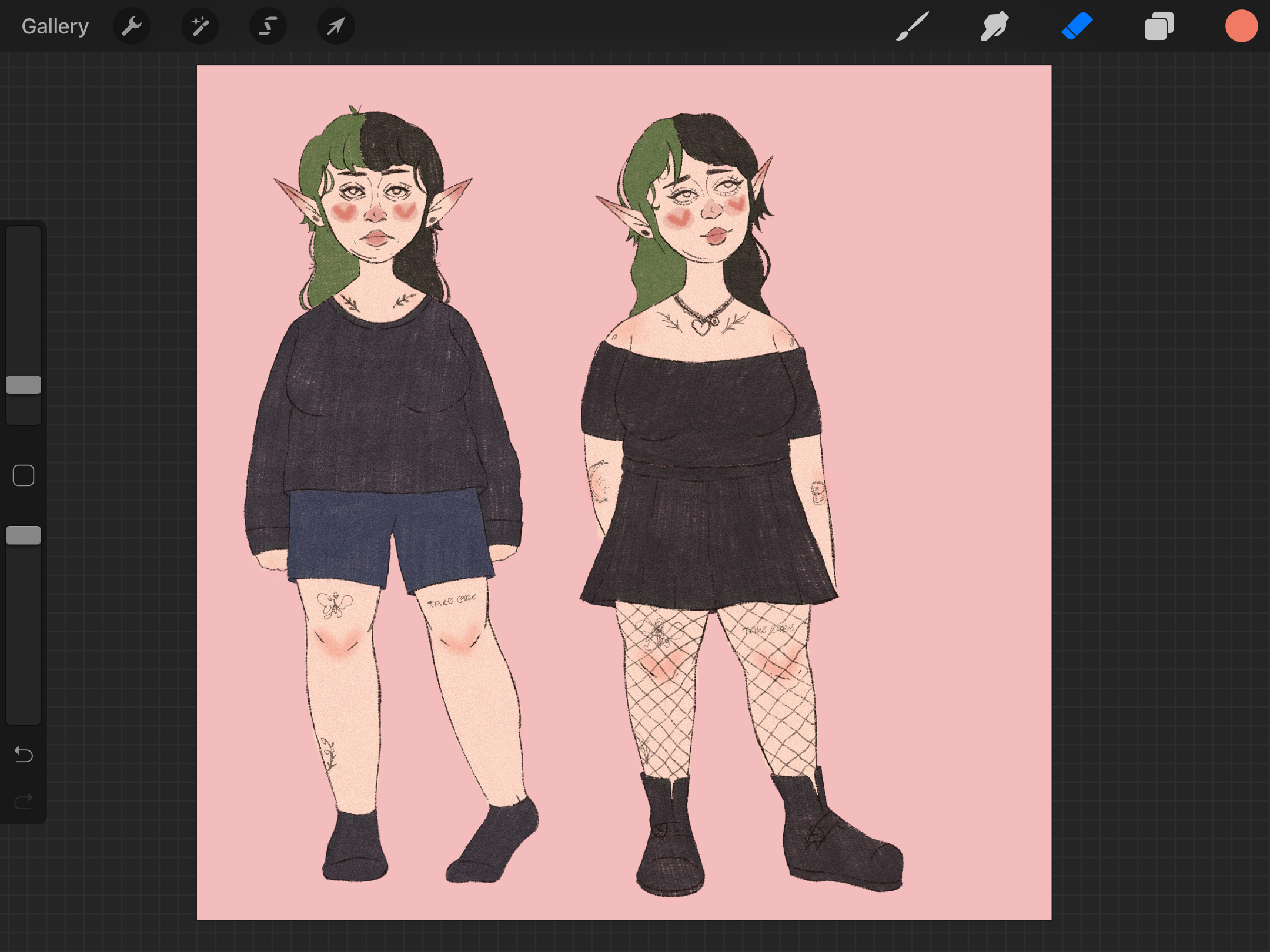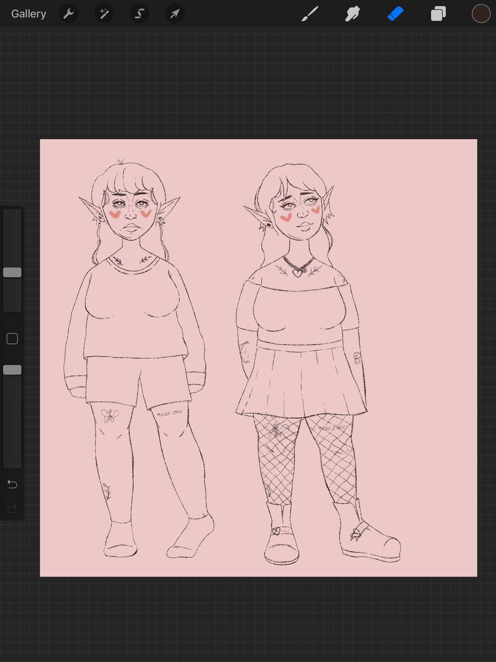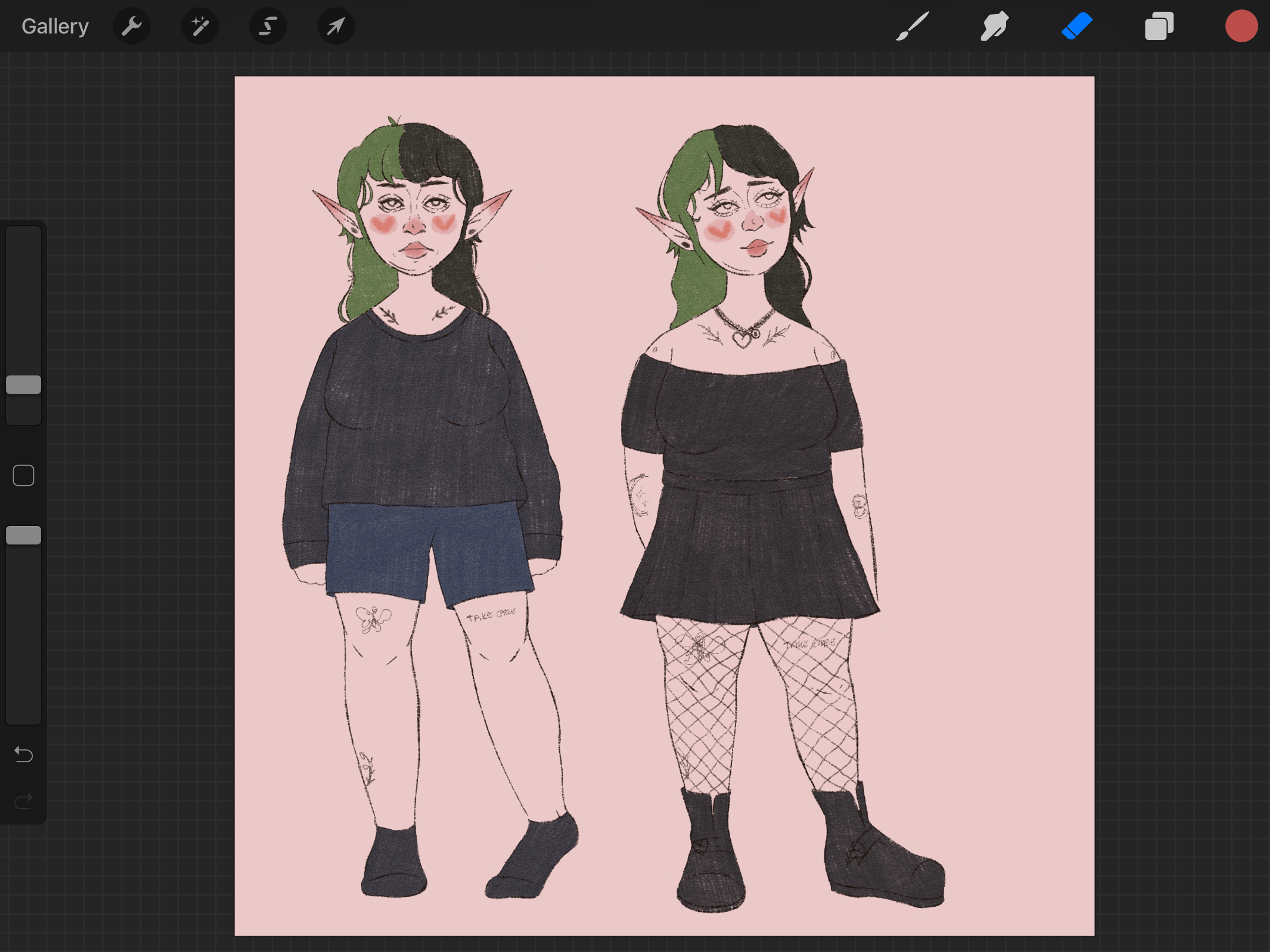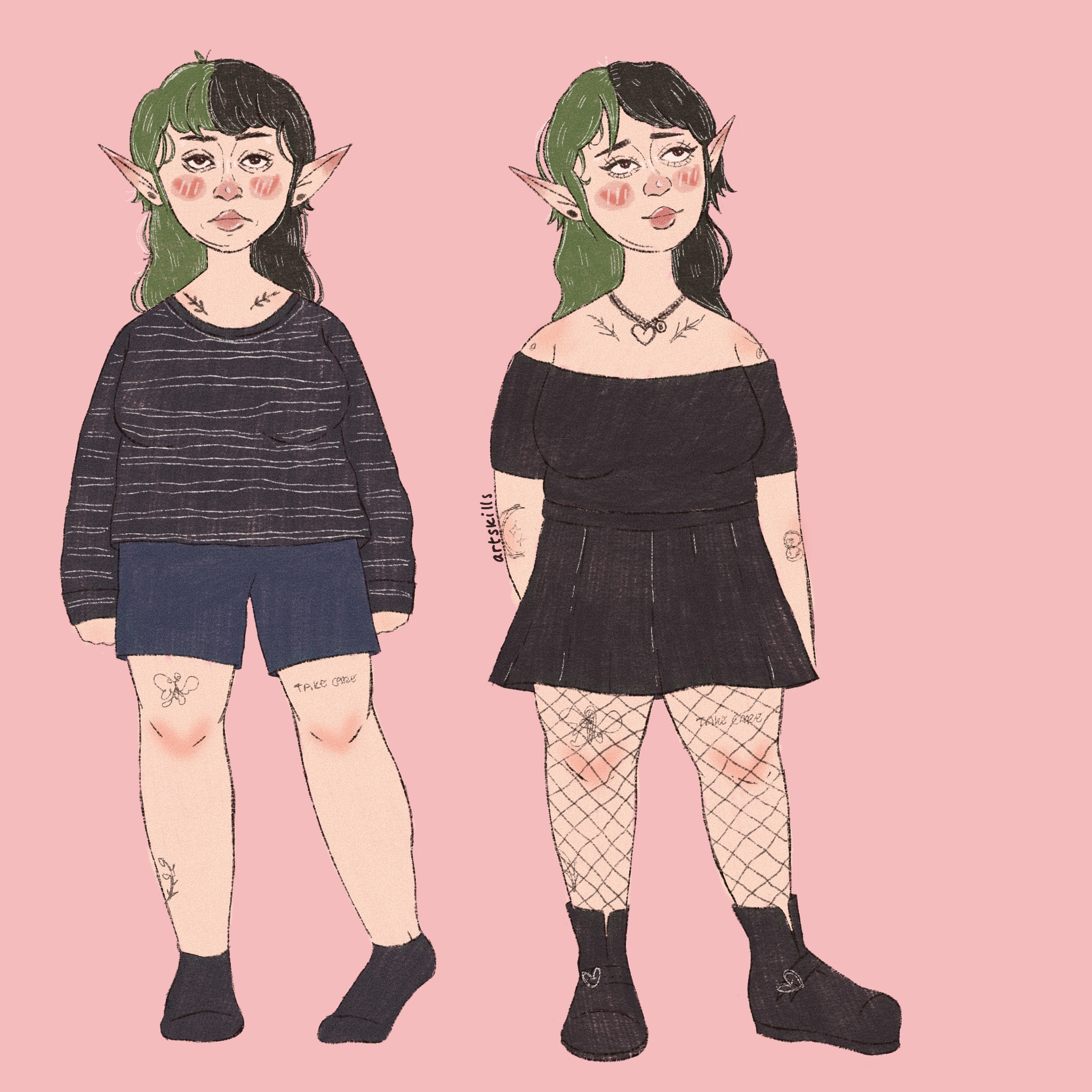 The drawing on the left is my everyday outfit, very comfortable, oversized jumper and baggy men’s shorts, I wear these a lot as they are comfortable and relaxing and because I don’t like my body right now so it’s nice to hide in hehehe:) meanwhile, the drawing on the right is a cute less comfortable outfit, Doc Martens with a heart buckle, fishnet tights, a black tennis / skater skirt and an off the shoulder top! I love this outfit, it makes me feel very cute.