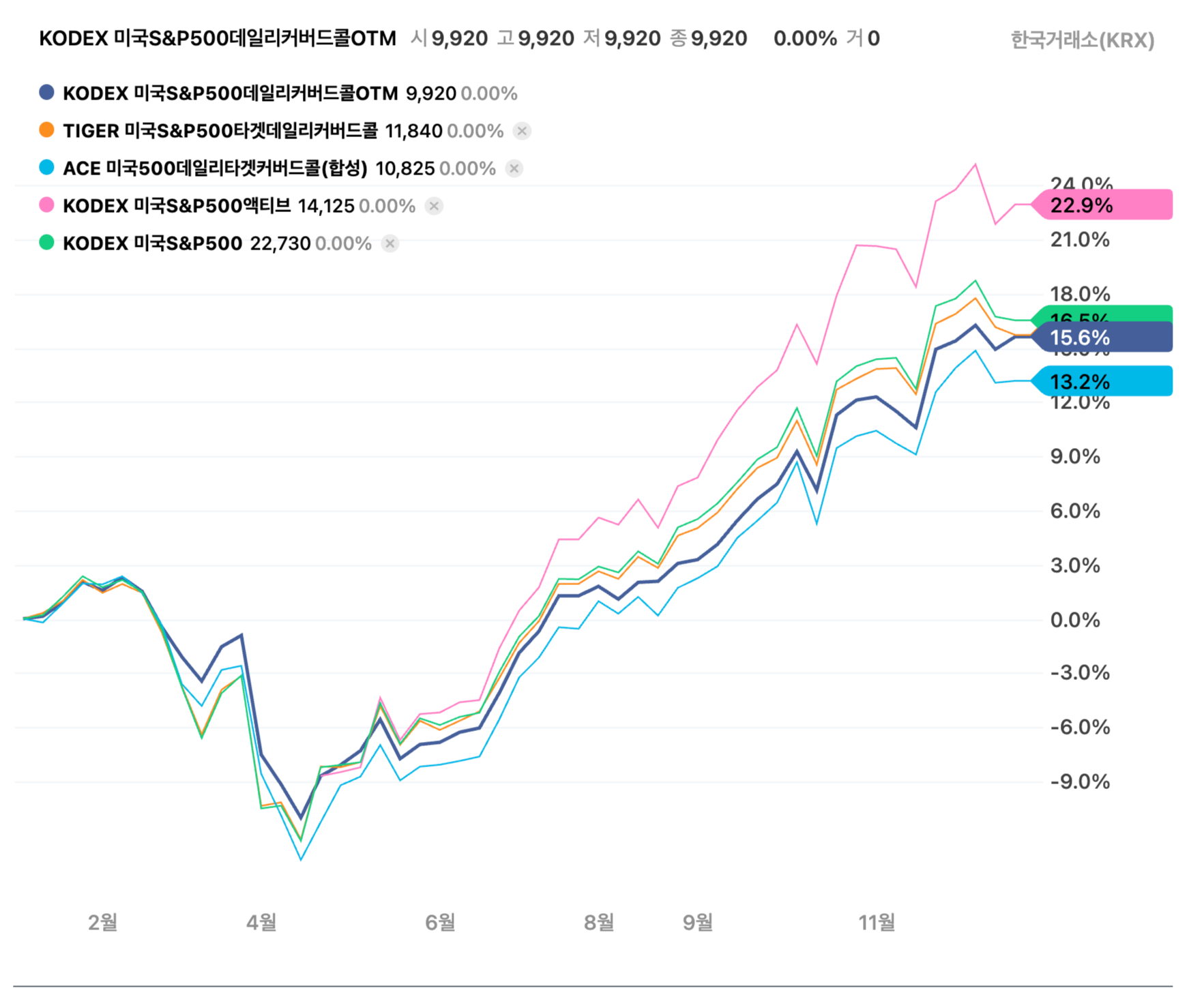 그나마 긍정적인 것은 대부분의 커버드콜이 S&P500 기초 지수를 비교적 잘 따라가고 있다고 하는 것이 되겠습니다. (ACE상품 제외)