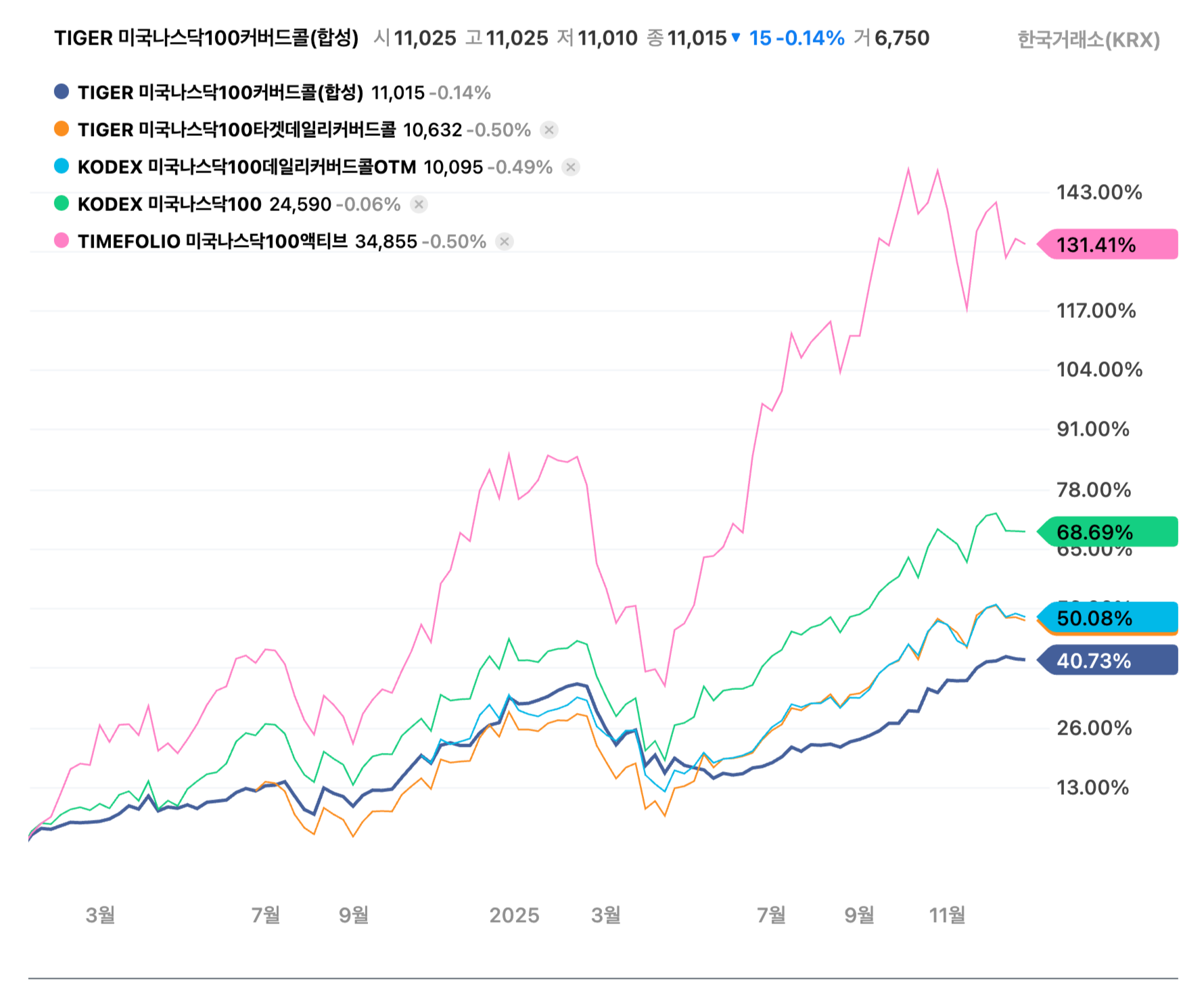 커버드콜의 수익률이 나스닥100 기초지수를 잘 못따라가는 현상이 극명하게 보이는 것 같습니다.