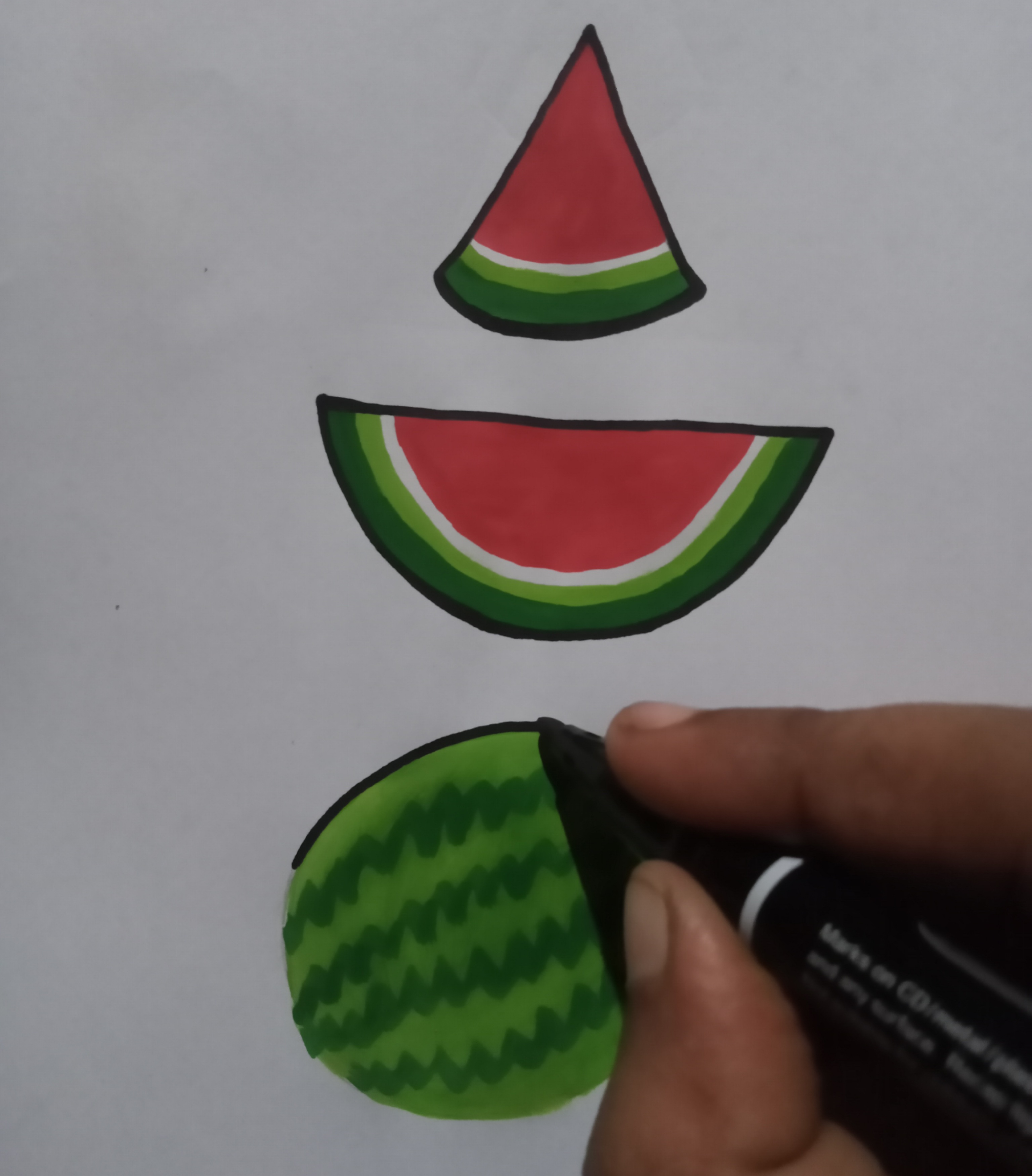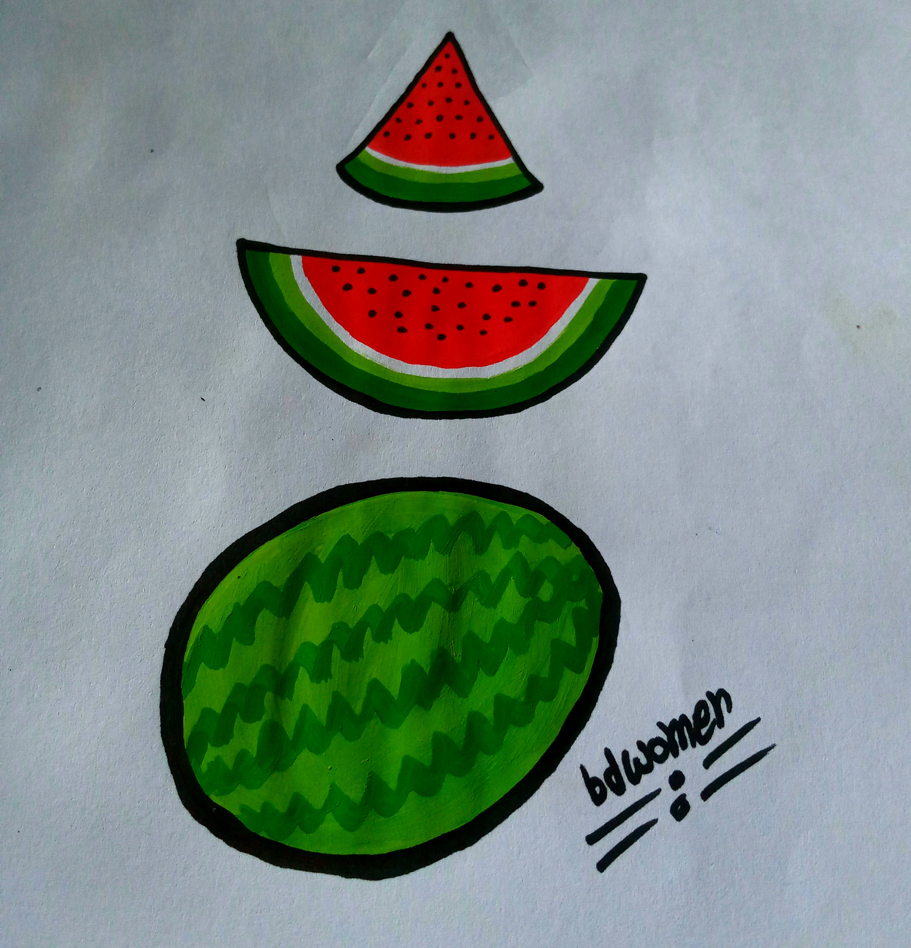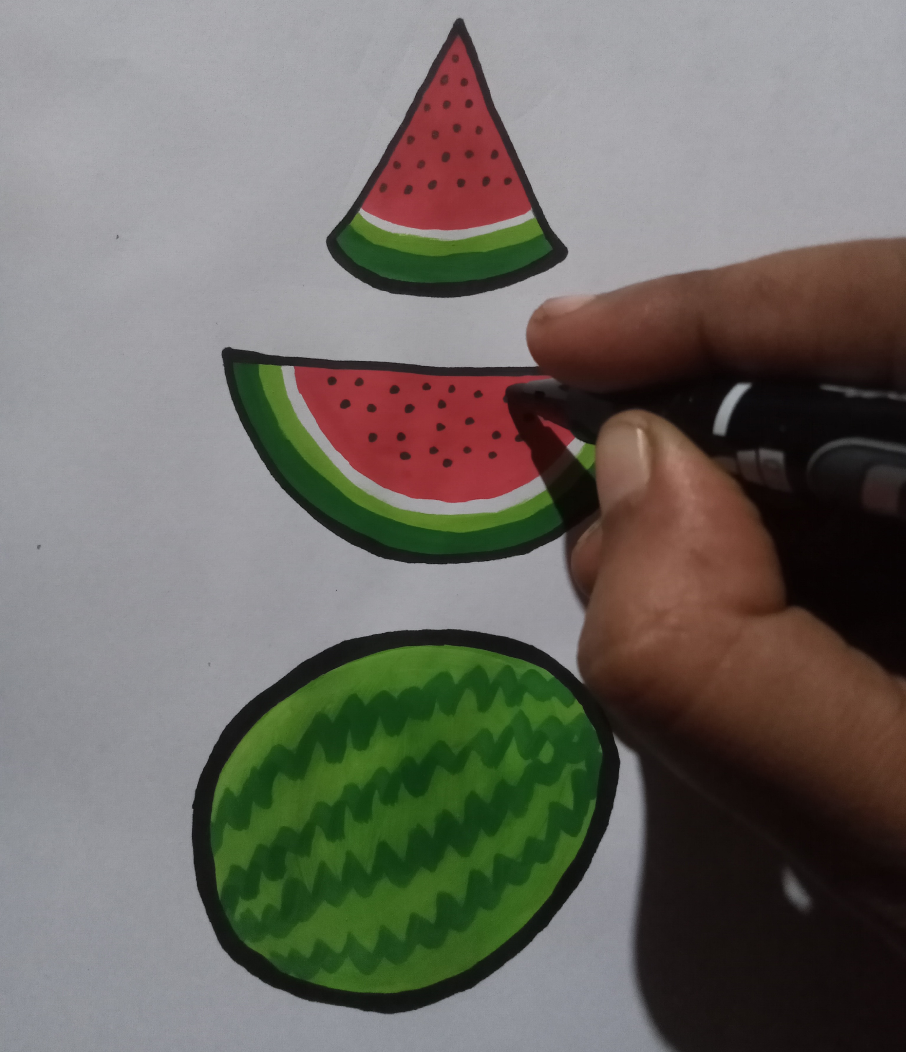 তারপর তরমুজের চারপাশে মার্কার কলম দিয়ে সুন্দরভাবে কালো দাগ টেনে নিয়ে নিলাম।