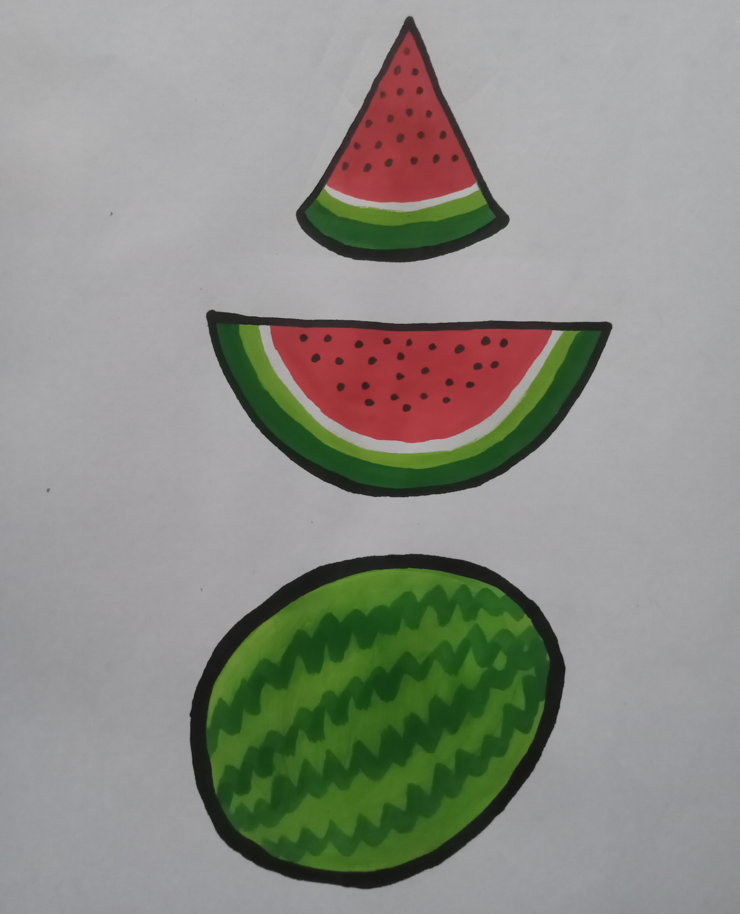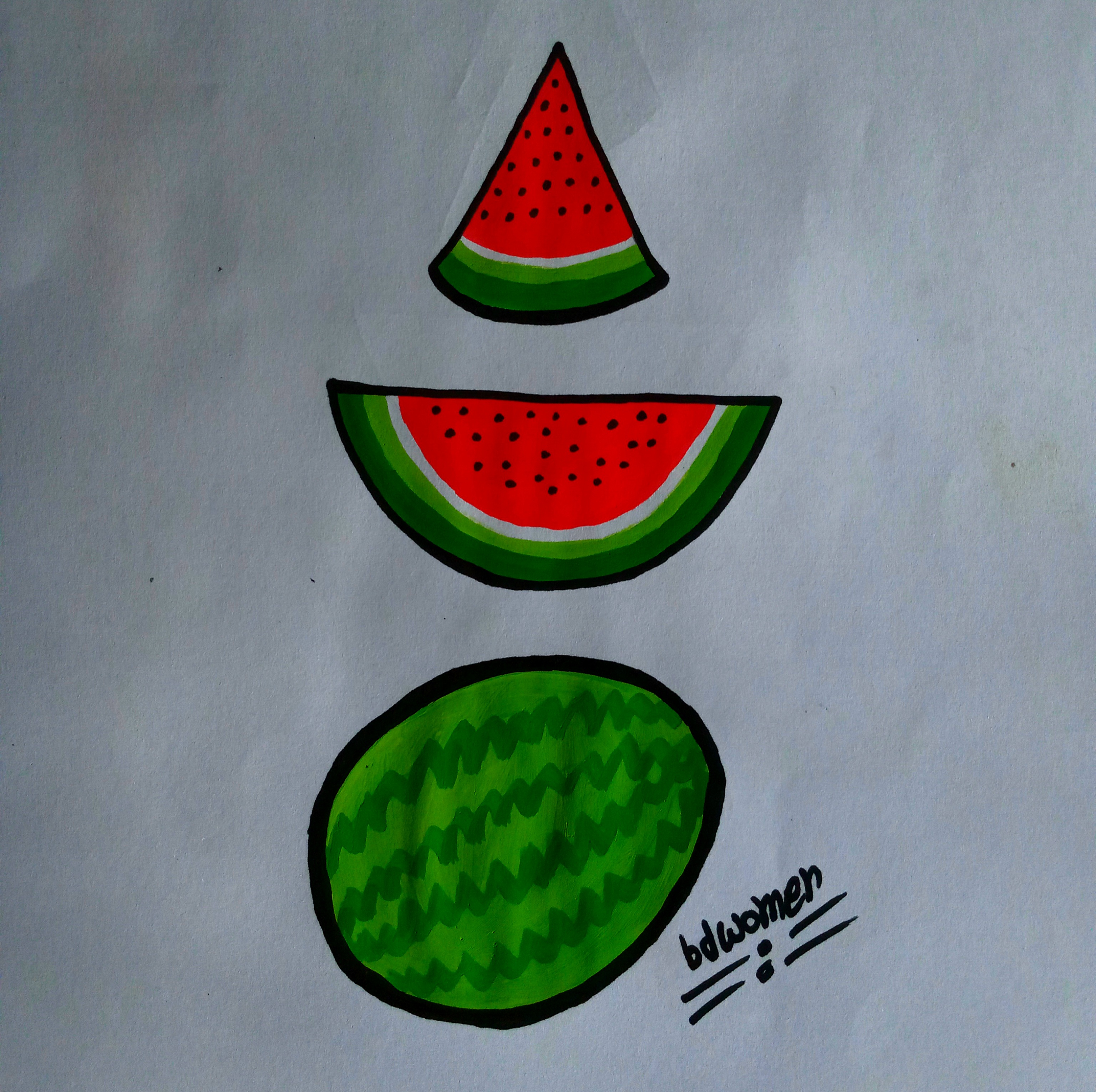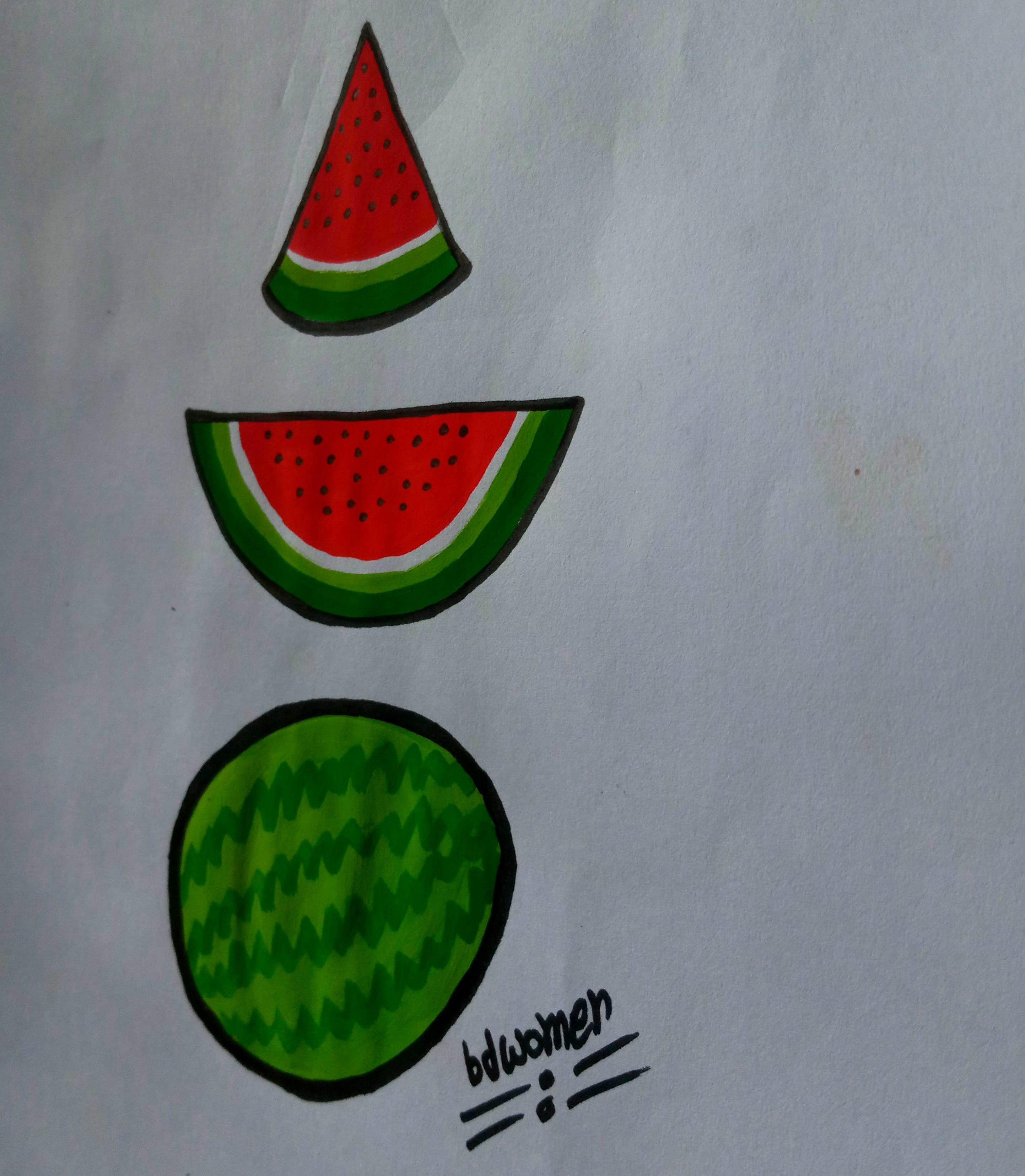 তারপর তরমুজের চারপাশে মার্কার কলম দিয়ে সুন্দরভাবে কালো দাগ টেনে নিয়ে নিলাম।