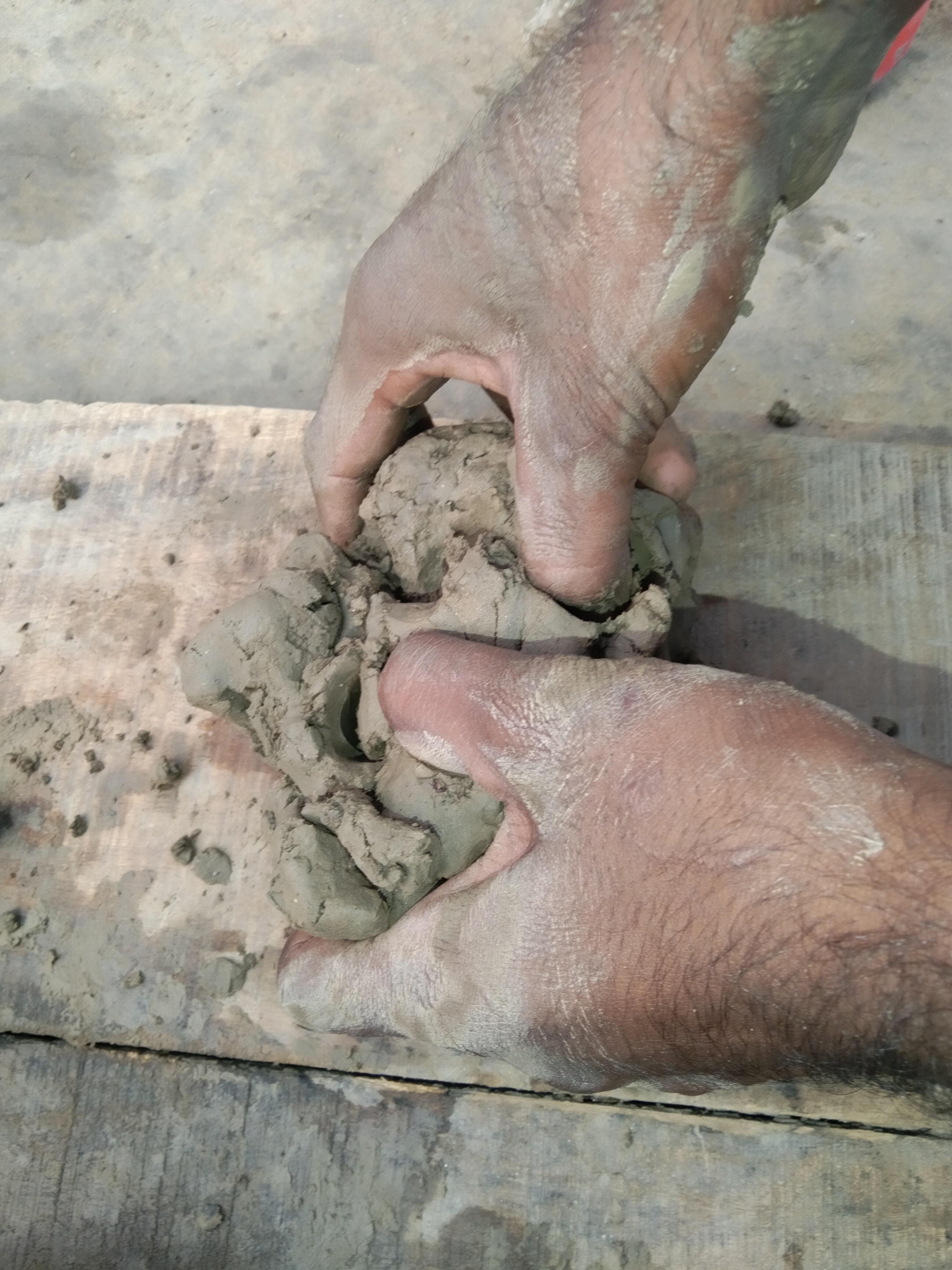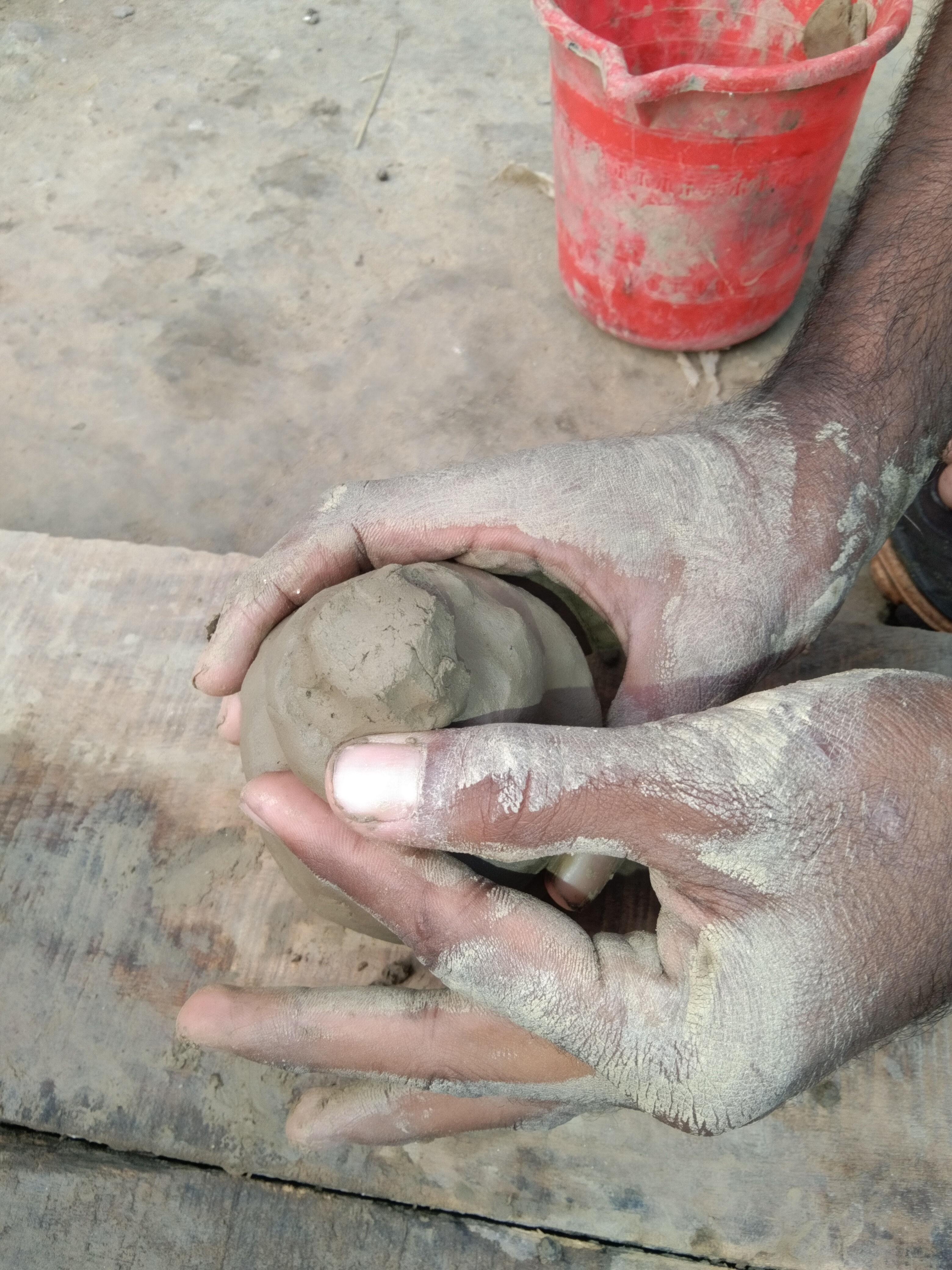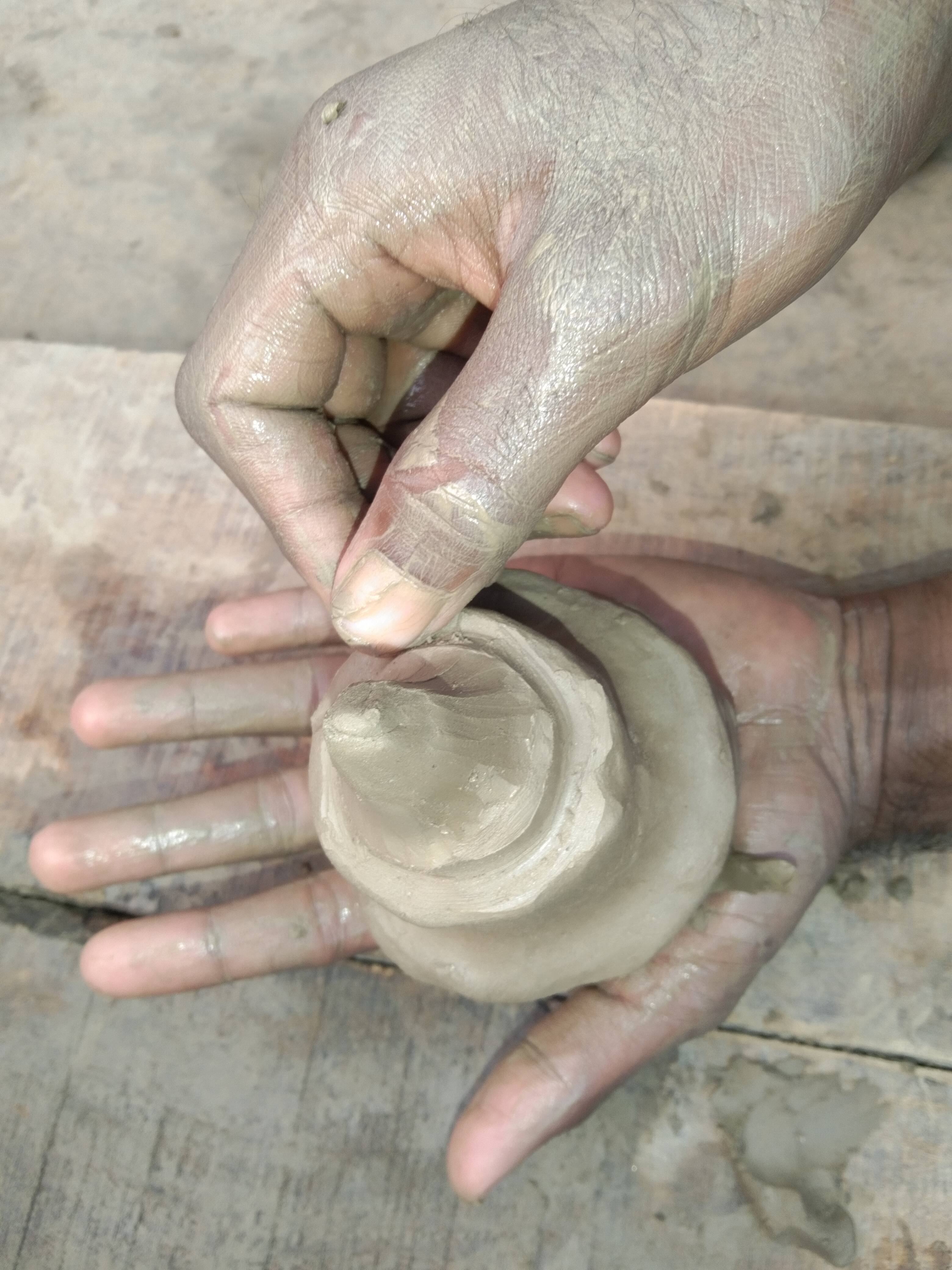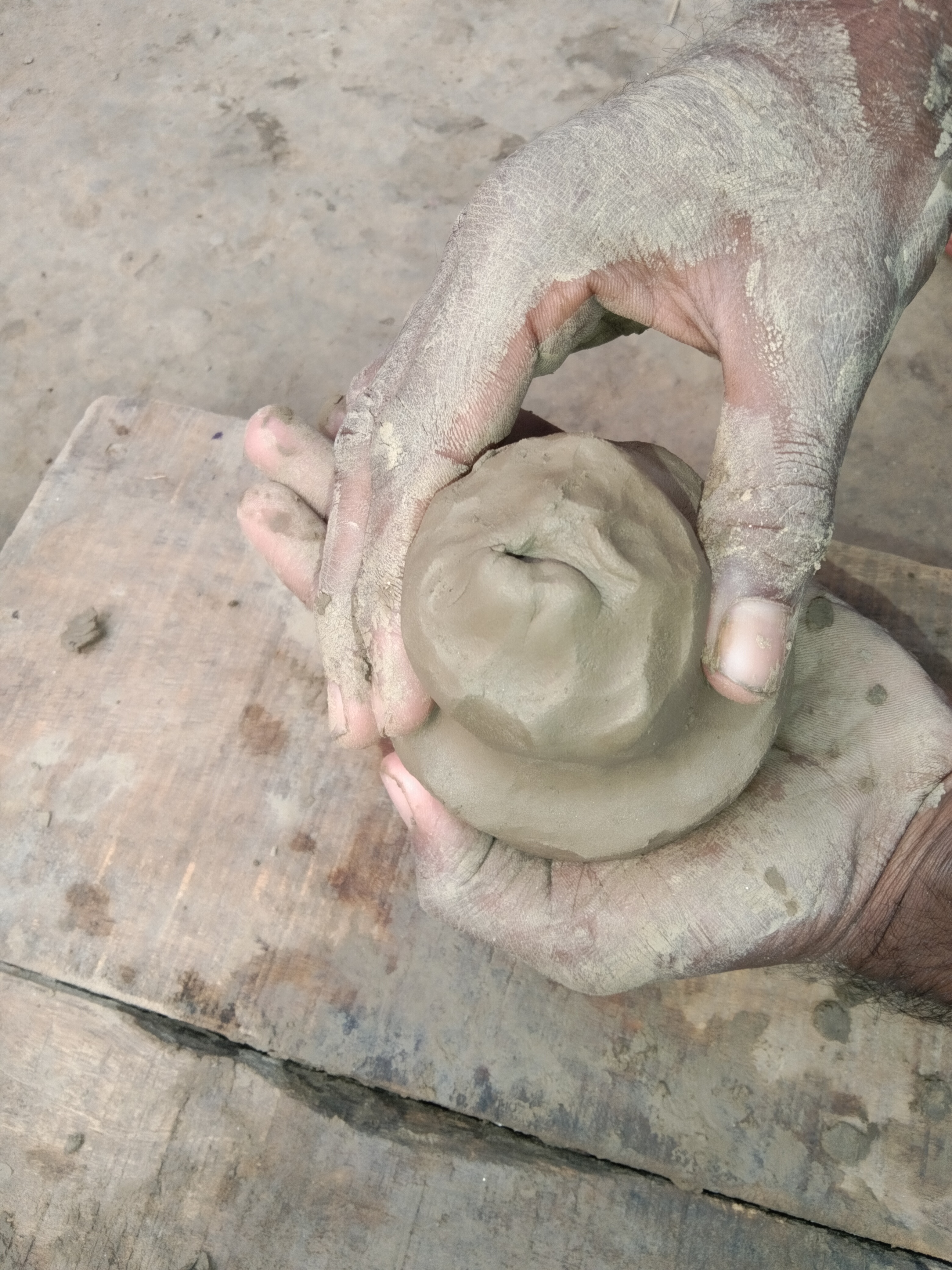 এবার গোল করা কাদা টির মাথার দিকে হাতের আংগুল দ্বারা গোল করে আলতো করে চাপ দিব।