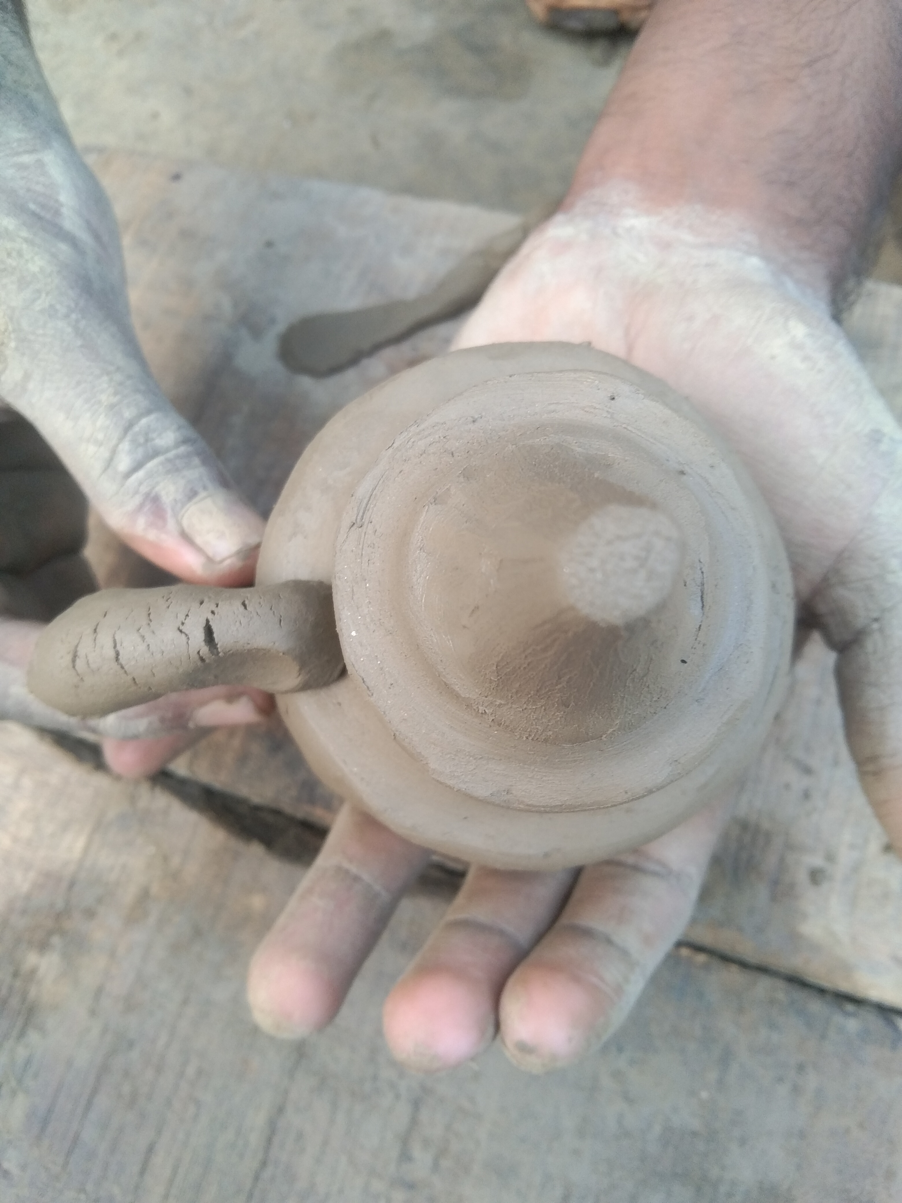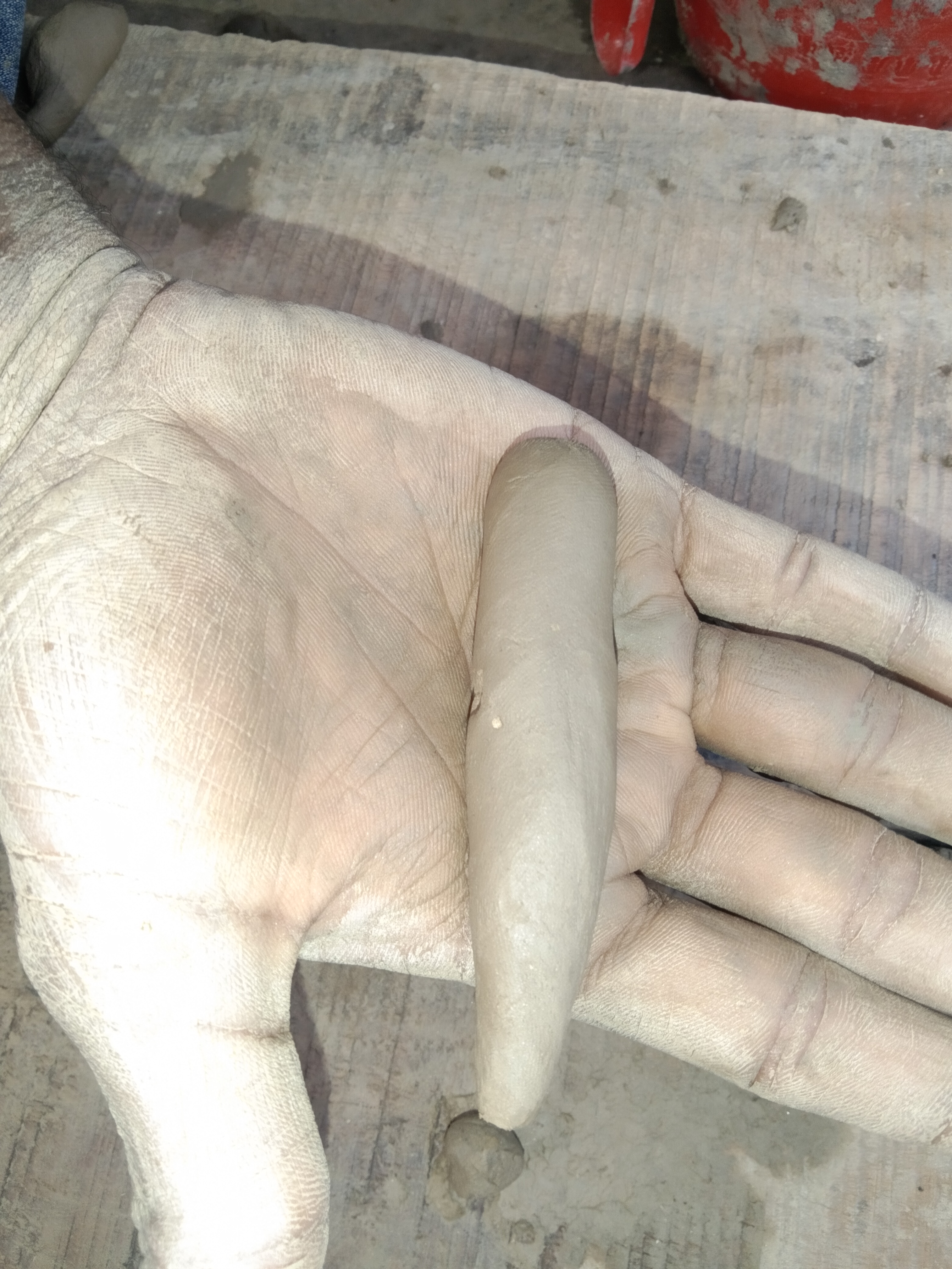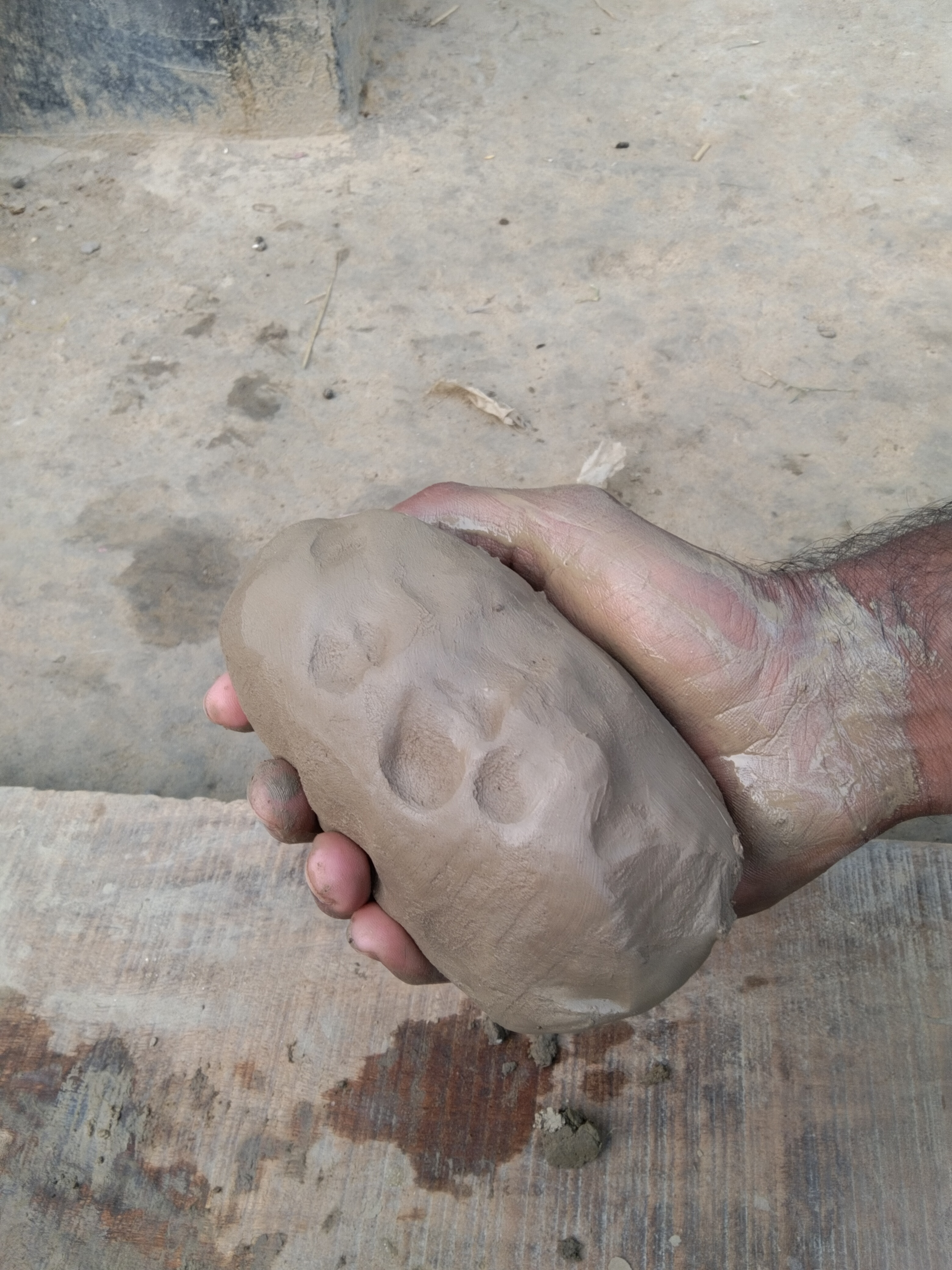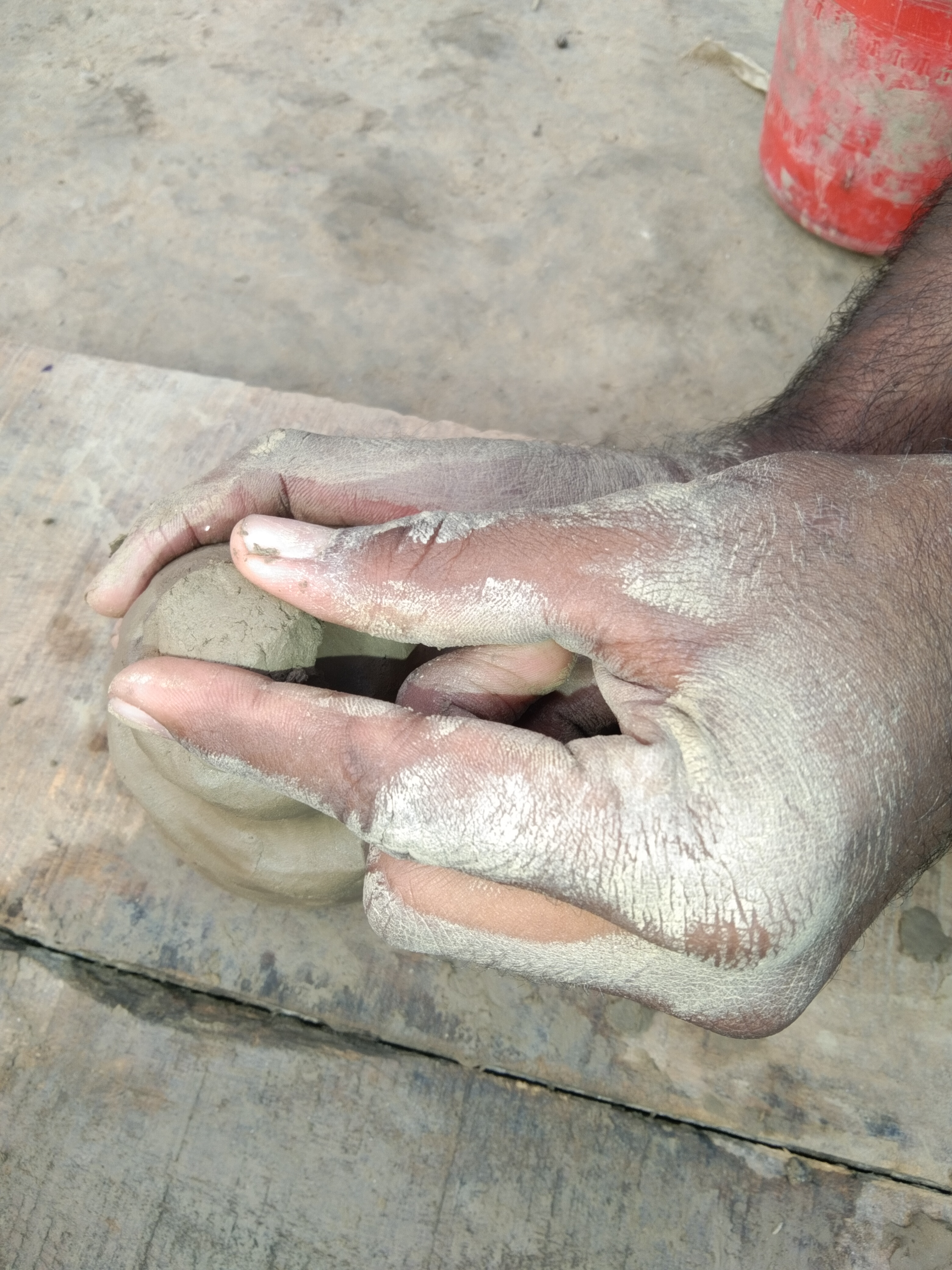 এবার গোল করা কাদা টির মাথার দিকে হাতের আংগুল দ্বারা গোল করে আলতো করে চাপ দিব।