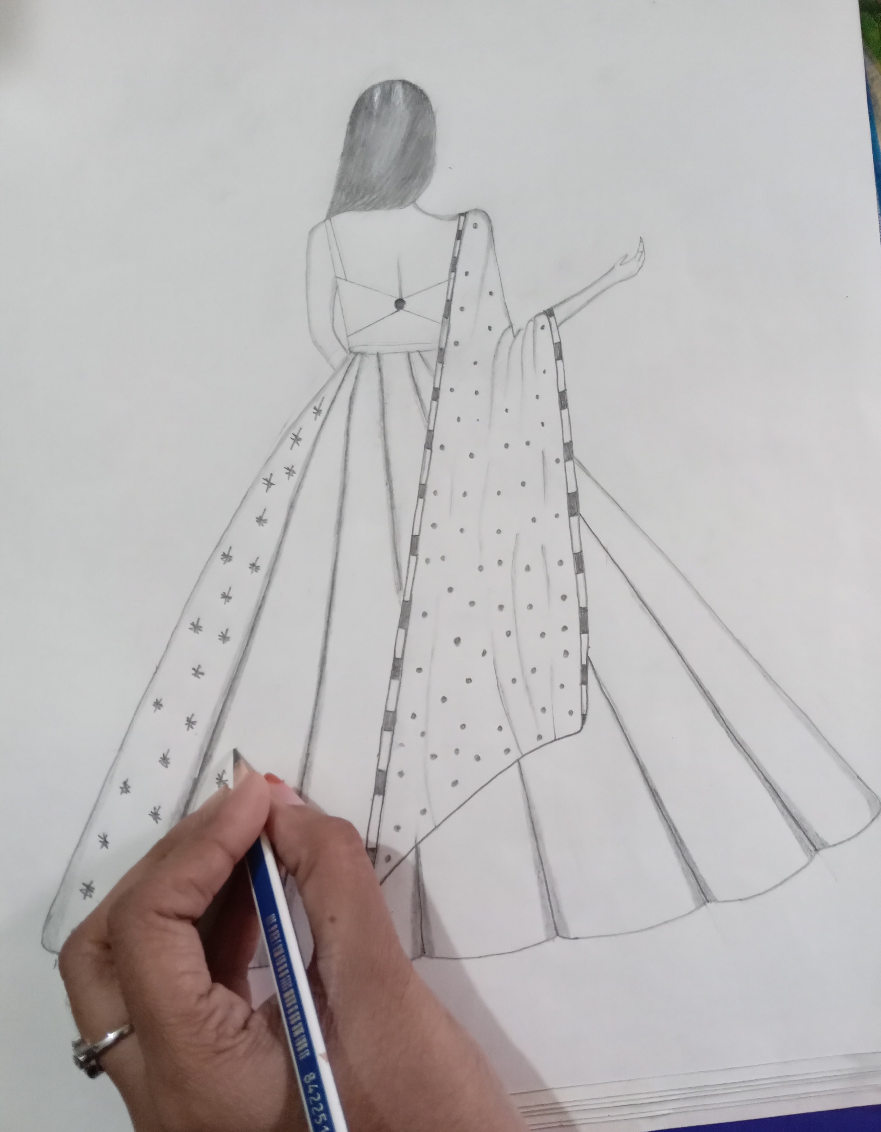 তারপর জামার নিচের অংশের ডিজাইনগুলো পেন্সিল দিয়ে কিছুটা গাঢ় করে দেই।