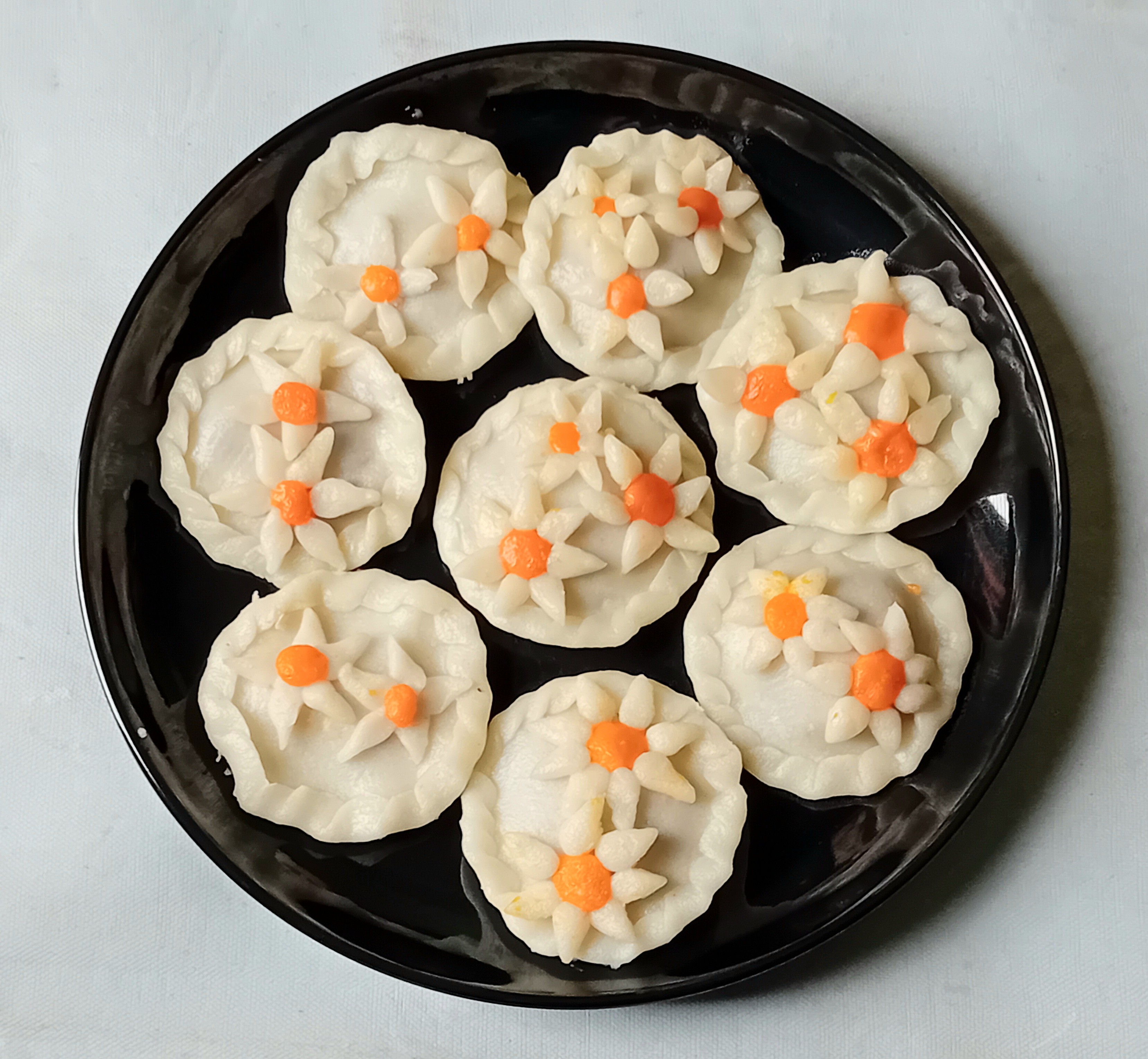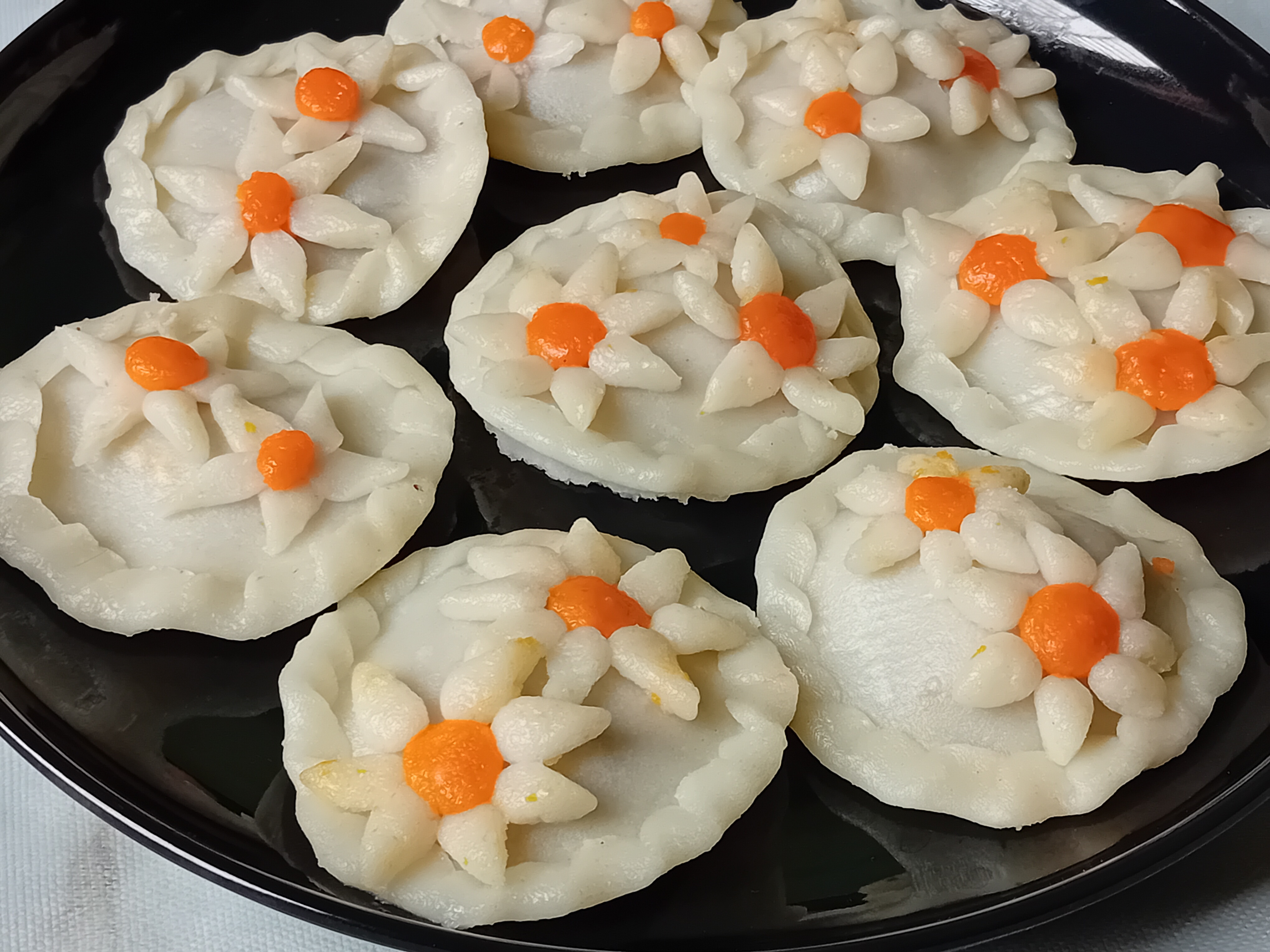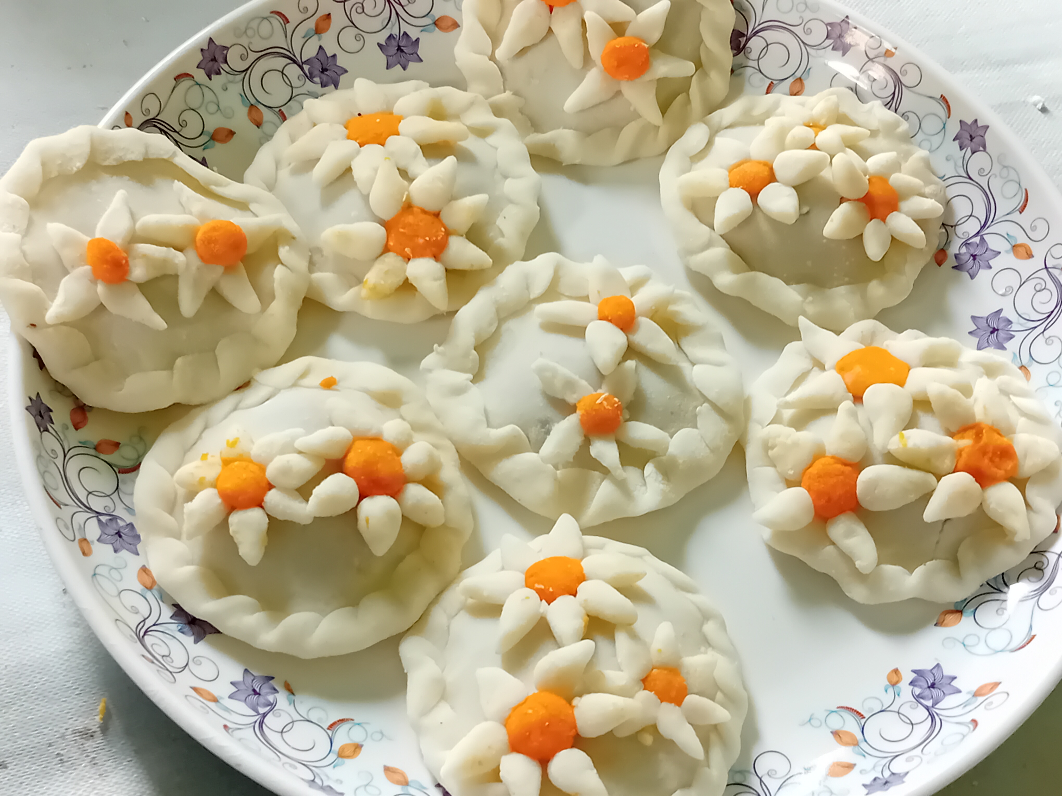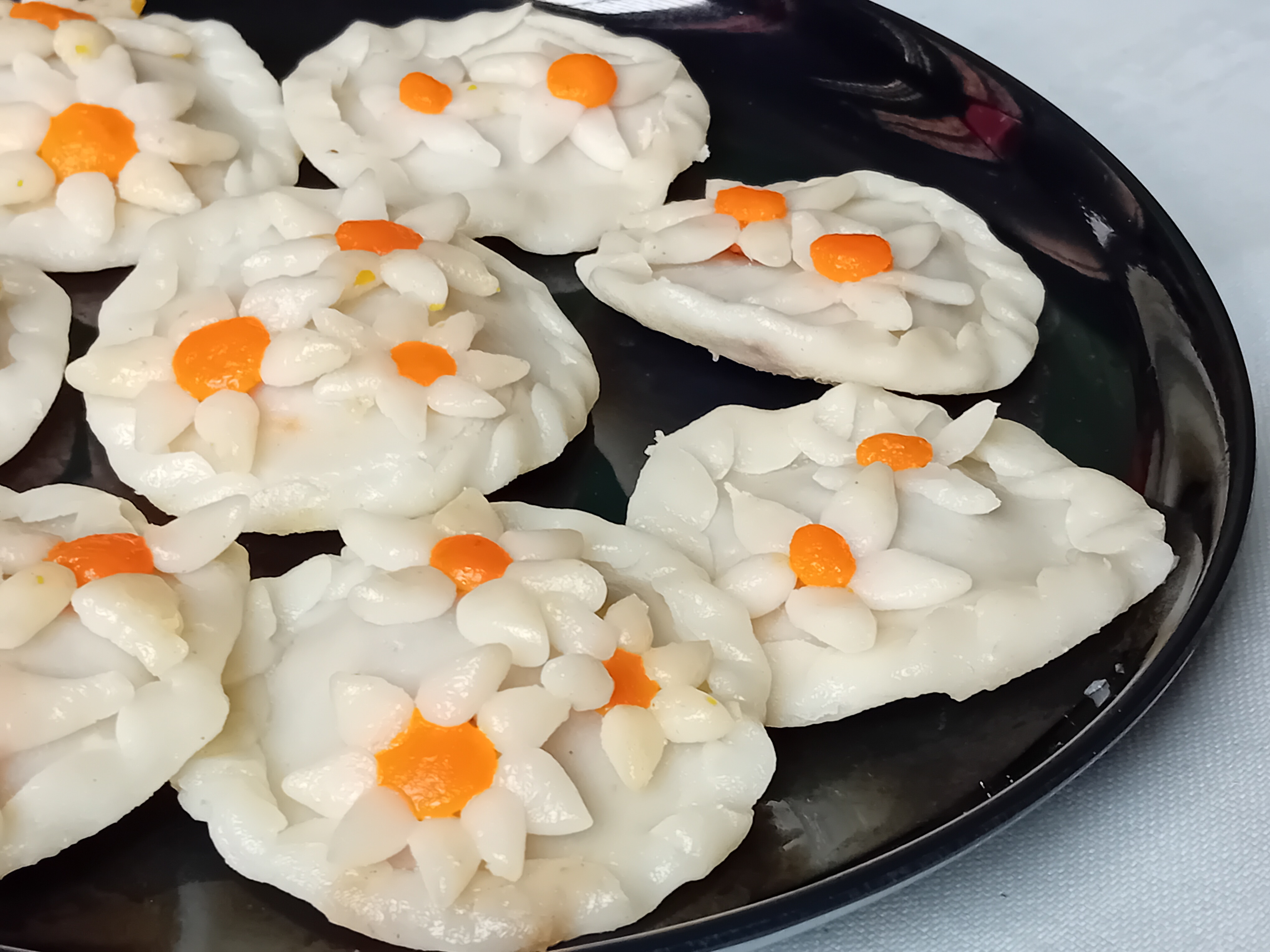 এভাবে আমি সবগুলো পলি পিঠার উপর শিউলি ফুলের মত ছোট ছোট ফুল তৈরি করে নিয়েছি।
