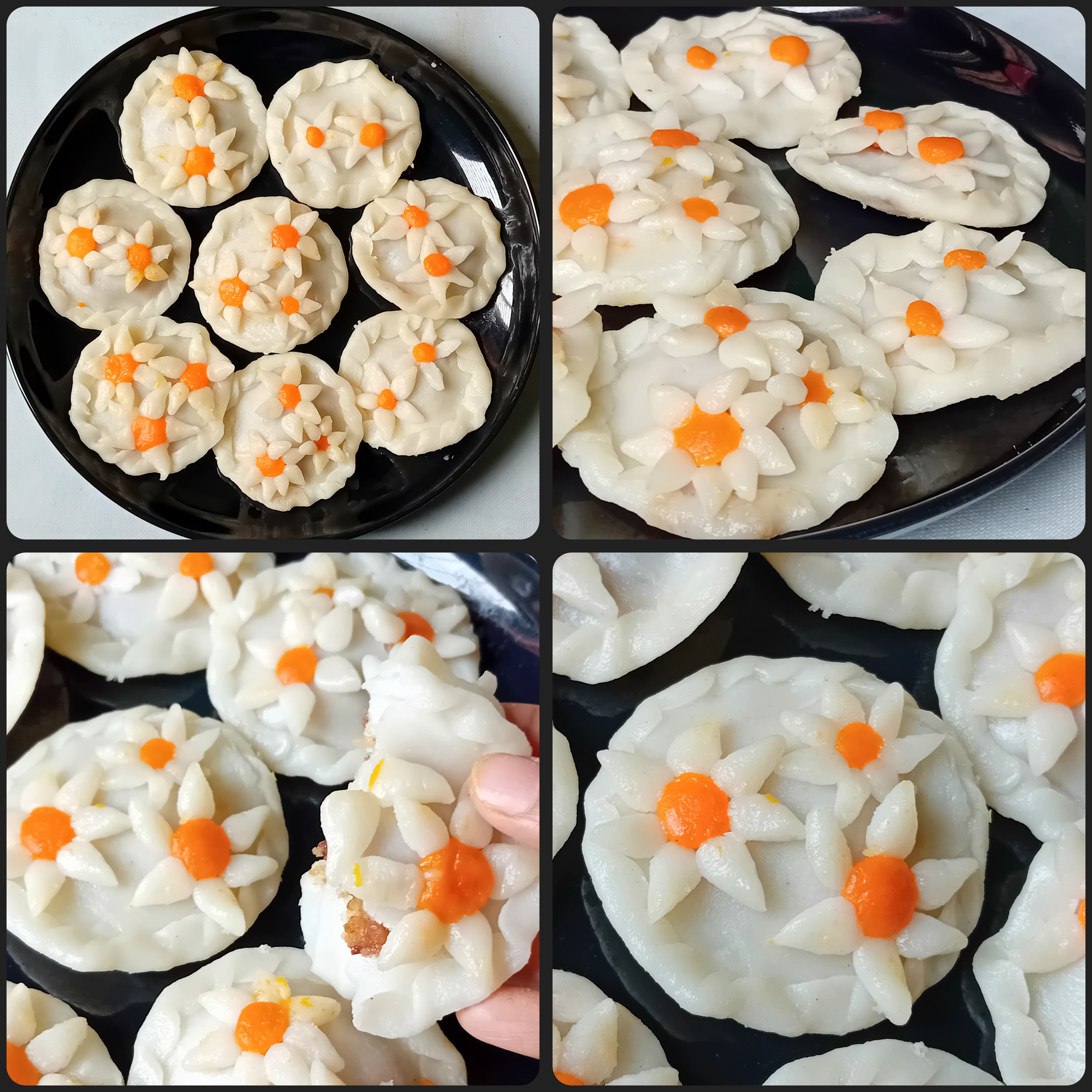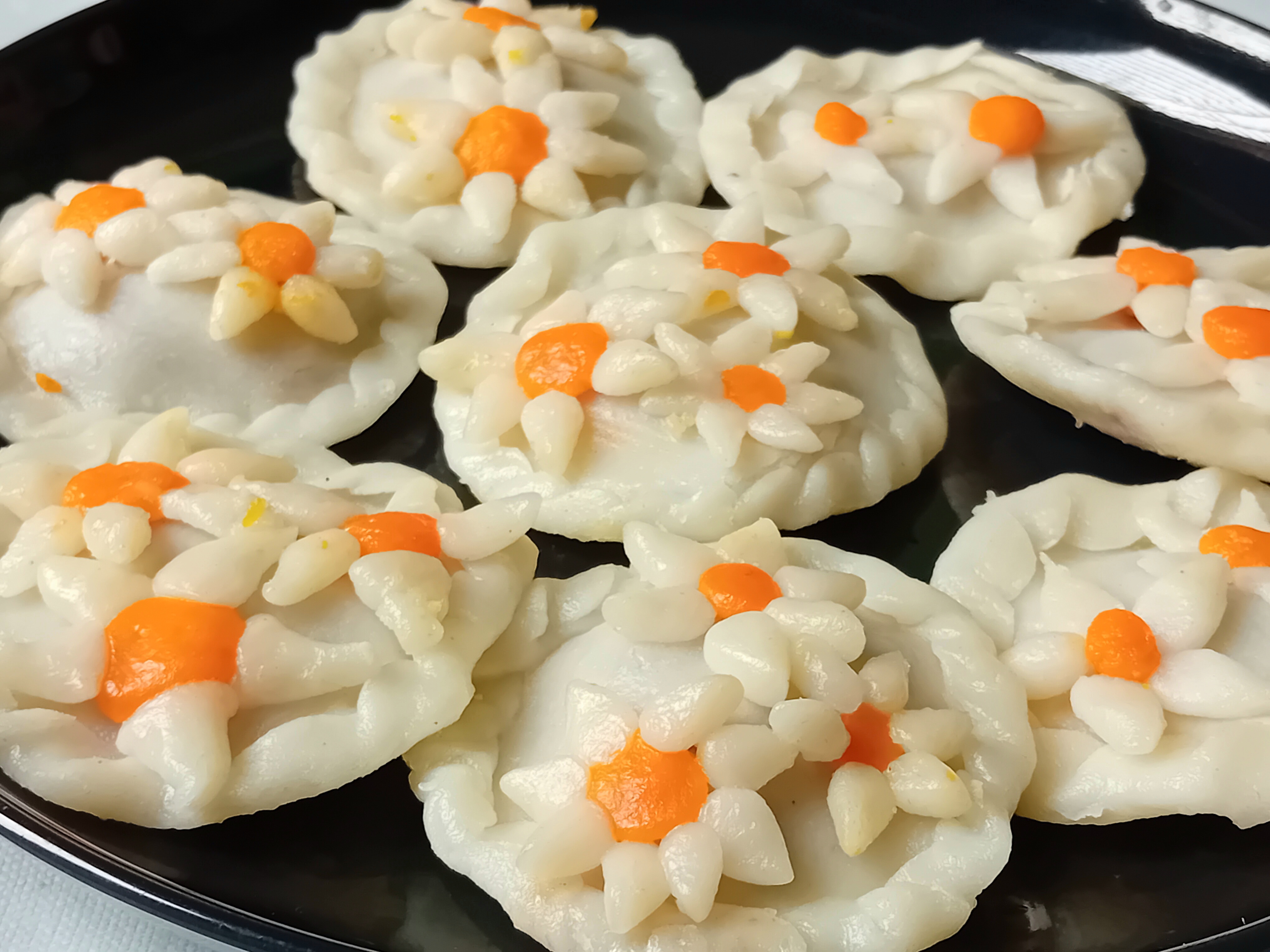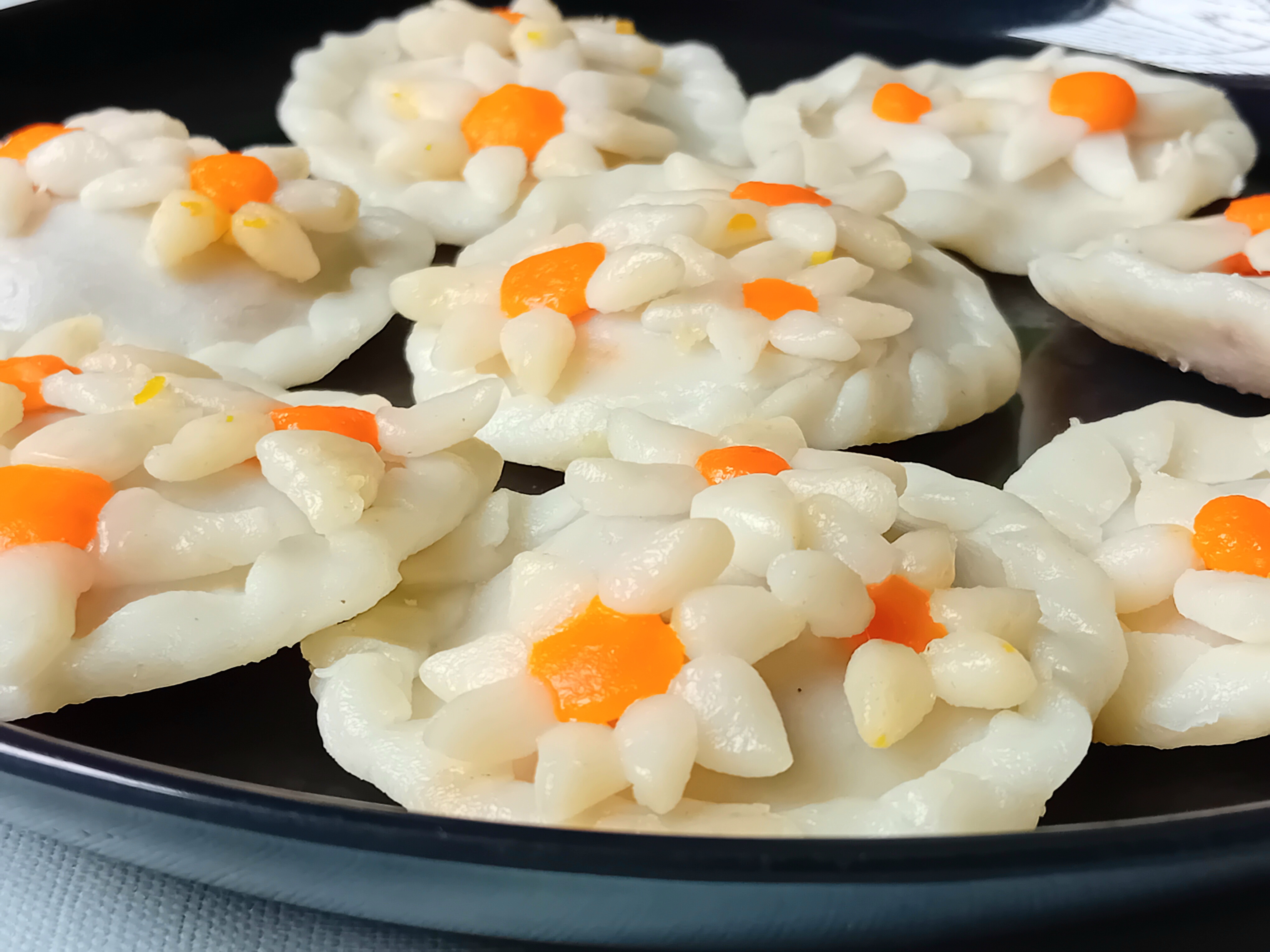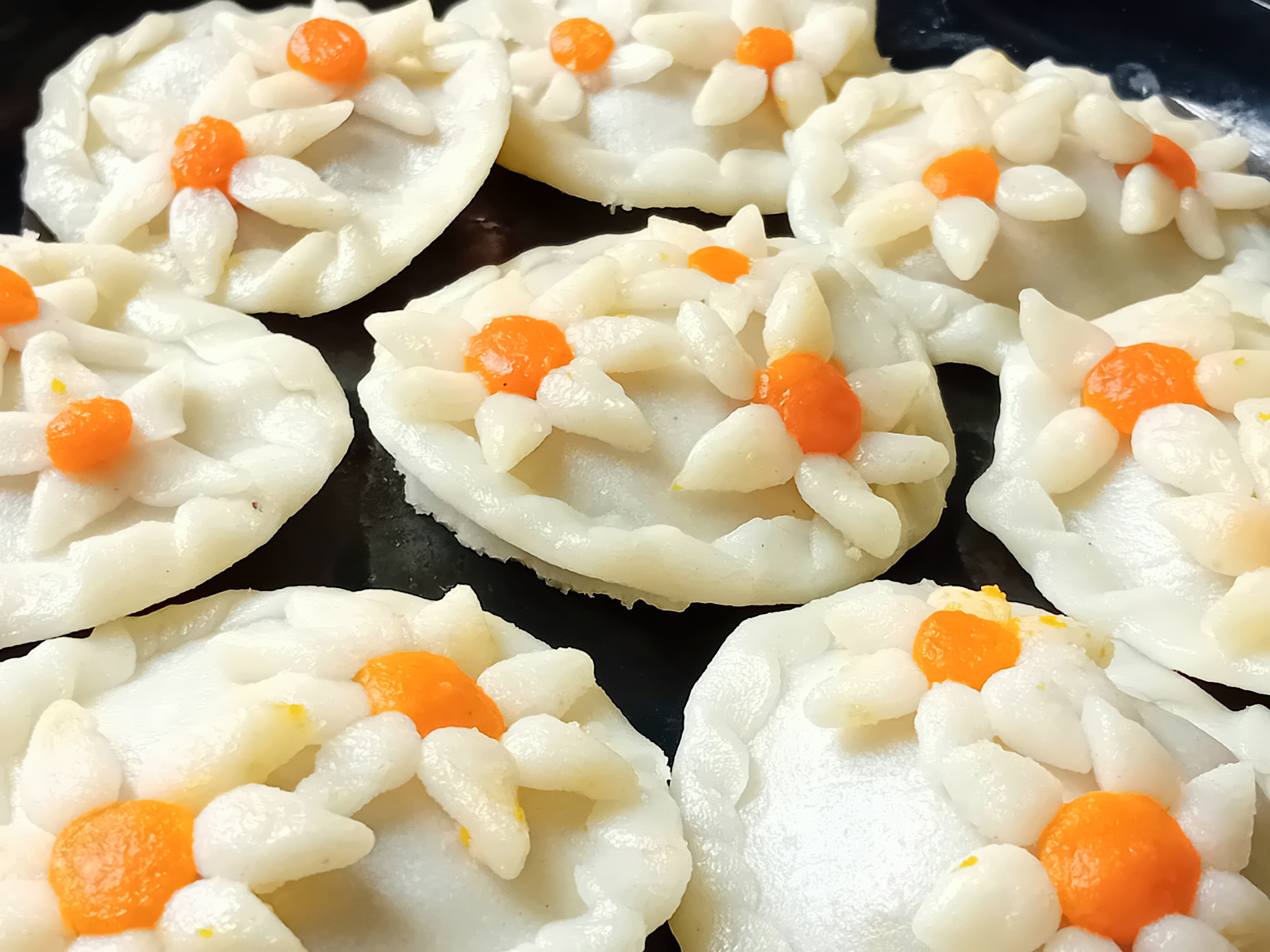 এভাবে আমি সবগুলো পলি পিঠার উপর শিউলি ফুলের মত ছোট ছোট ফুল তৈরি করে নিয়েছি।
