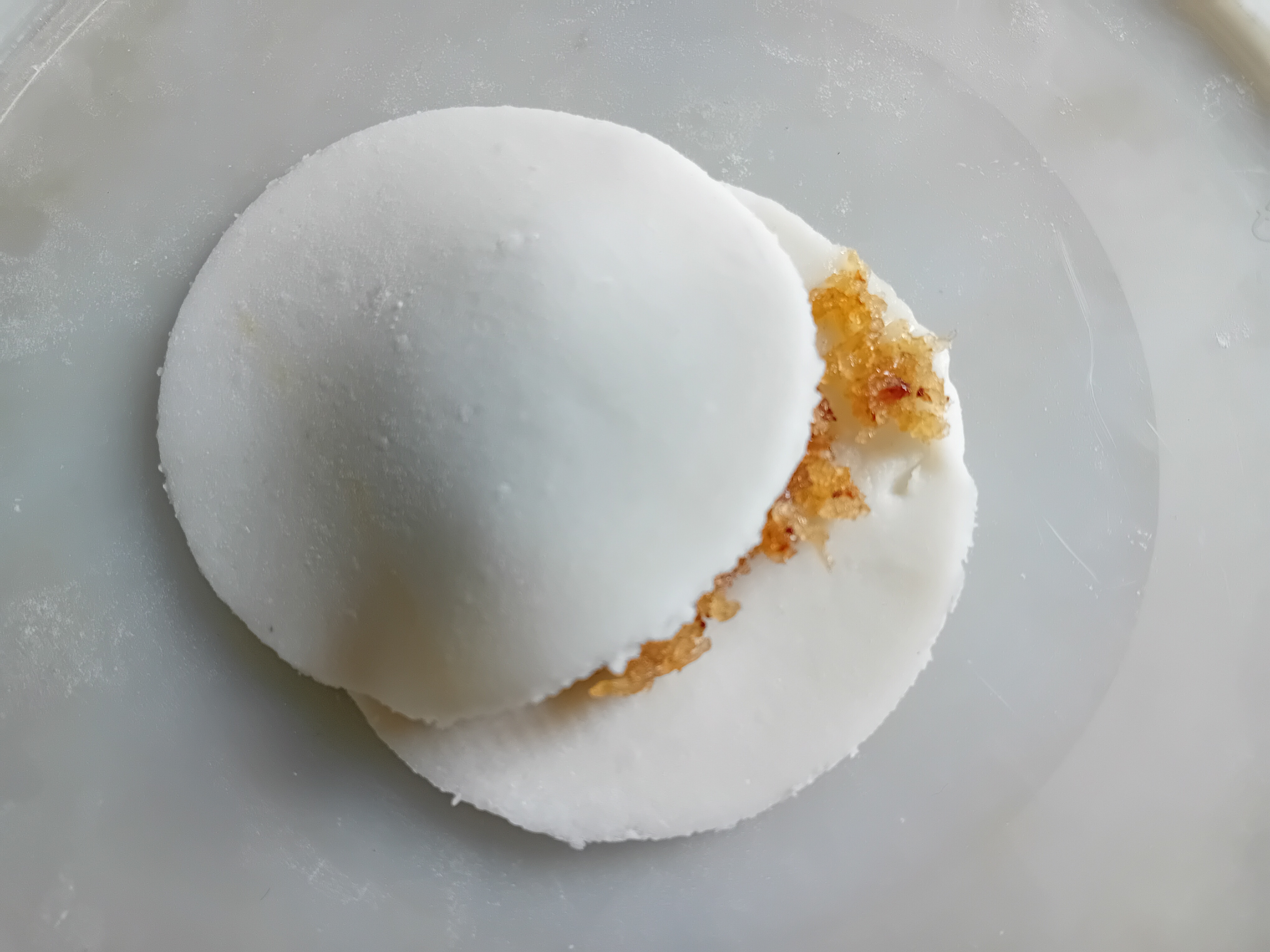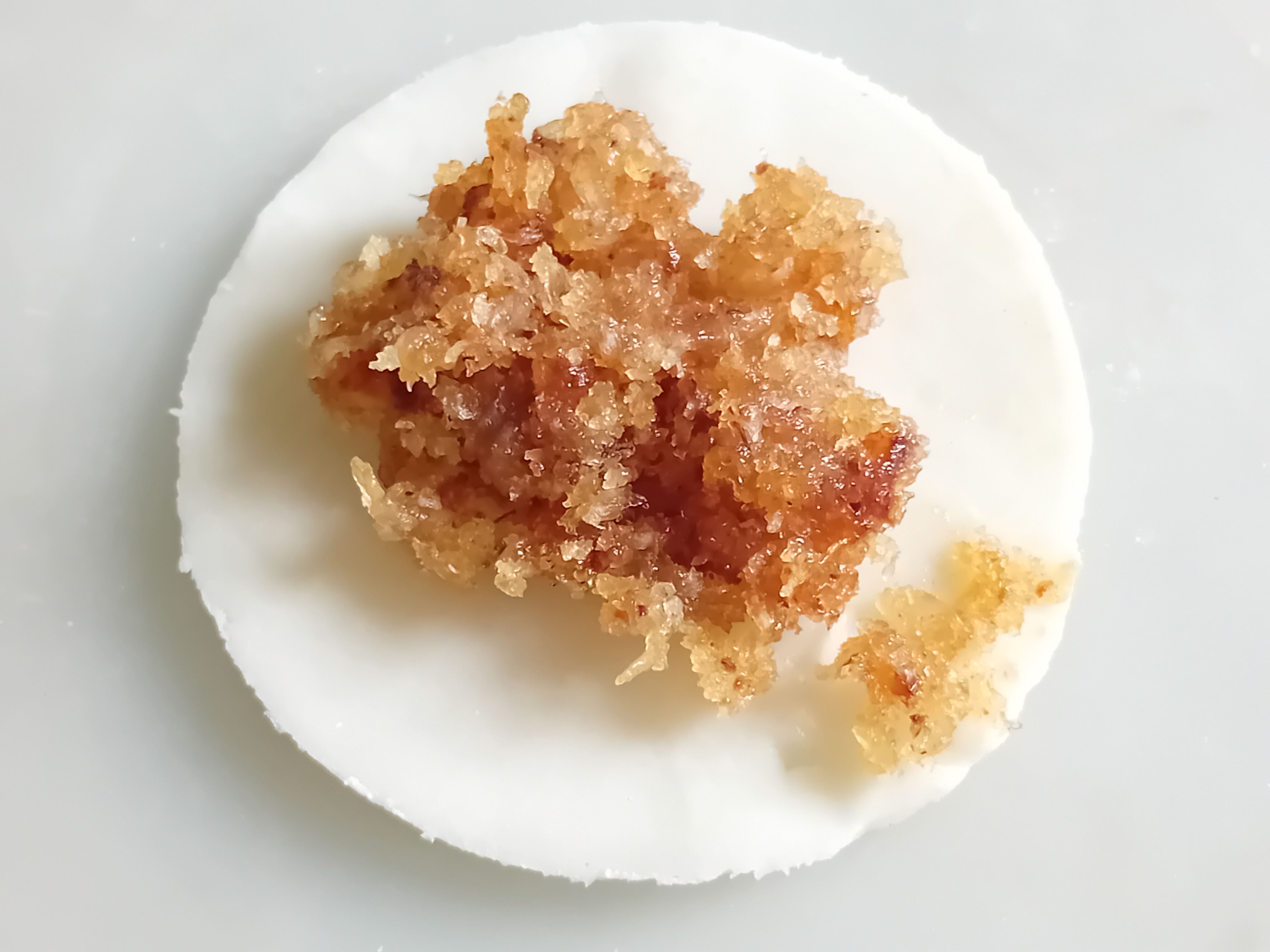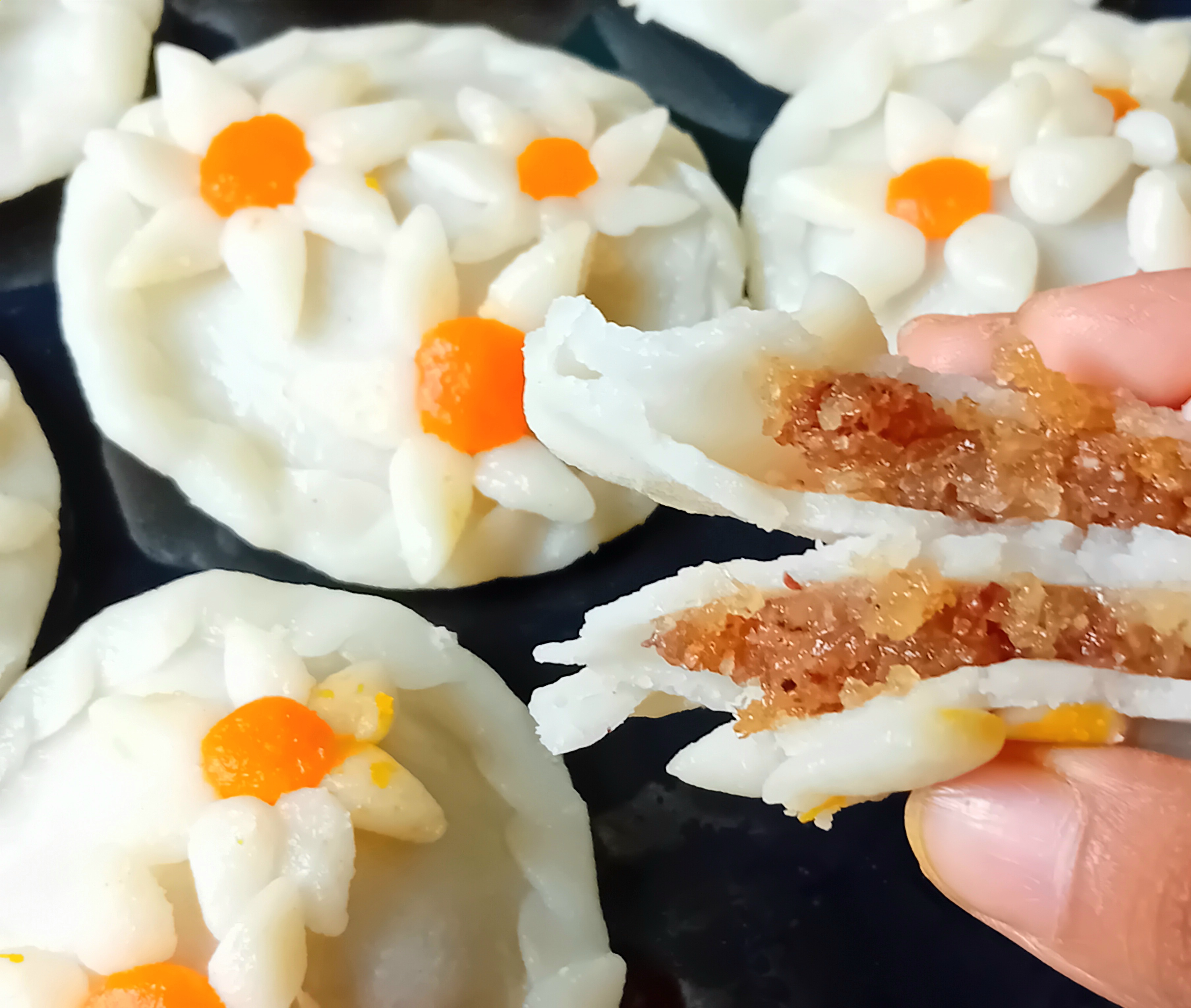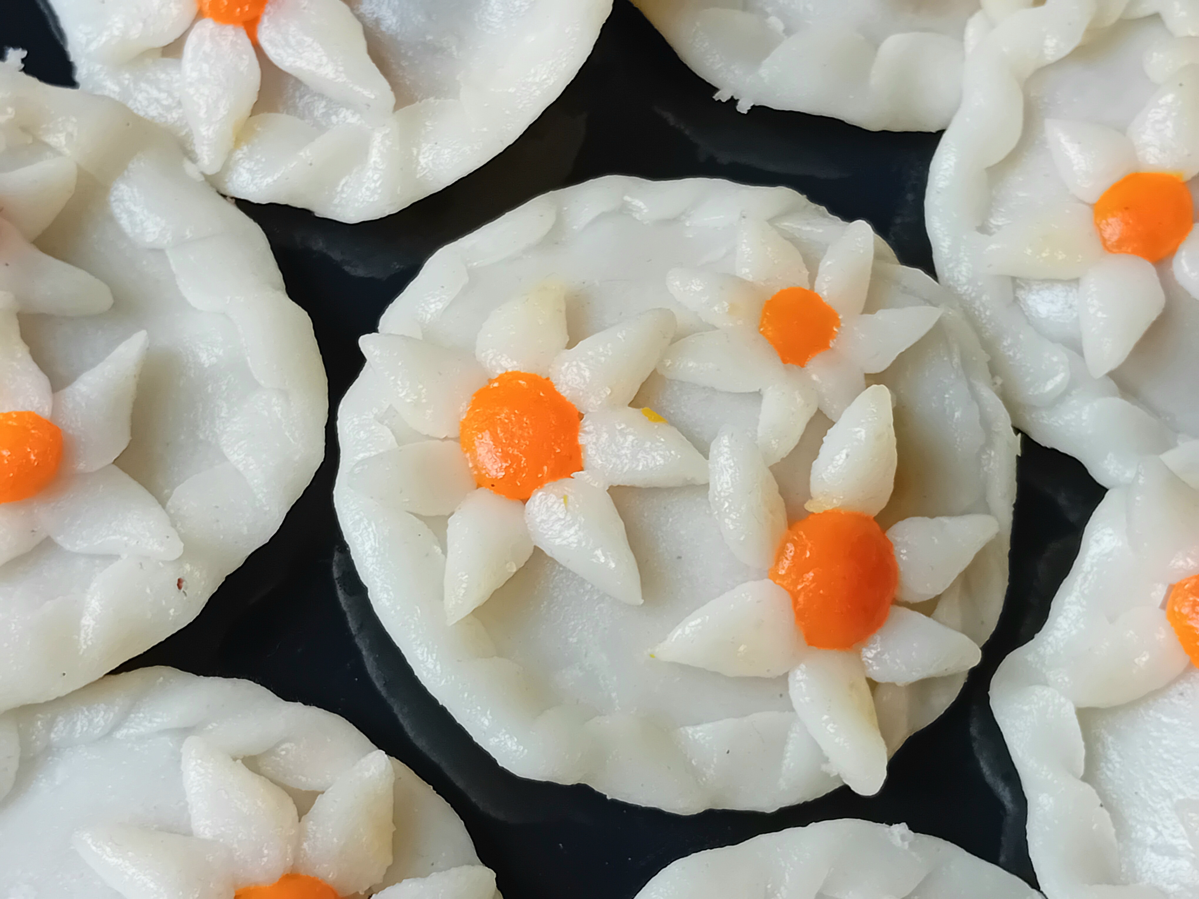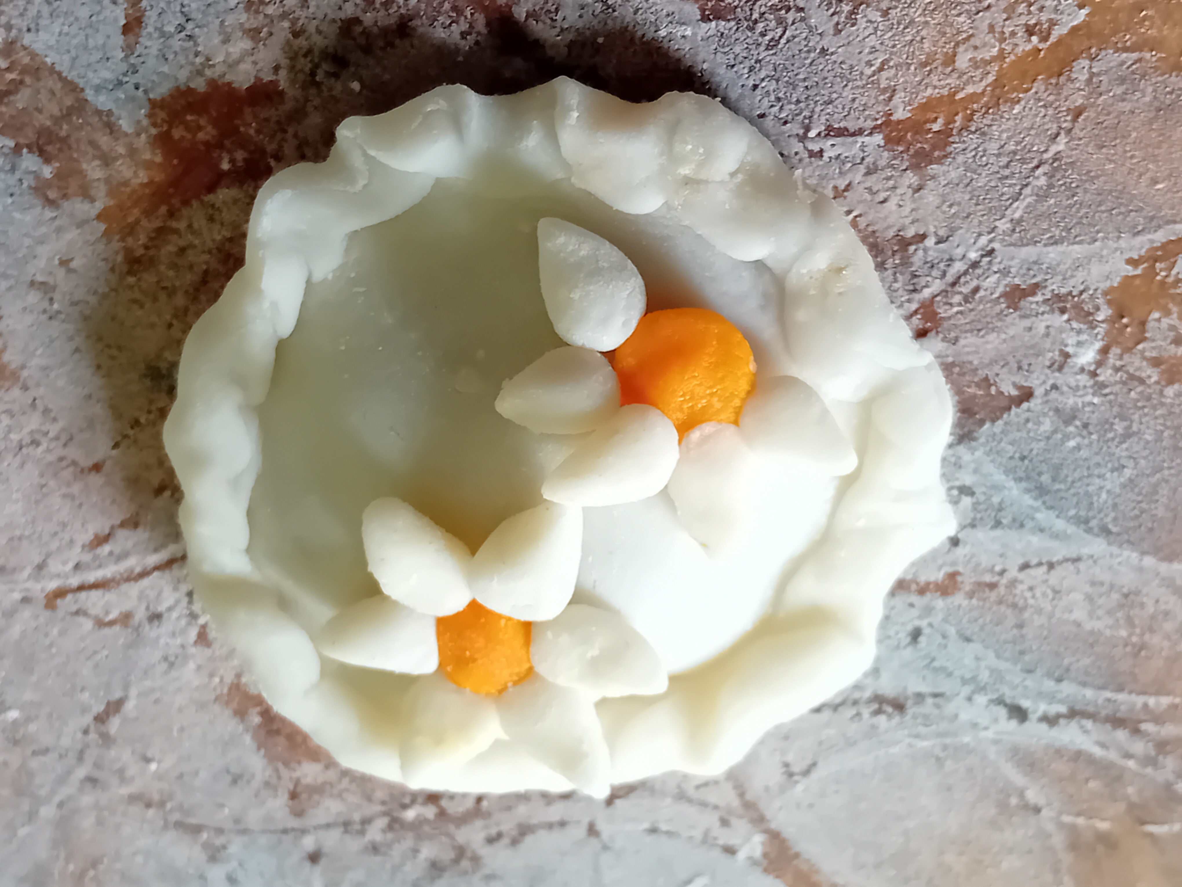 এবার জর্দার রং দিয়ে মিক্স করা ডো টুকু পিঠার উপর বসিয়ে দিলাম এবং এর চারপাশে ছোট ছোট পাপড়ি তৈরি করে দিয়ে দিলাম।