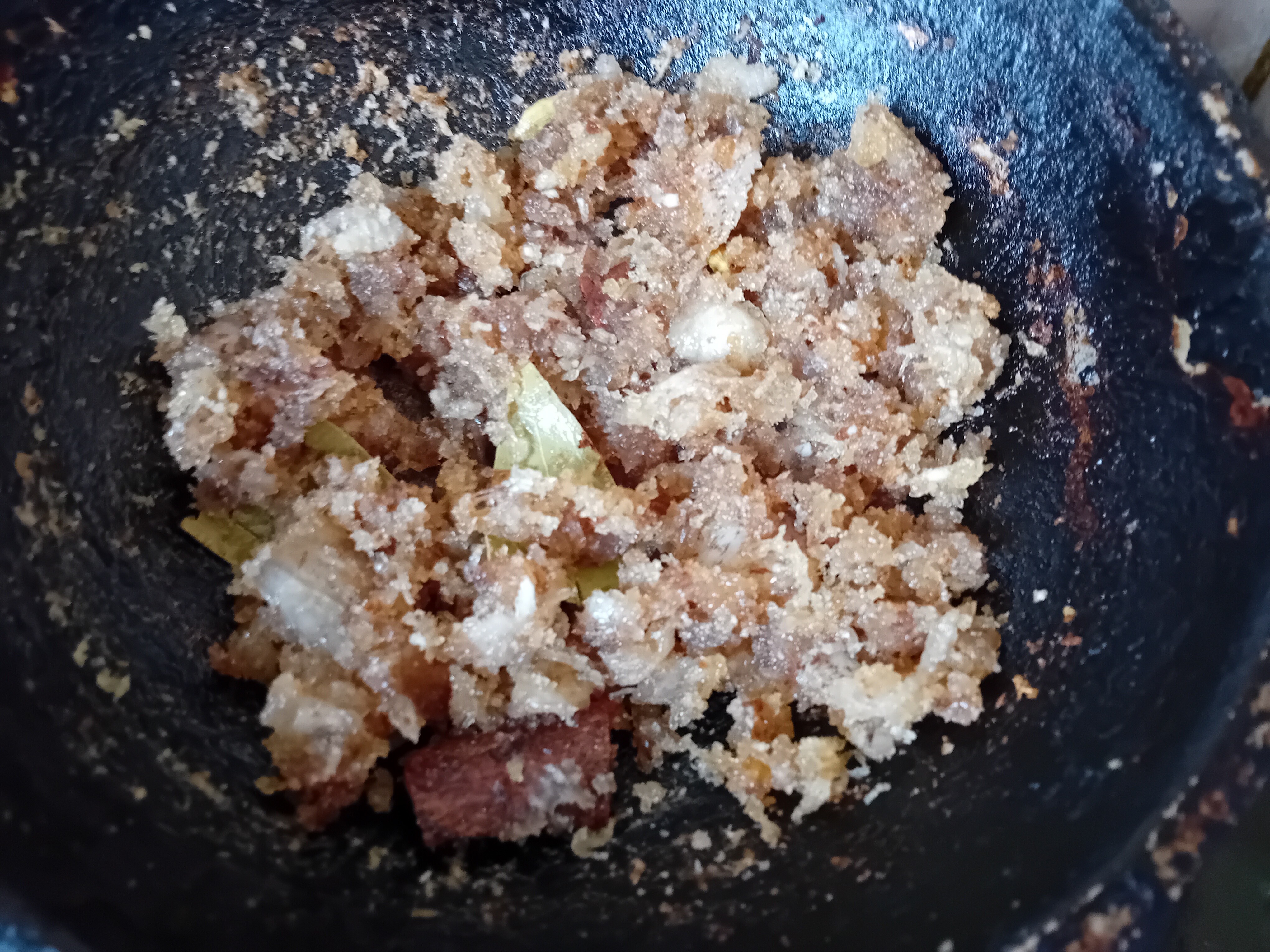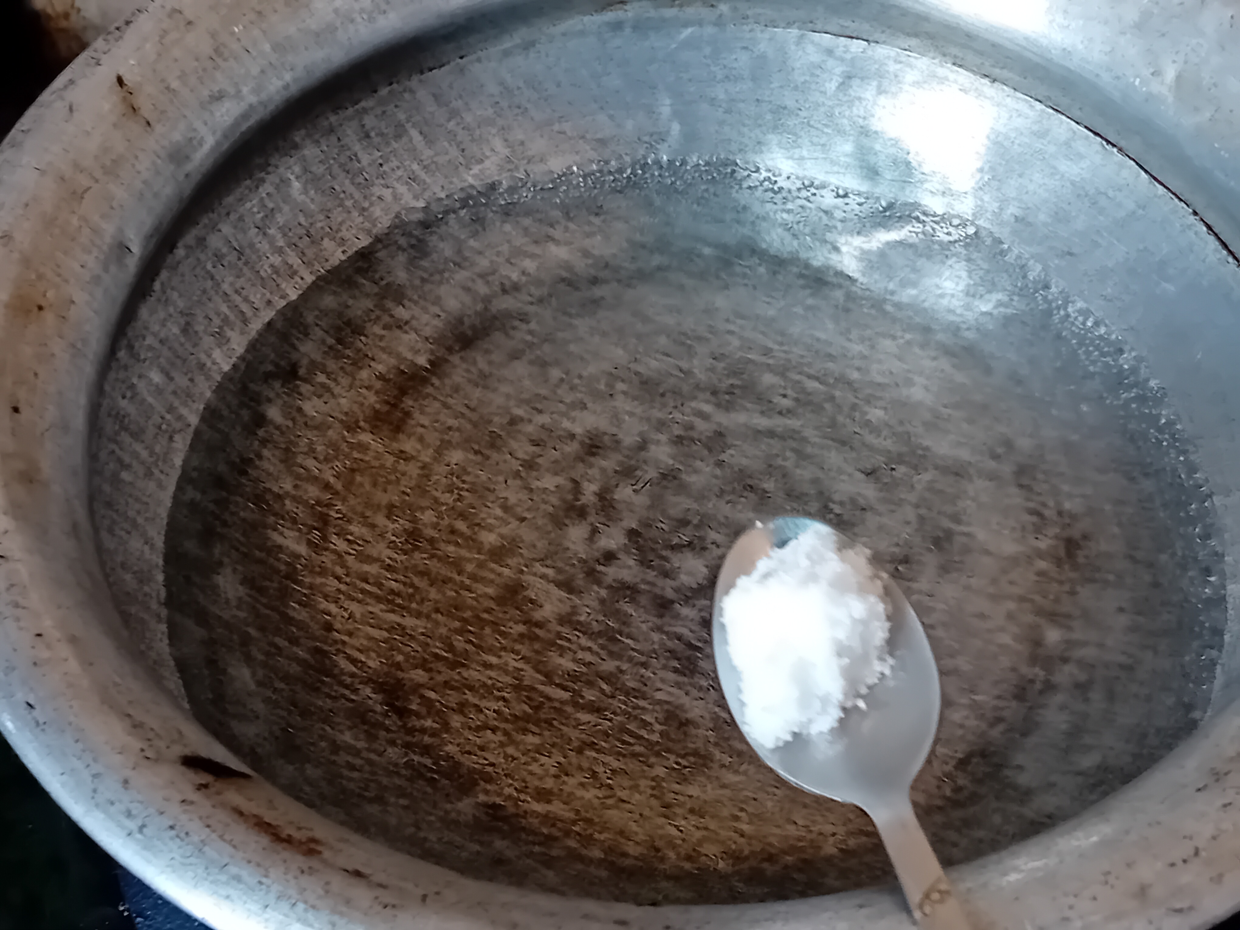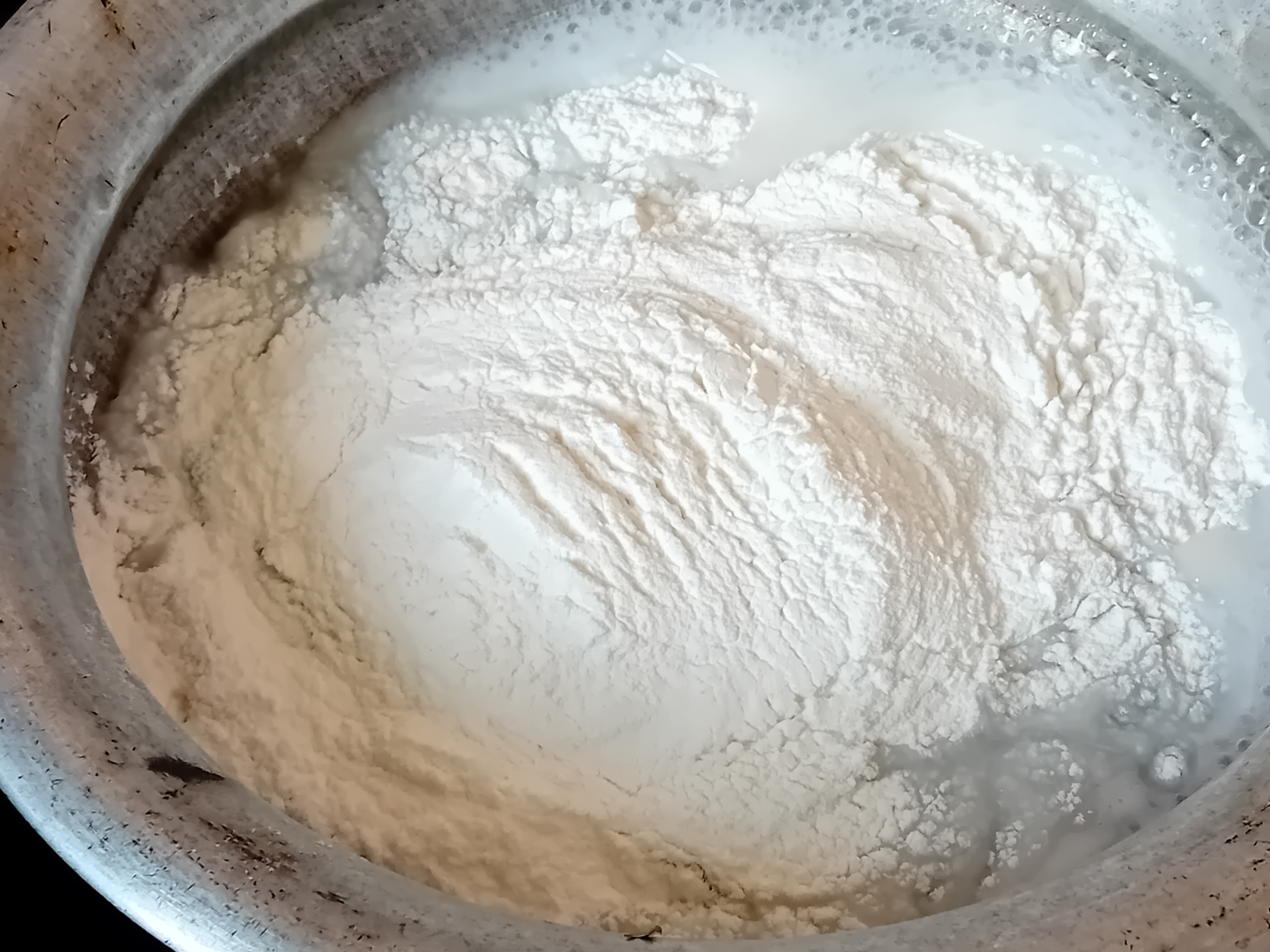 এবার একটা পাতিলে পরিমাণ মতো পানি গরম করে নিয়েছি। এখানেও পরিমাণমতো লবণ দিয়ে দিলাম। তারপর যতটুকু পরিমাণ পানি দিয়েছি কাপ মেপে ততটুকু পরিমাণ চাউলের গুড়ো দিয়ে দিলাম।