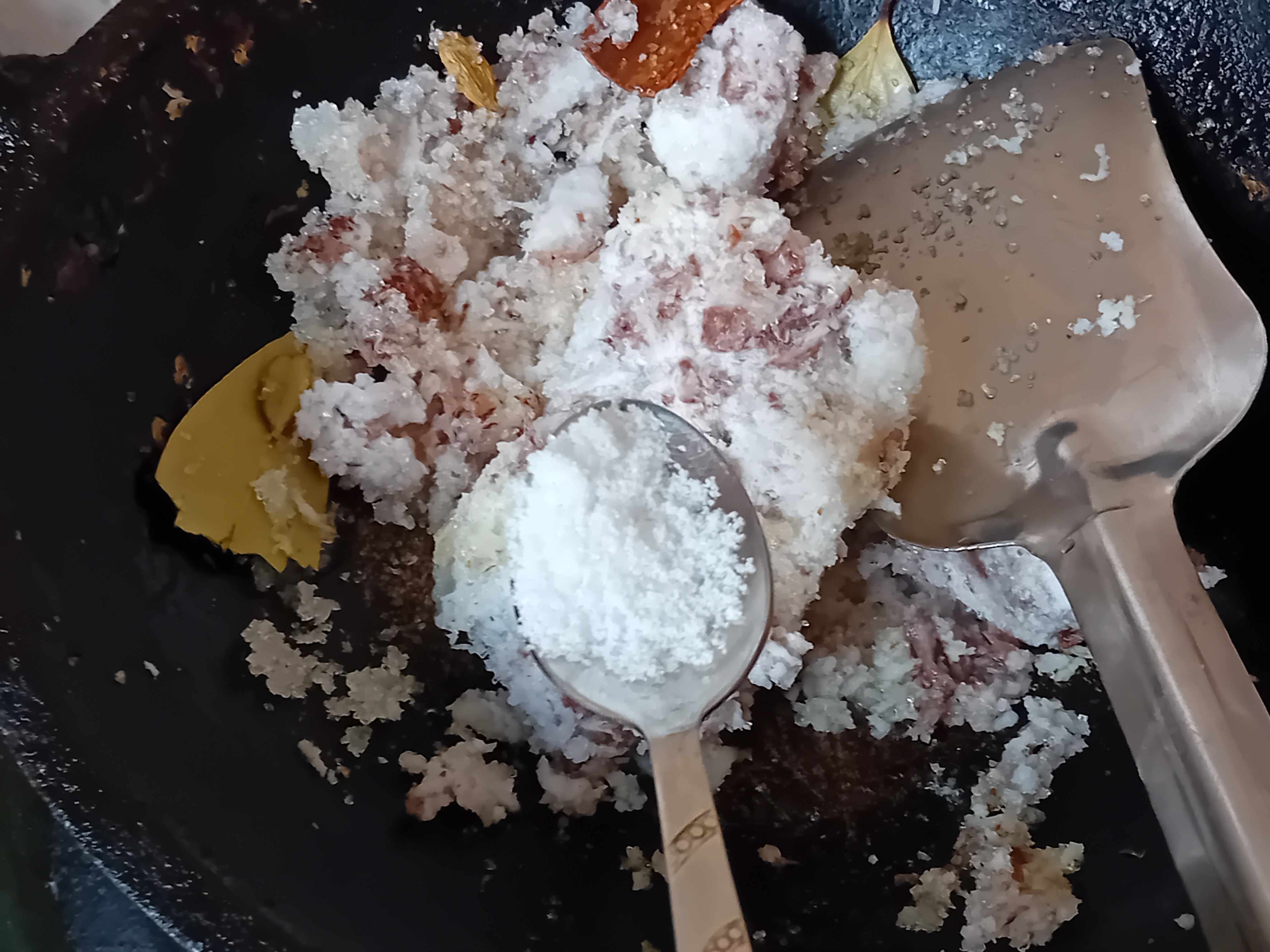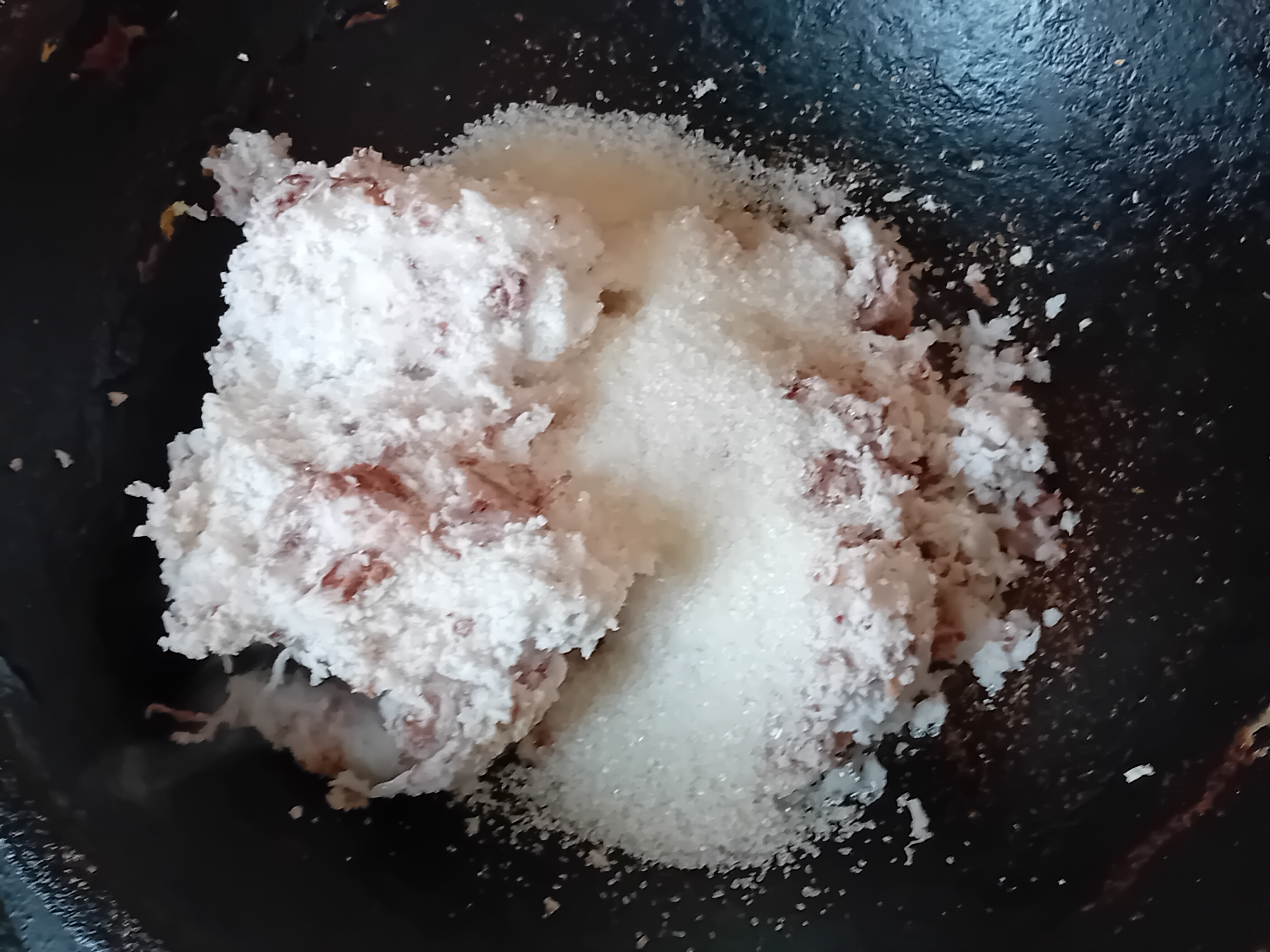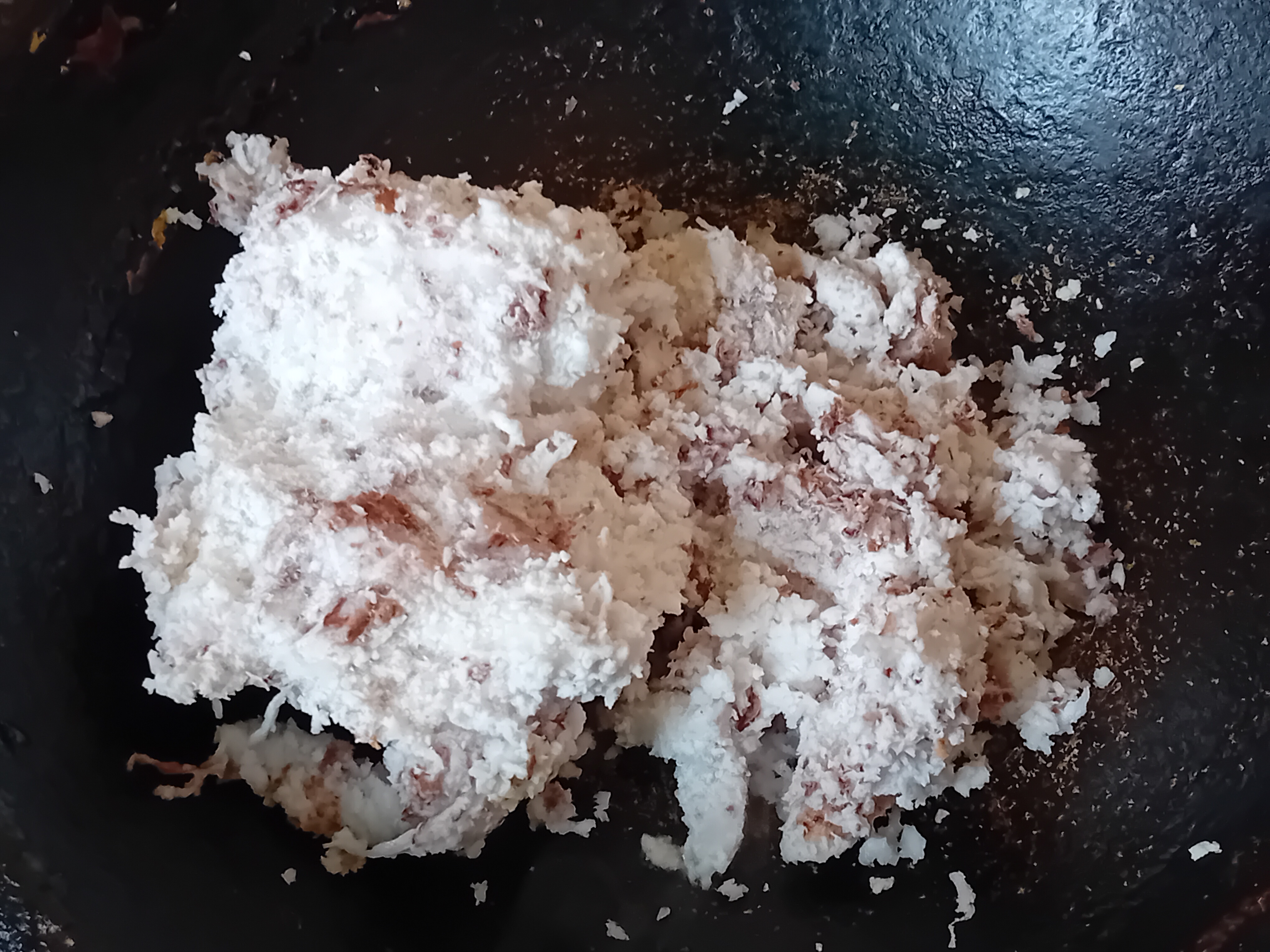 প্রথমে আমি একটা কড়াই চুলার উপর বসিয়ে দিলাম। এরপর সেখানে কোরানো নারকেল দিয়ে দিলাম। তারপর সেখানে দিয়ে দিলাম পরিমাণ মতো চিনি