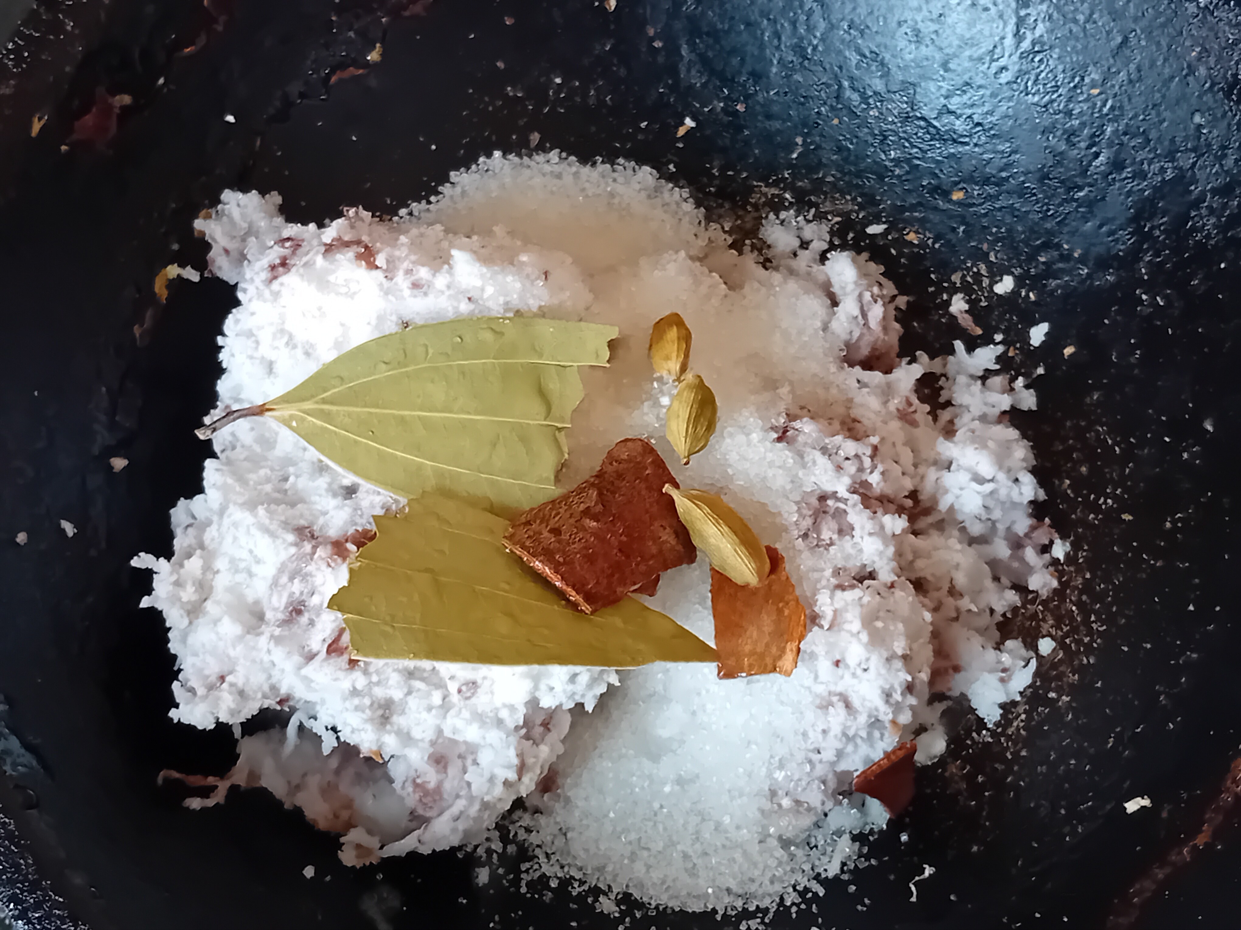 চিনি দেওয়ার পর সেখানে দারচিনি, এলাচ এবং তেজপাতা দিয়ে দিলাম। এরপর পরিমাণ মতো কিছুটা লবণ দিয়ে দিয়েছি।