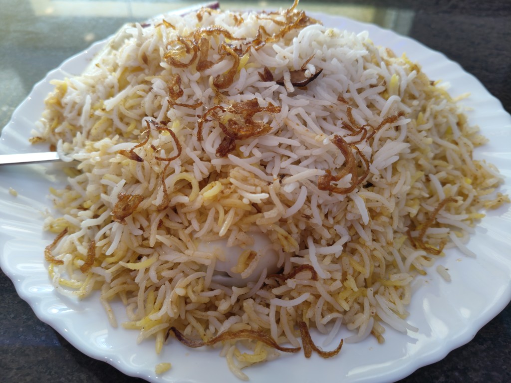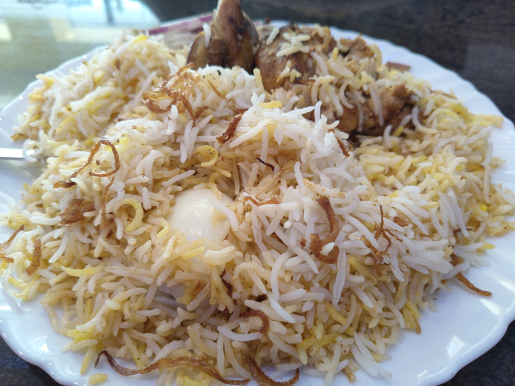অর্ডার দেওয়ার অল্প সময় বাদে বিরিয়ানির থালা এসে হাজির। বিরিয়ানির সাজগোজ মন্দ নয়, ওপরে অনেকটা বেরেস্তা সাজানো। ভেতরে হাত দিতেই দু পিস চিকেন, একটা সেদ্ধ ডিম, একটা আলু বেরিয়ে এলো সাথে পর্যাপ্ত পরিমাণে ভাত তো আছেই। চামচ সরিয়ে হাত দিয়ে প্রথম গ্রাস মুখে তুললাম, স্বাদ মন্দ নয় তবে আহামরি কিছুও নয়। কলকাতা ঘরানার বিরিয়ানির মতো ভাতের দানা গুলো একটু শুষ্ক। সব মিলিয়ে, তবে ৬/১০।