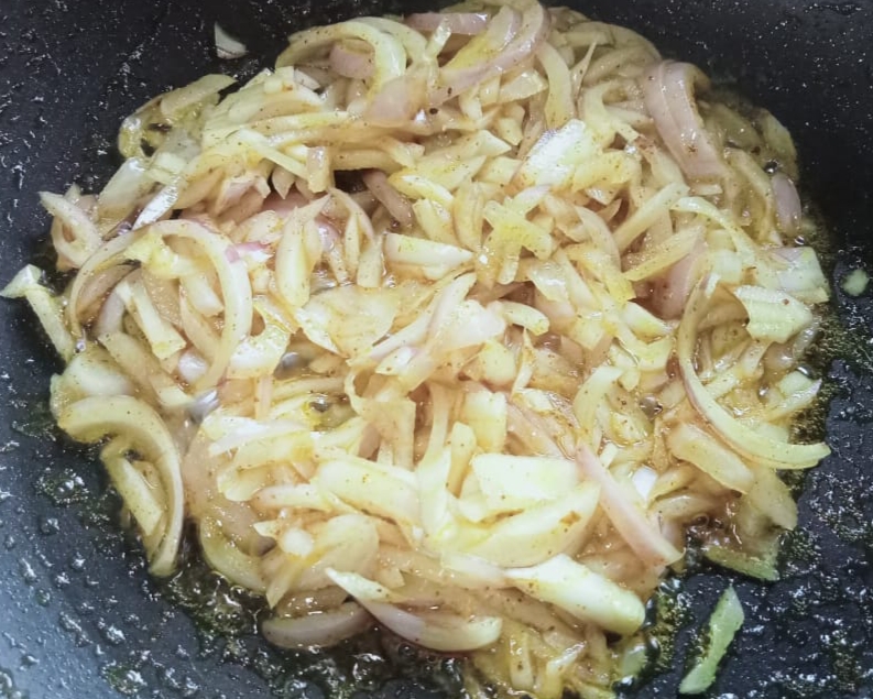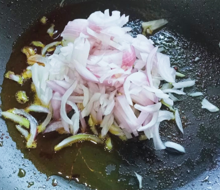 এবার মরিচ গুলো ভেজে নেয়ার পর, পেঁয়াজ কুচি গুলো হালকাভাবে ভেজে নিতে হবে।