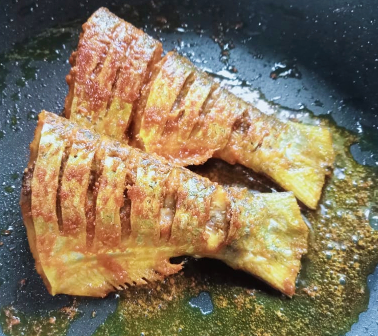 এবার সয়াবিন তেল গুলো গরম হয়ে আসলে, মাখিয়ে নেয়া মাছ গুলো কড়াইতে ছেড়ে দিতে হবে। তারপর মাছের এপিঠ ওপিঠ ভেজে আলাদা একটি পাত্রে তুলে নিতে হবে।