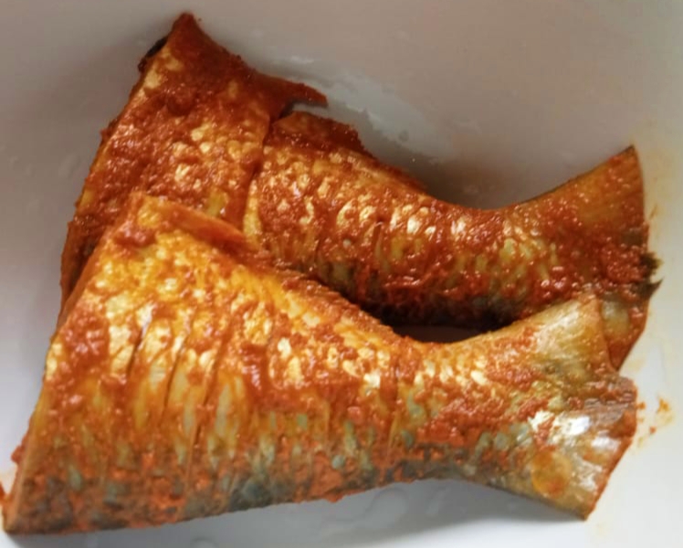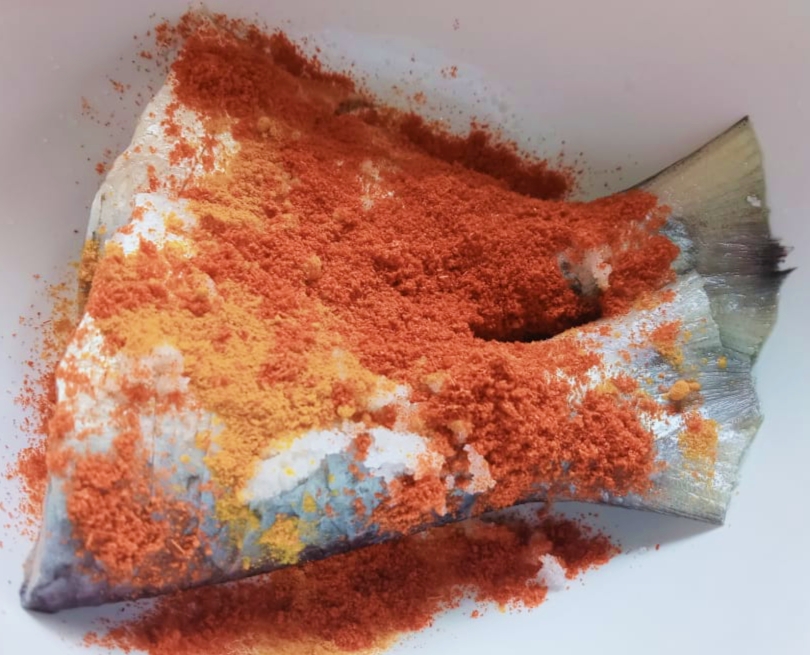 এবার পরিষ্কার করে নেয়া মাছের উপরে পরিমাণ মতো শুকনা মরিচ গুঁড়া, হলুদ গুঁড়া ও জিরার গুঁড়া ছড়িয়ে দিয়ে হাতের সাহায্যে ভালোভাবে নেড়েচেড়ে নিতে হবে।