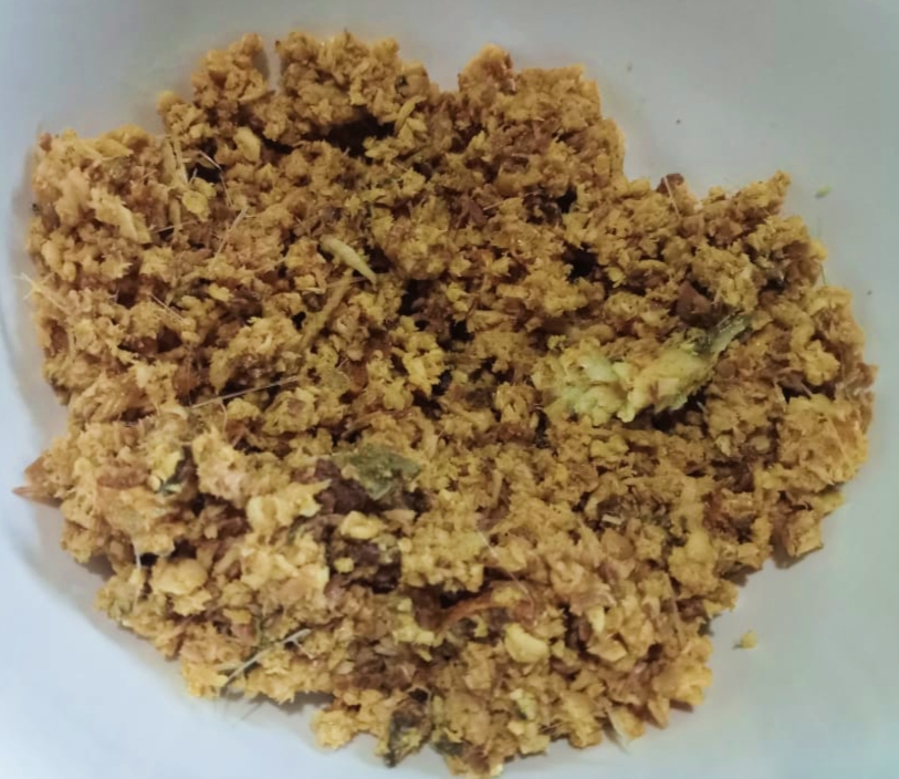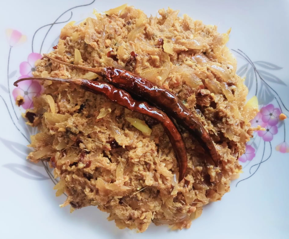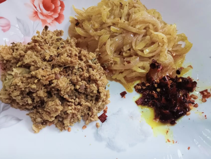এবার ভাজা শুকনা মরিচ, ভাজা পেয়াজ, লবণ ও বাছা মাছ, সবগুলো একটি বড় পাত্রে নিতে হবে মাখানোর জন্য।