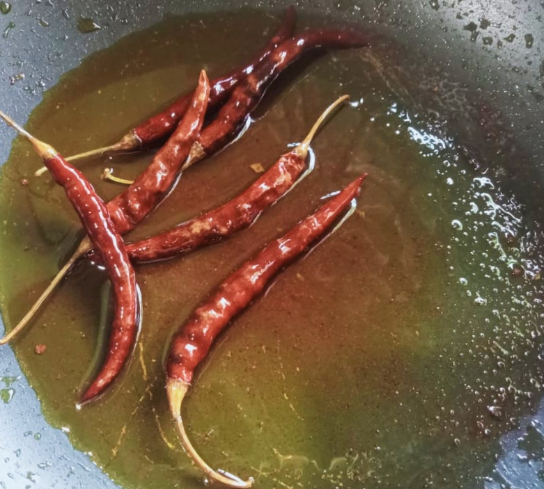 এবার মাছ গুলো তুলে নেয়ার পর কড়াইতে শুকনা মরিচ গুলো ভেজে নিতে হবে।