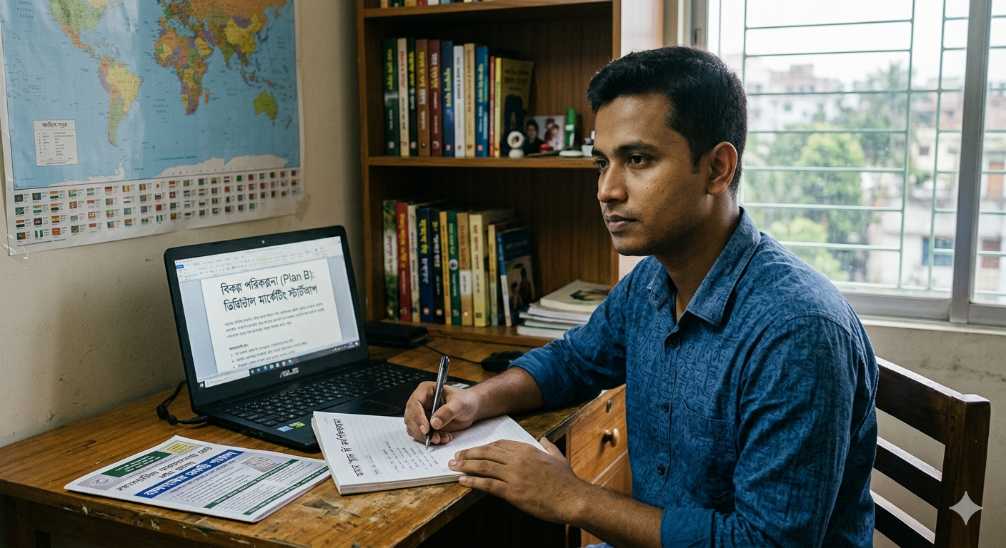 কিভাবে একটি কার্যকর 'প্ল্যান বি' তৈরি করবেন?বিকল্প পরিকল্পনা মানেই এই নয় যে আপনাকে একদম ভিন্ন কিছু করতে হবে। এটি হতে পারে আপনার মূল কাজের সাথে সম্পর্কিত কোনো দক্ষতা বা অন্য কোনো ভালো লাগার জায়গা।নিজের দক্ষতা বিশ্লেষণ করুন: আপনার মূল পেশার বাইরে আর কী কী কাজে আপনি দক্ষ, তা খুঁজে বের করুন।বাজার পর্যবেক্ষণ করুন: বর্তমানে কোন ধরনের দক্ষতার চাহিদা ভবিষ্যতে বাড়বে, সেদিকে নজর রাখুন।আর্থিক সঞ্চয়: আর্থিক ব্যাকআপ রাখা 'প্ল্যান বি' এর একটি বড় অংশ। কঠিন সময়ে অন্তত ৬ মাসের খরচ চালানোর মতো সঞ্চয় রাখা উচিত।শেখার মানসিকতা: সবসময় নতুন কিছু শেখার আগ্রহ রাখুন। আপনার অর্জিত কোনো জ্ঞানই কখনো বৃথা যাবে না।