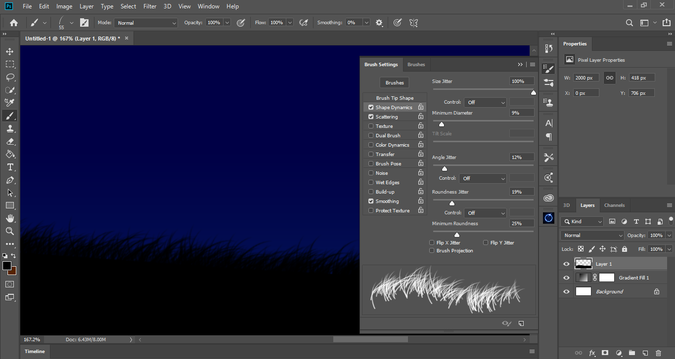 এবার আমি গ্রাউন্ড এর লেয়ার এ লিগাসি ব্রাশ টুল ব্যবহার করে ঘাস এঁকে দেই।