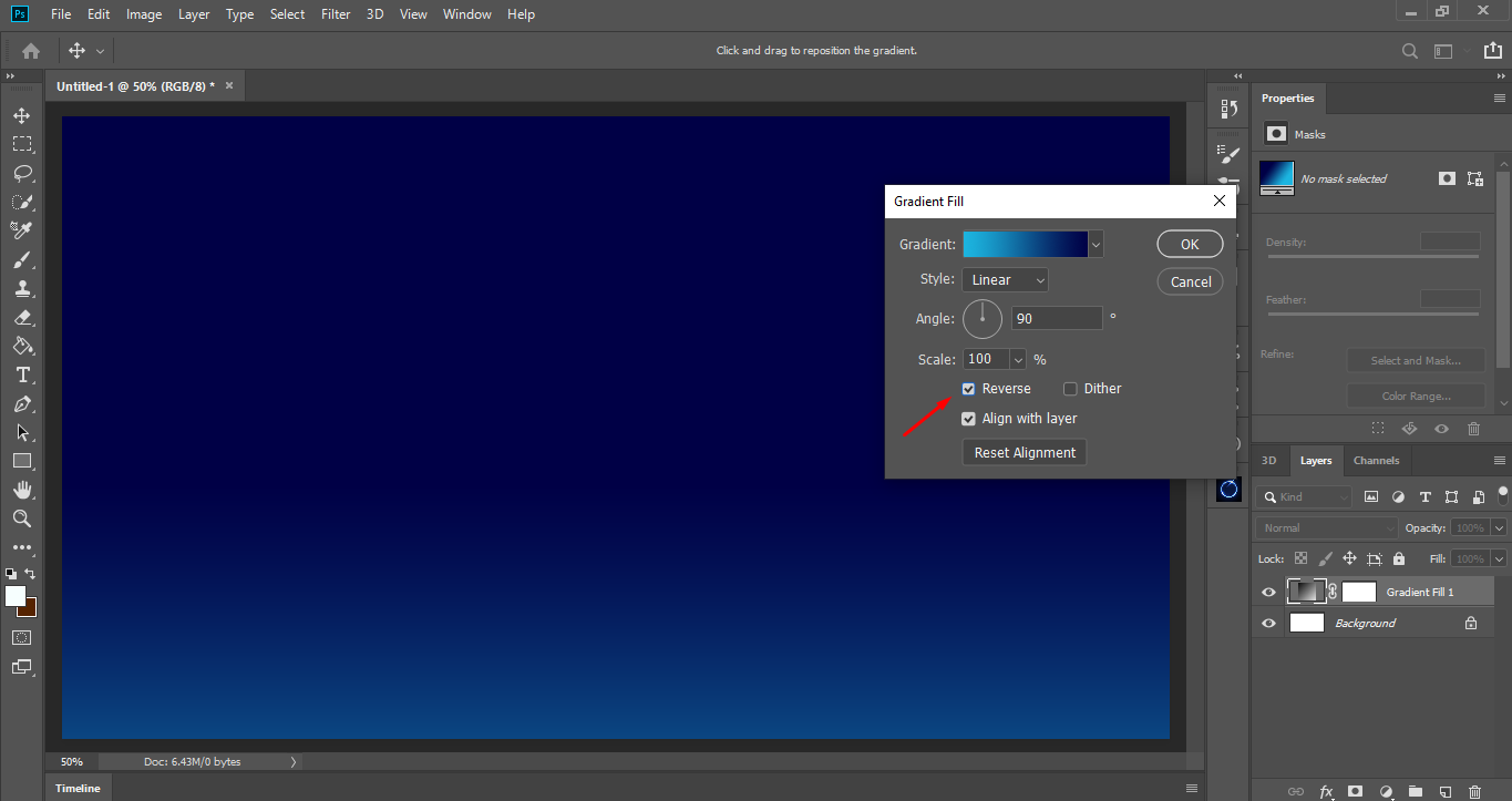 এবার নতুন একটি গ্র্যাডিয়েন্ট লেয়ার তৈরি করি তারপর সেটায় নীল ও হালকা নীল এর গ্র্যাডিয়েন্ট যুক্ত করি। তারপর সেটা রিভার্স করে দেই। এতে উপরে গাঢ় নীল আর নিচে হালকা নিল এর মতন থাকবে।