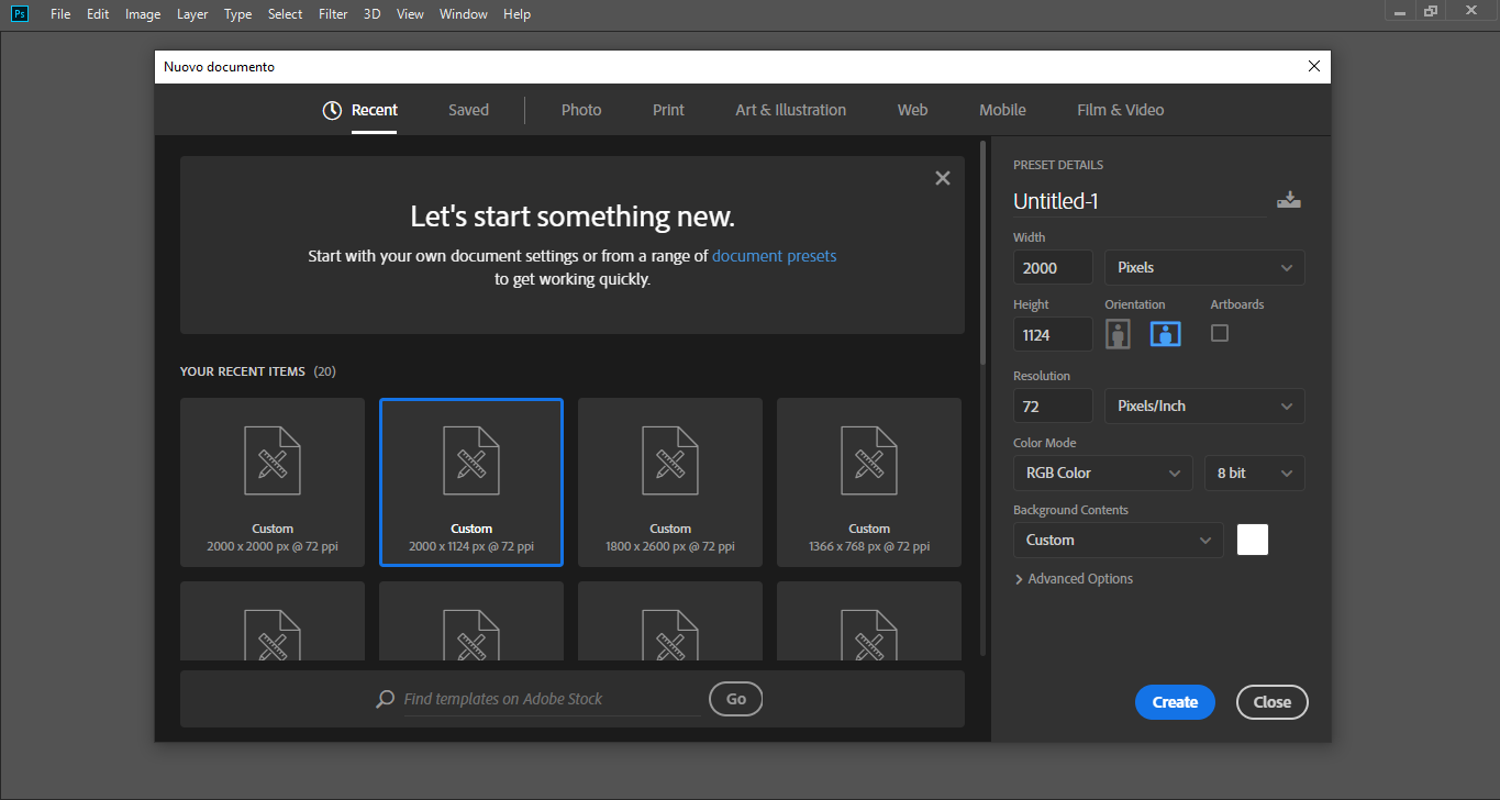 প্রথমে আমি ফটোশপ এপ্লিকেশনটি চালু করে নিউ মেনুতে যেয়ে একটি ব্যাকগ্রাউন্ড তৈরি করি। সাইজ রাখি ২০০০*১১২৪ পিক্সেল।