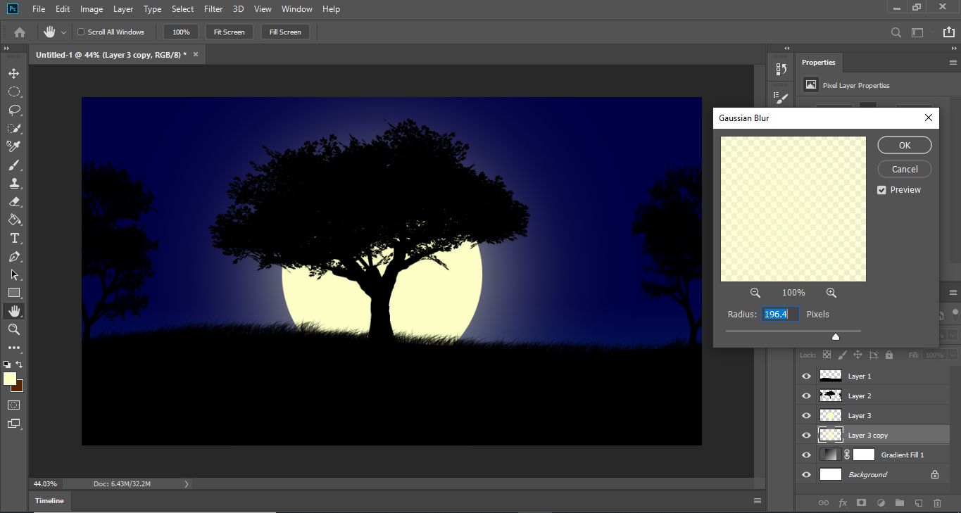 এবার আমি চাঁদ এর লেয়ার টি কপি করি। তারপর সেই কপি করা লেয়ার এ গোজিয়ান ব্লার ইফেক্ট যুক্ত করি। এটি চাঁদের গ্লো হিসেবে দেখাবে। সাইজ মত বাড়িয়ে কমিয়ে দেখতে হবে কোনটায় সুন্দর লাগে।