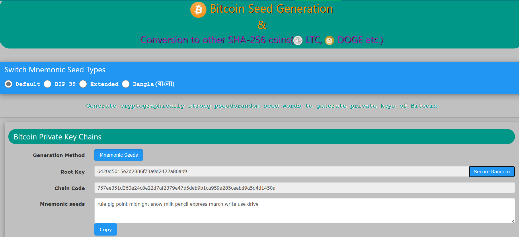 এটা ডিফল্ট সীডস পূর্বে যেটা ছিল । mnemonic array -তে ওয়ার্ড সংখ্যা ১৬২৬ ।