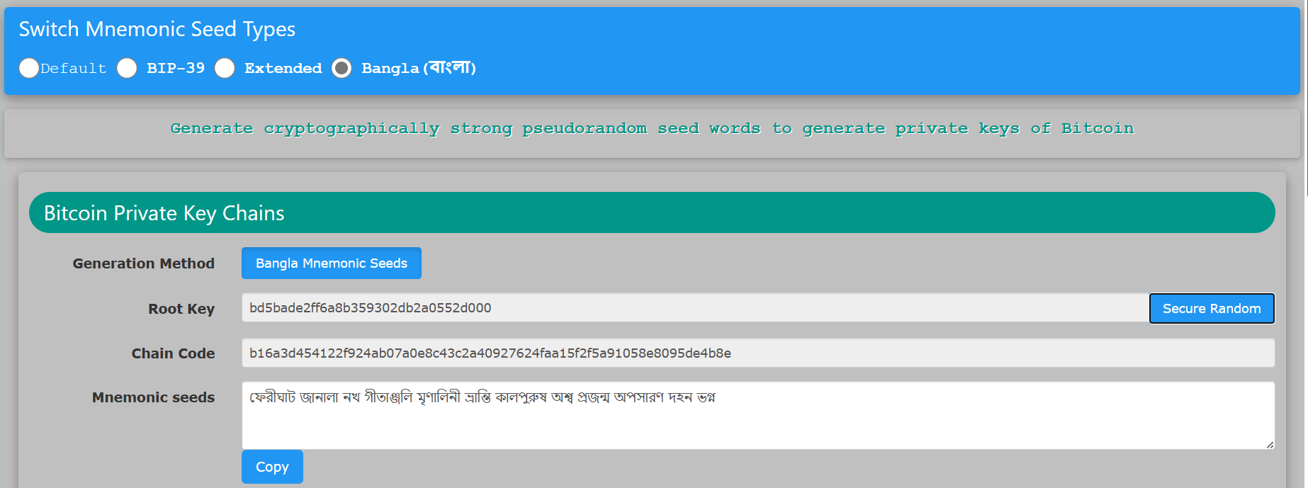 আর এটা Bangla সীডস । বাংলা ভাষার শব্দগুলি নিয়ে এই mnemonic ডিক্শনারি গঠিত । mnemonic array -তে ওয়ার্ড সংখ্যা ১৬৯২ ।