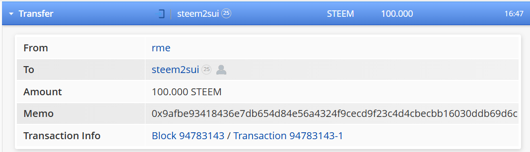➤নিচের স্ক্রিনশট দু'টি খুব ভালো করে লক্ষ করুন । আমি আমার একাউন্ট @rme থেকে 100 steem ট্রান্সফার করেছি @steem2sui একাউন্টে এবং memo হিসেবে আমার SUI এডড্রেসটি দিয়েছি ।