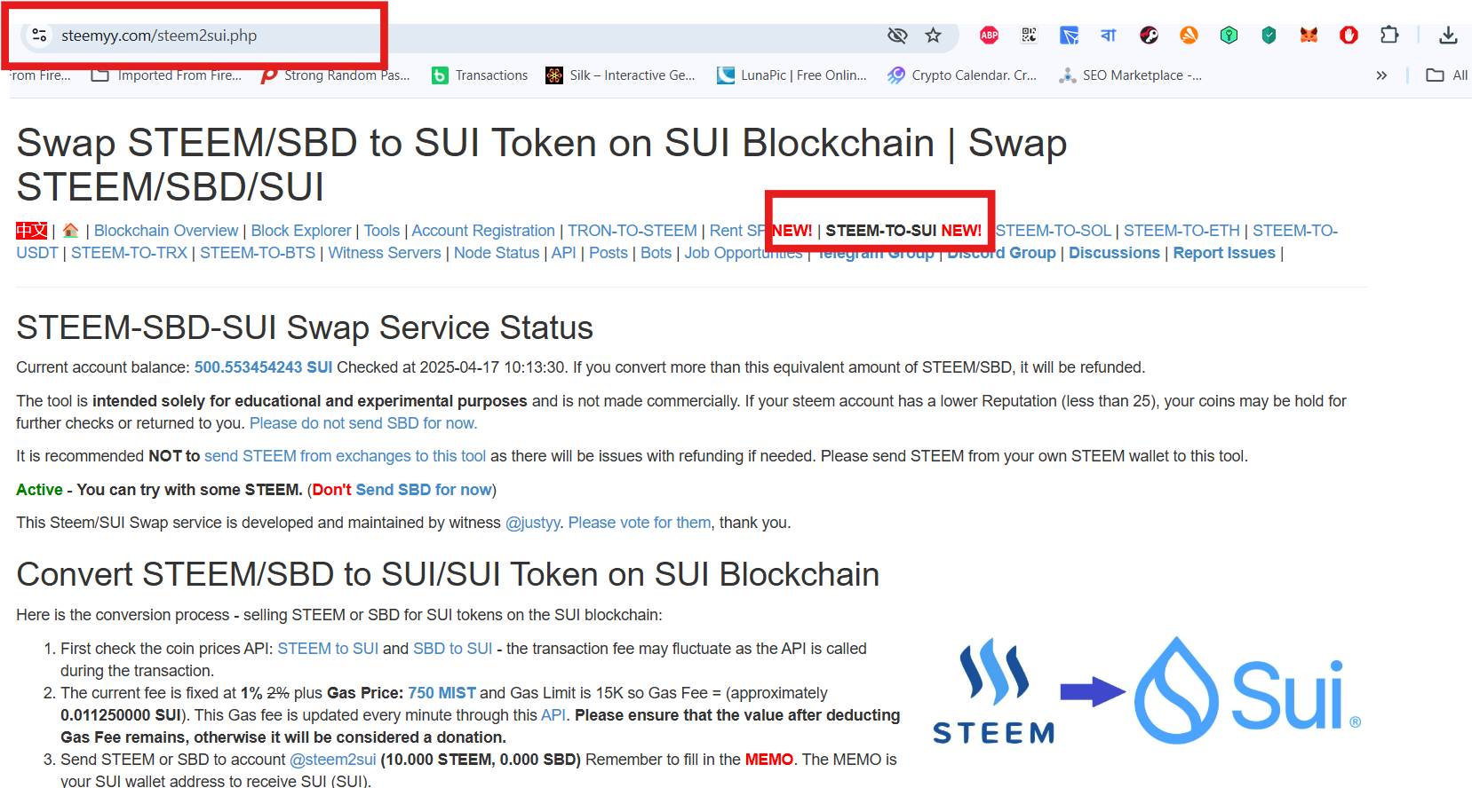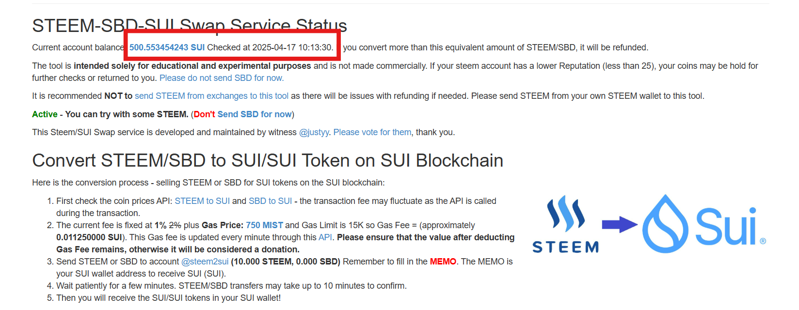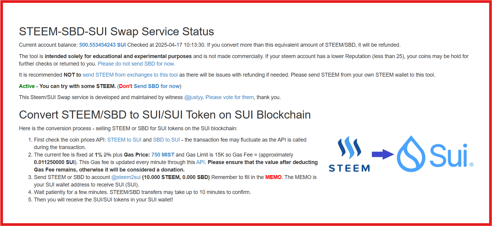 স্টিমিটের উইটনেস এবং ডেভেলপার @justyy র এক অসাধারণ স্টিম-সুই অটো এক্সচেঞ্জ টুল : "STEEM-TO-SUI"