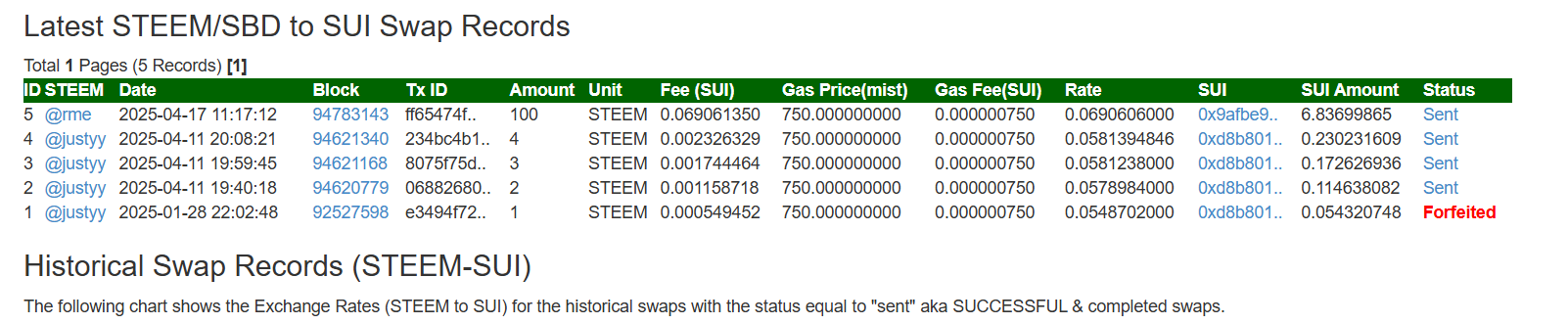 ➤ ট্রান্সফার করার পরে আপনার এক্সচেঞ্জটির স্ট্যাটাস পেতে "Latest STEEM/SBD to SUI Conversion Records" সেকশন এ চেক করুন । steem ট্রান্সফার করার পরে ১-২ মিনিট পরে পেজটি রিফ্রেশ করুন ।