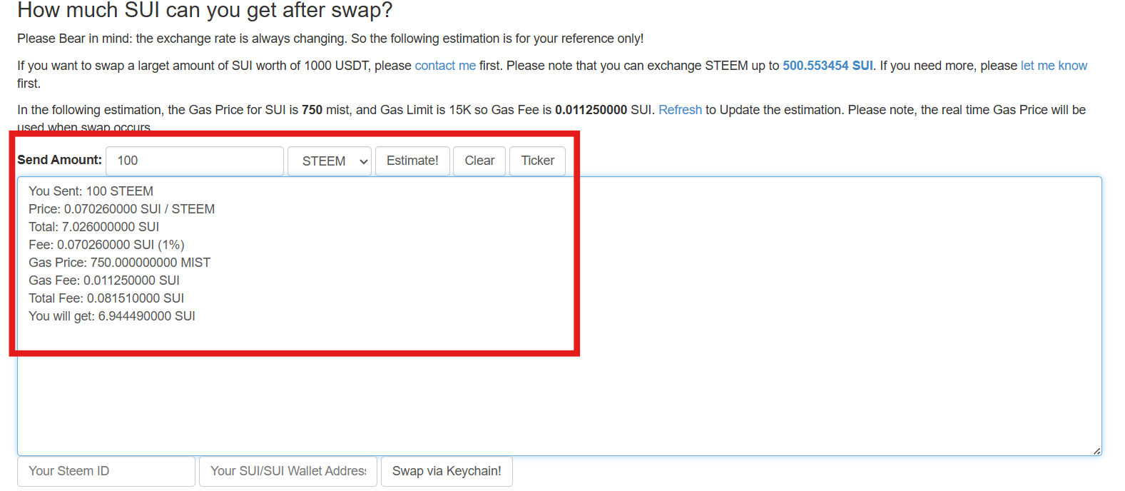 মনে রাখবেন এই এস্টিমেশনটা কিন্তু STEEM/SUI পেয়ারে প্রাইস ওঠা নামার উপরে ডিপেন্ডেড । তাই প্রত্যেক মিনিটে এটা চেঞ্জ হতে থাকবে ।