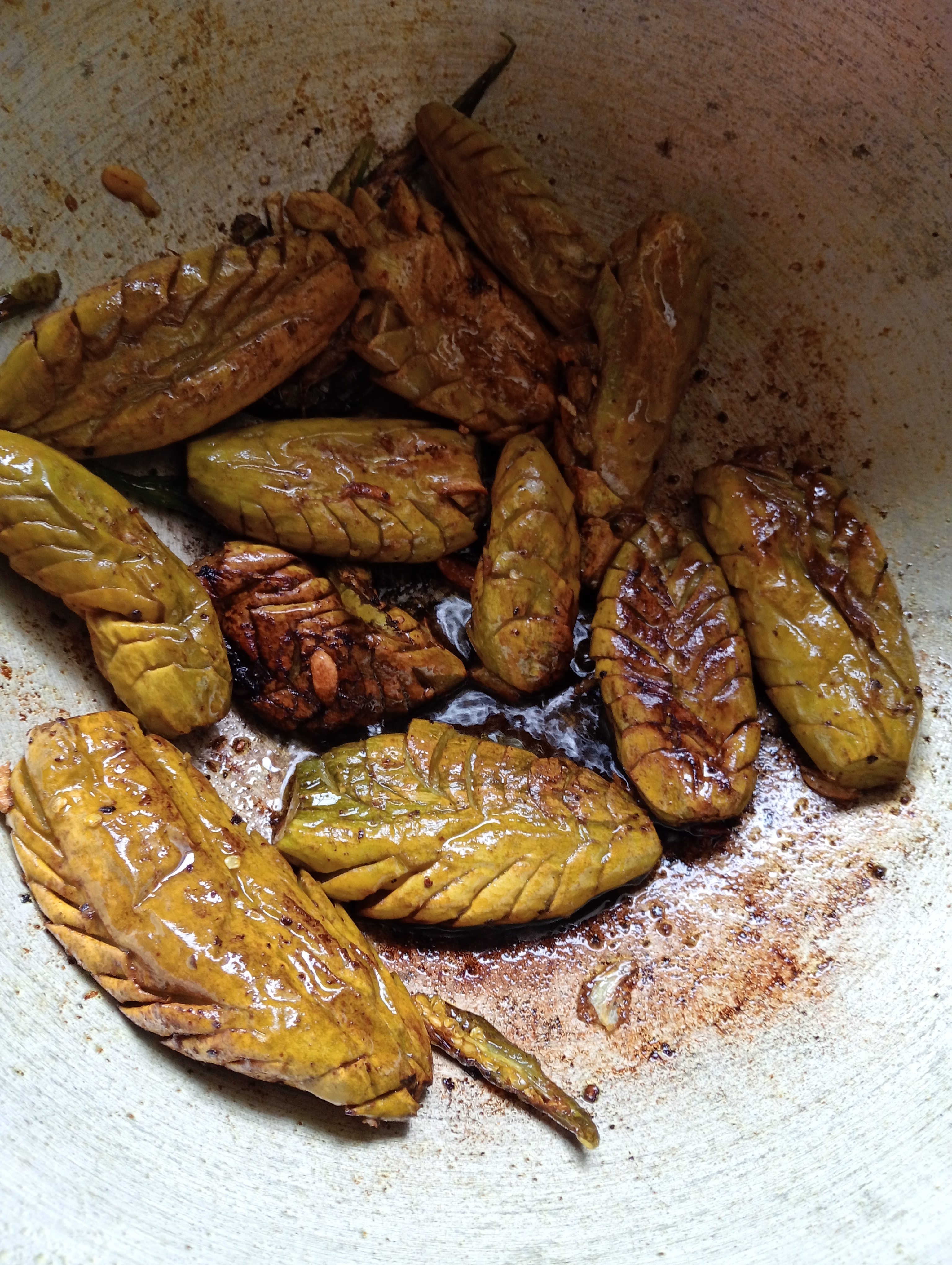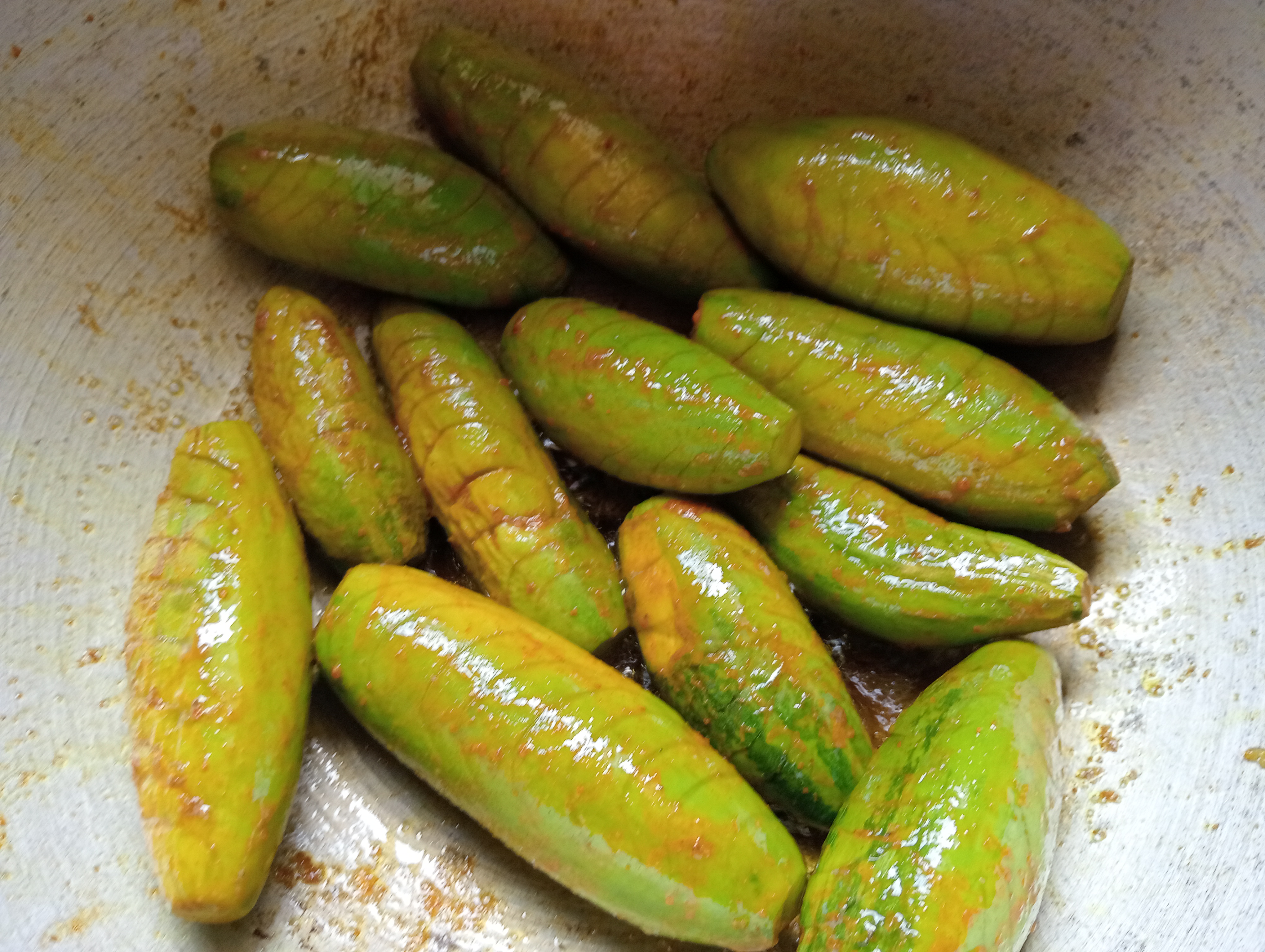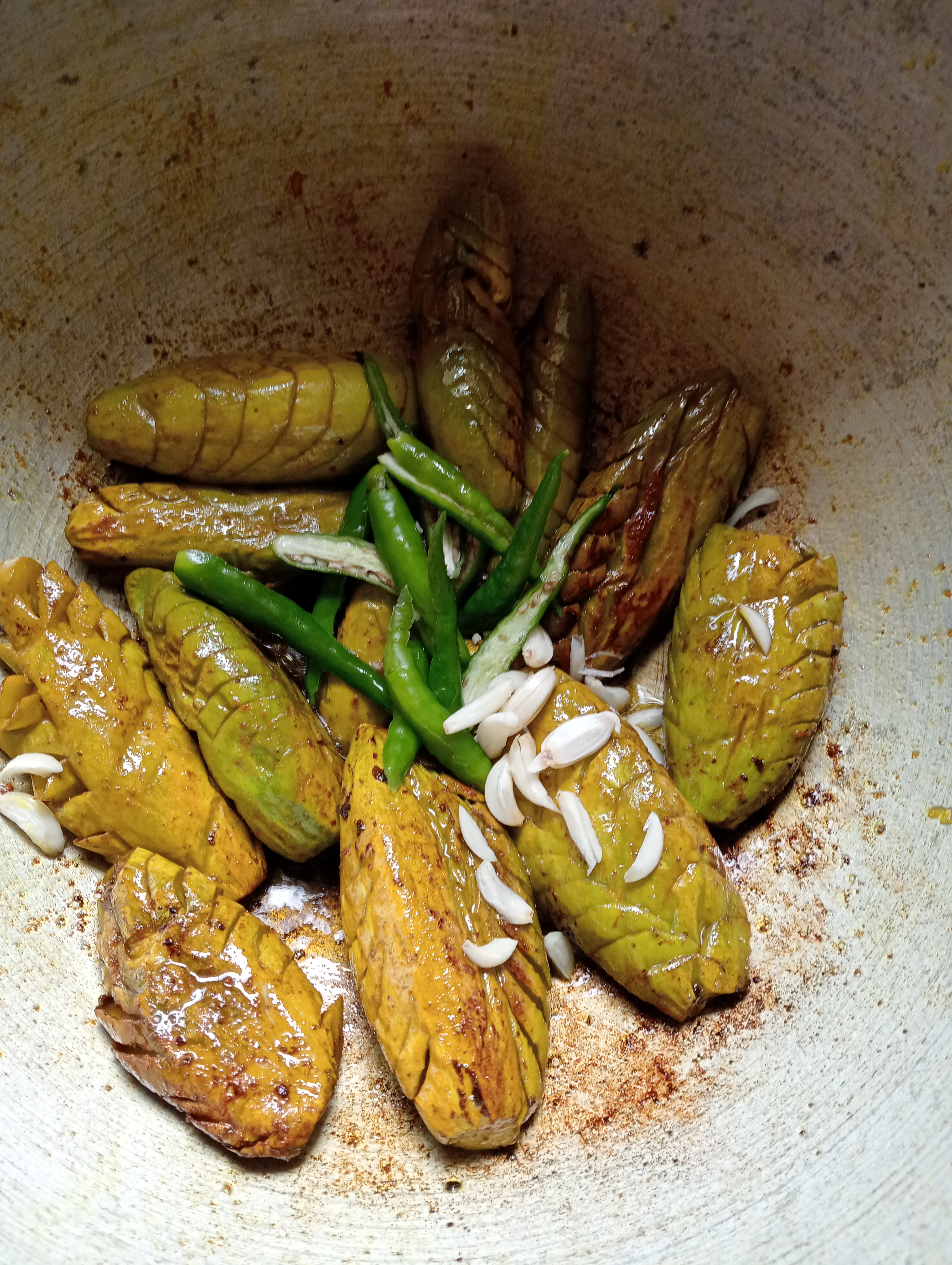 পটলগুলো ধুয়ে তিনি ভেবে বসে রইলেন—কী করলে পটলকে আরও মজাদার ও আকর্ষণীয় করা যায়? হঠাৎ তার মাথায় একটা নতুন আইডিয়া এল। তিনি পটলগুলোকে লম্বালম্বি কেটে, ভেতরের বীজ বের করে নিলেন। এরপর ভেতরে একটা বিশেষ মশলা মিশ্রণ ভরে দিলেন, যার মধ্যে ছিল কাঁচা মরিচ, আদা, রসুন, ধনেপাতা আর সামান্য সরিষার তেল।